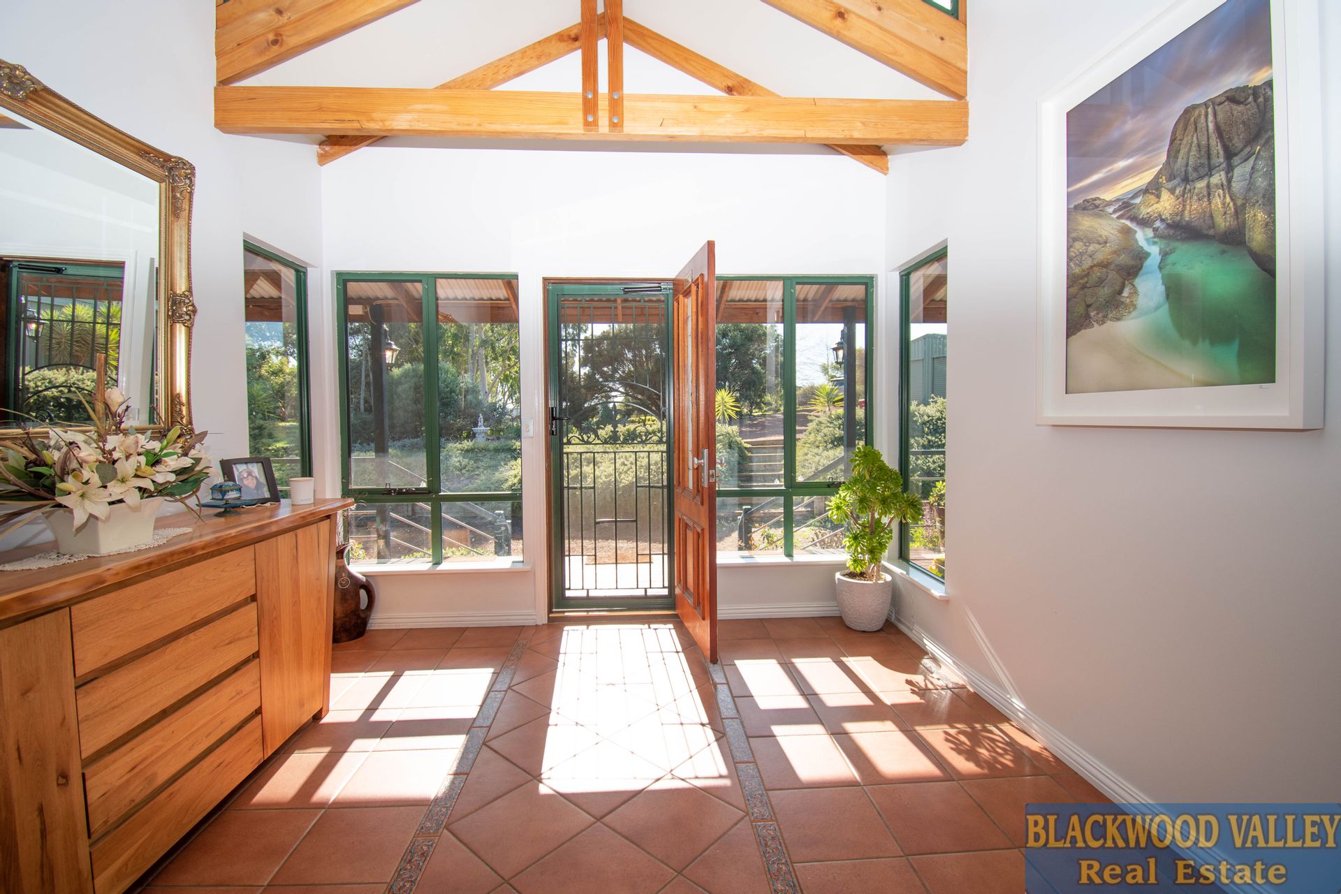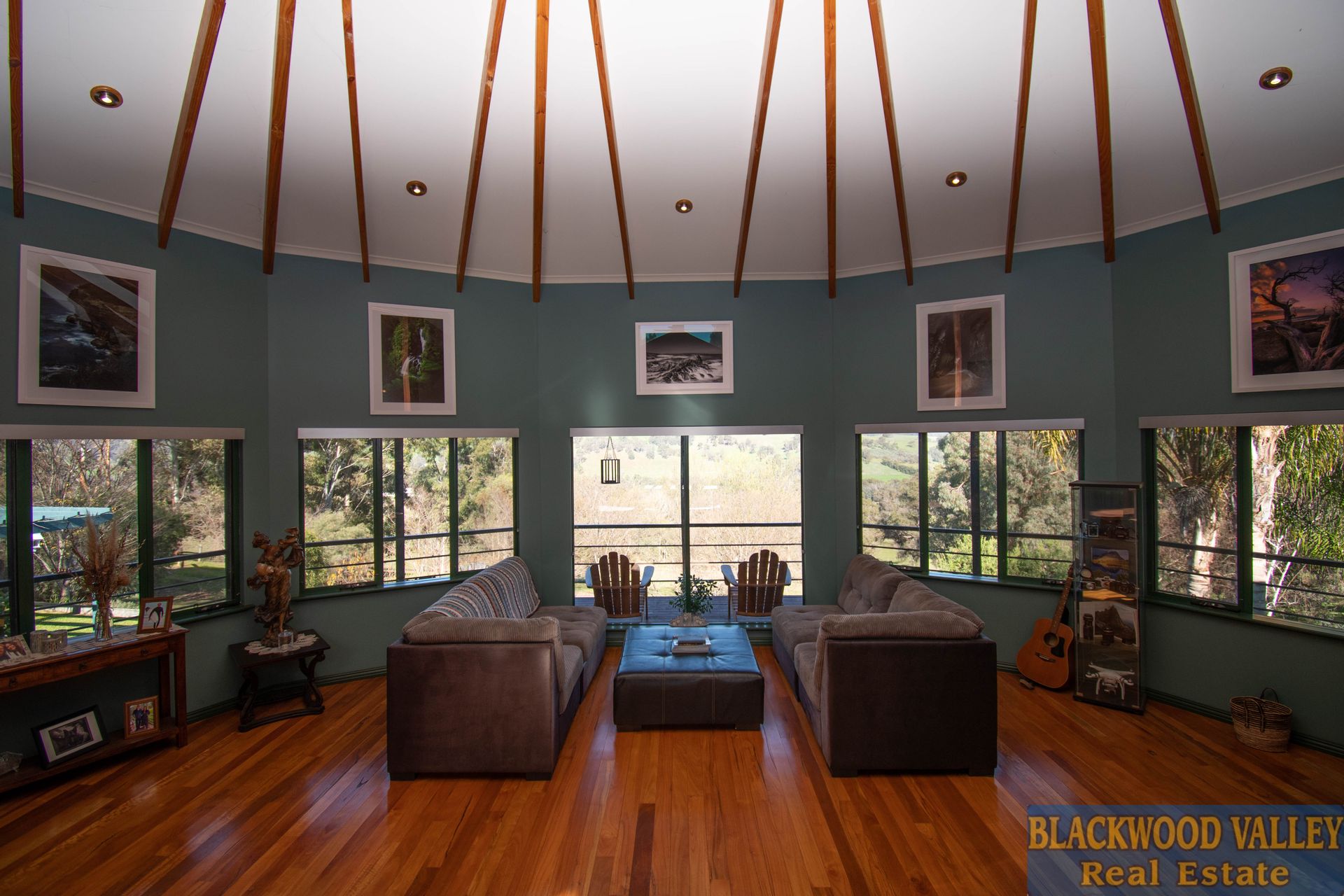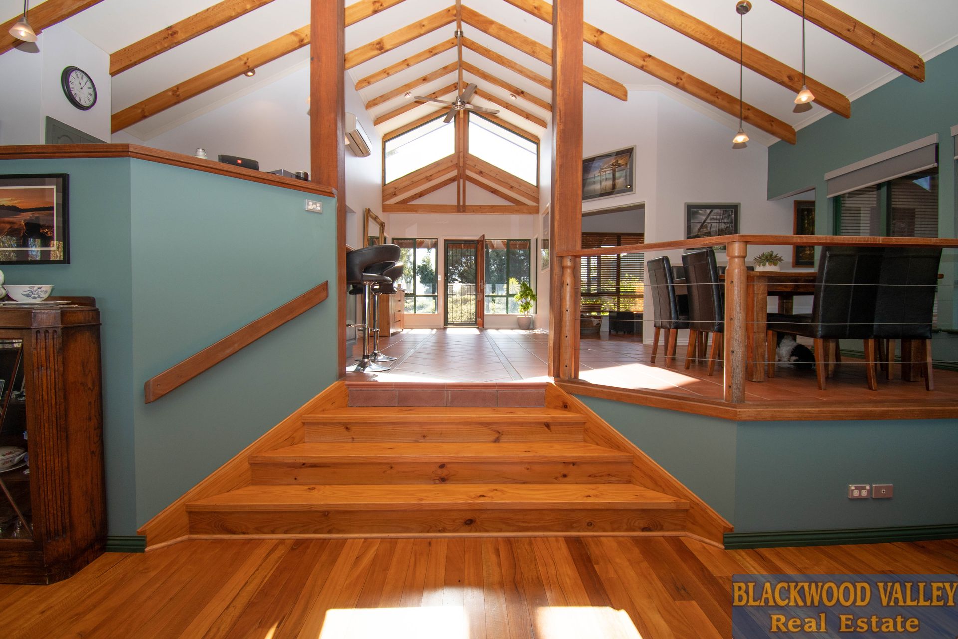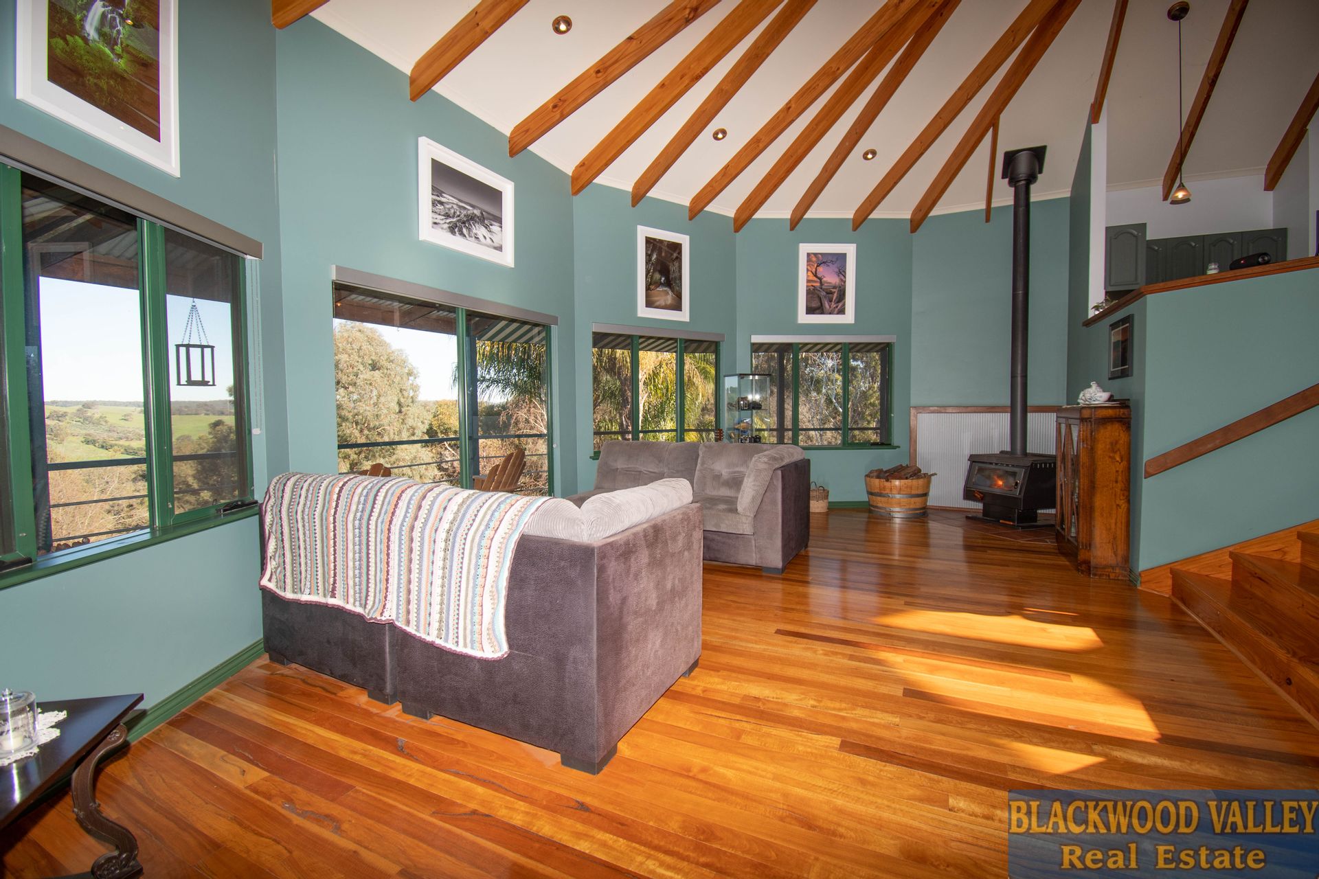 The home is set privately, and is located high on the block to appreciate the expansive rural views of the paddocks and the Blackwood River Valley beyond. Soaring cathedral style ceilings and huge bay windows in the central living area allows for lots of natural light. Warmth is derived from the Jarrahdale wood heater, and the massive timber columns originally sourced from the Fremantle Wool Stores add to the ambience. A lovely modern kitchen boasts quality appliances and a spacious walk-in pantry.