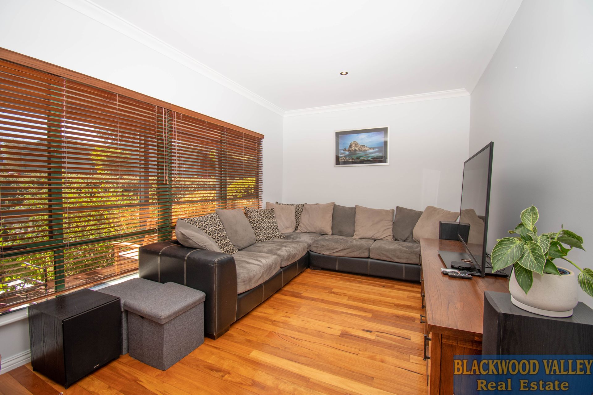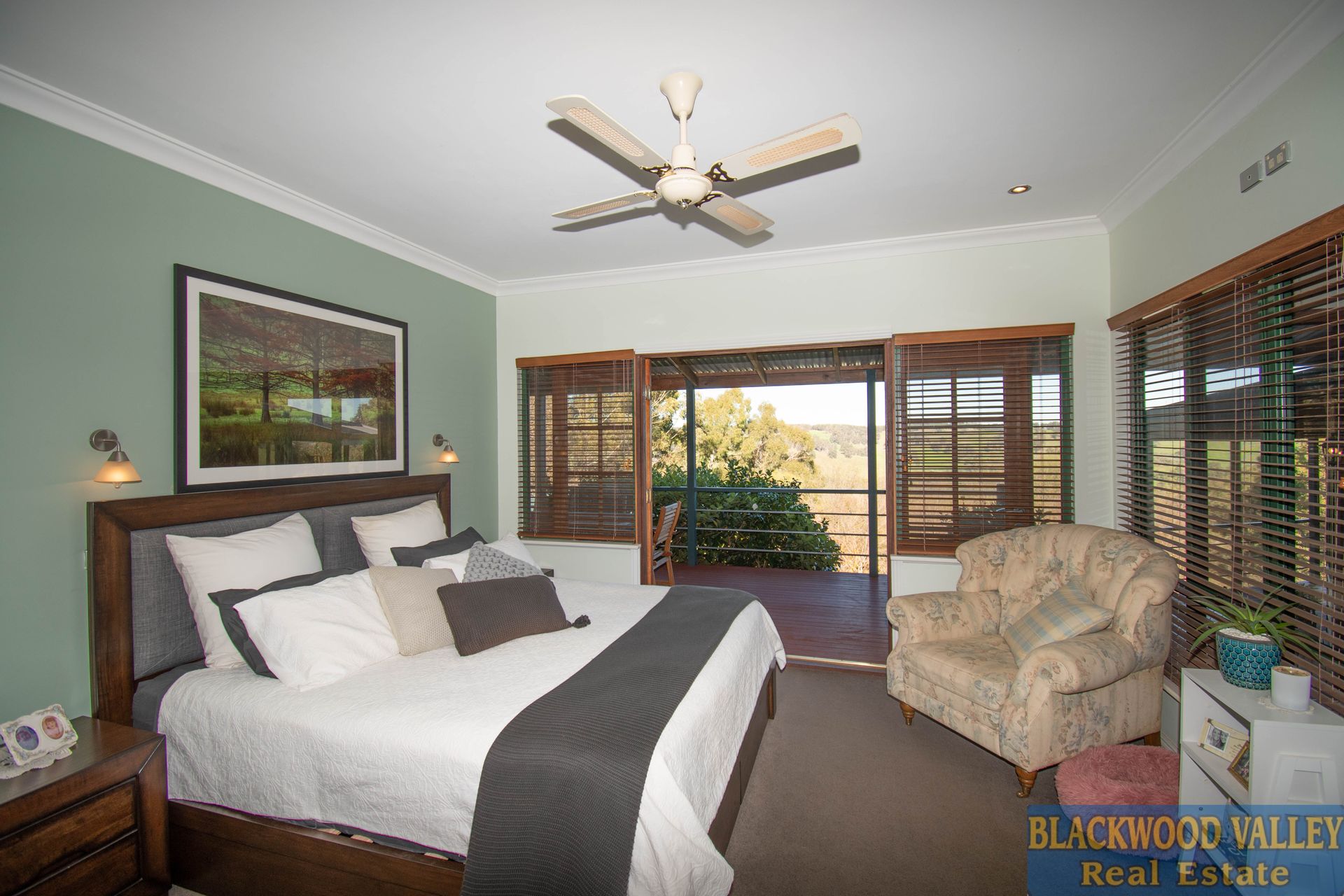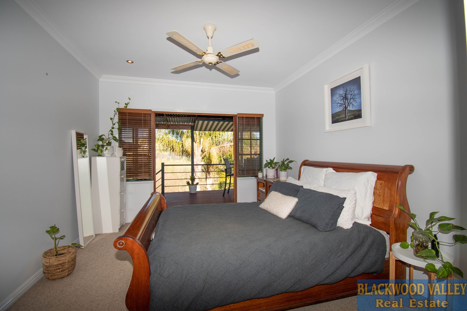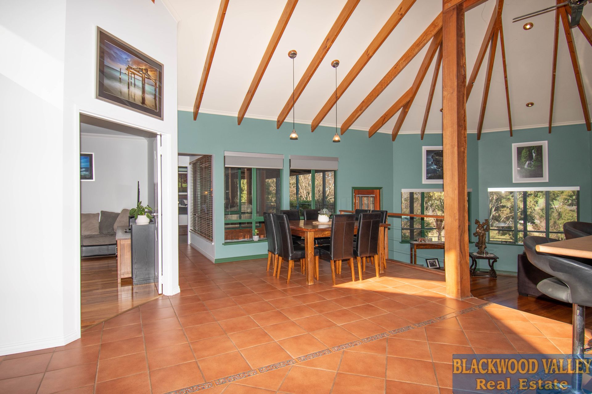 The home is set privately, and is located high on the block to appreciate the expansive rural views of the paddocks and the Blackwood River Valley beyond. Soaring cathedral style ceilings and huge bay windows in the central living area allows for lots of natural light. Warmth is derived from the Jarrahdale wood heater, and the massive timber columns originally sourced from the Fremantle Wool Stores add to the ambience. A lovely modern kitchen boasts quality appliances and a spacious walk-in pantry.