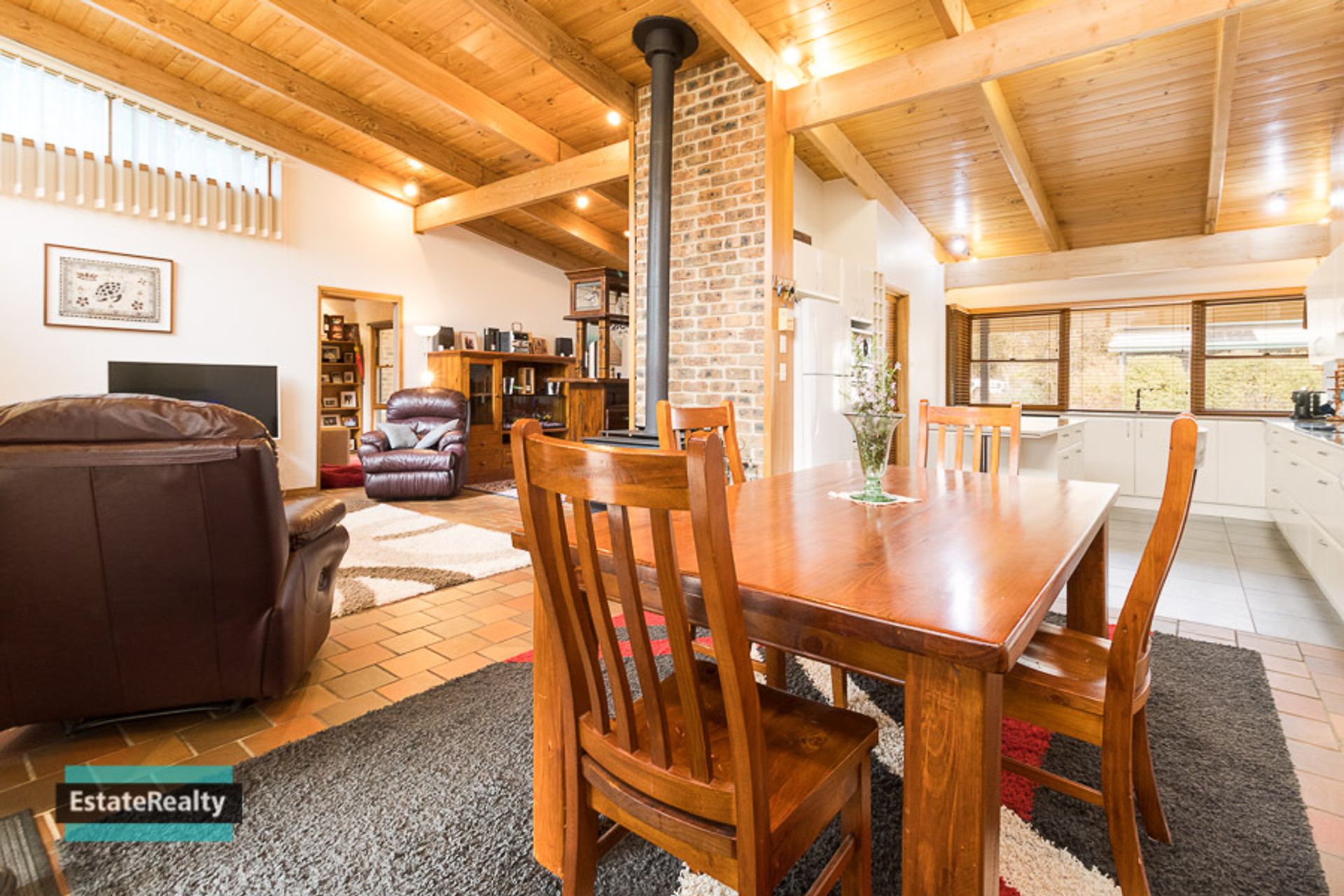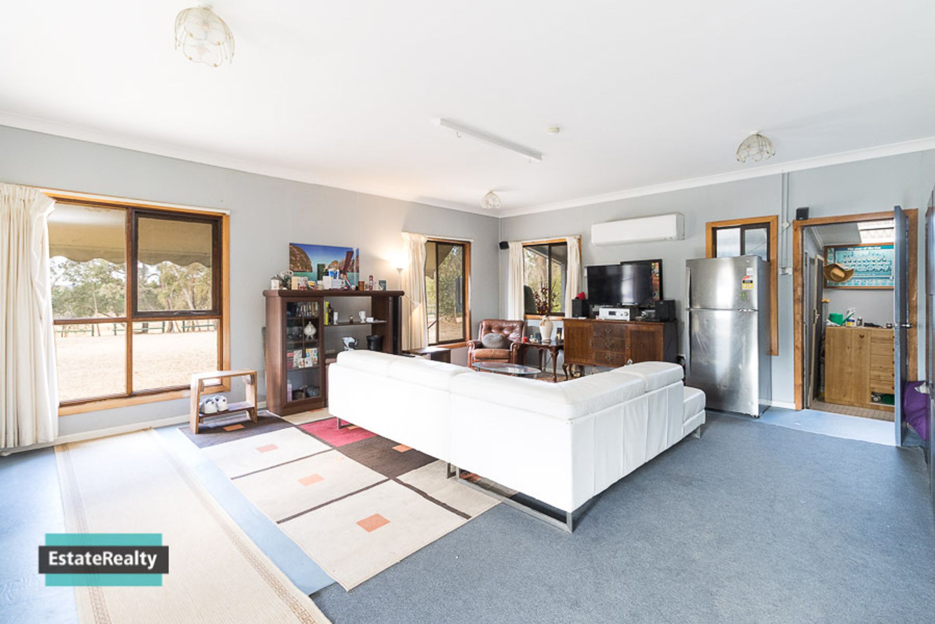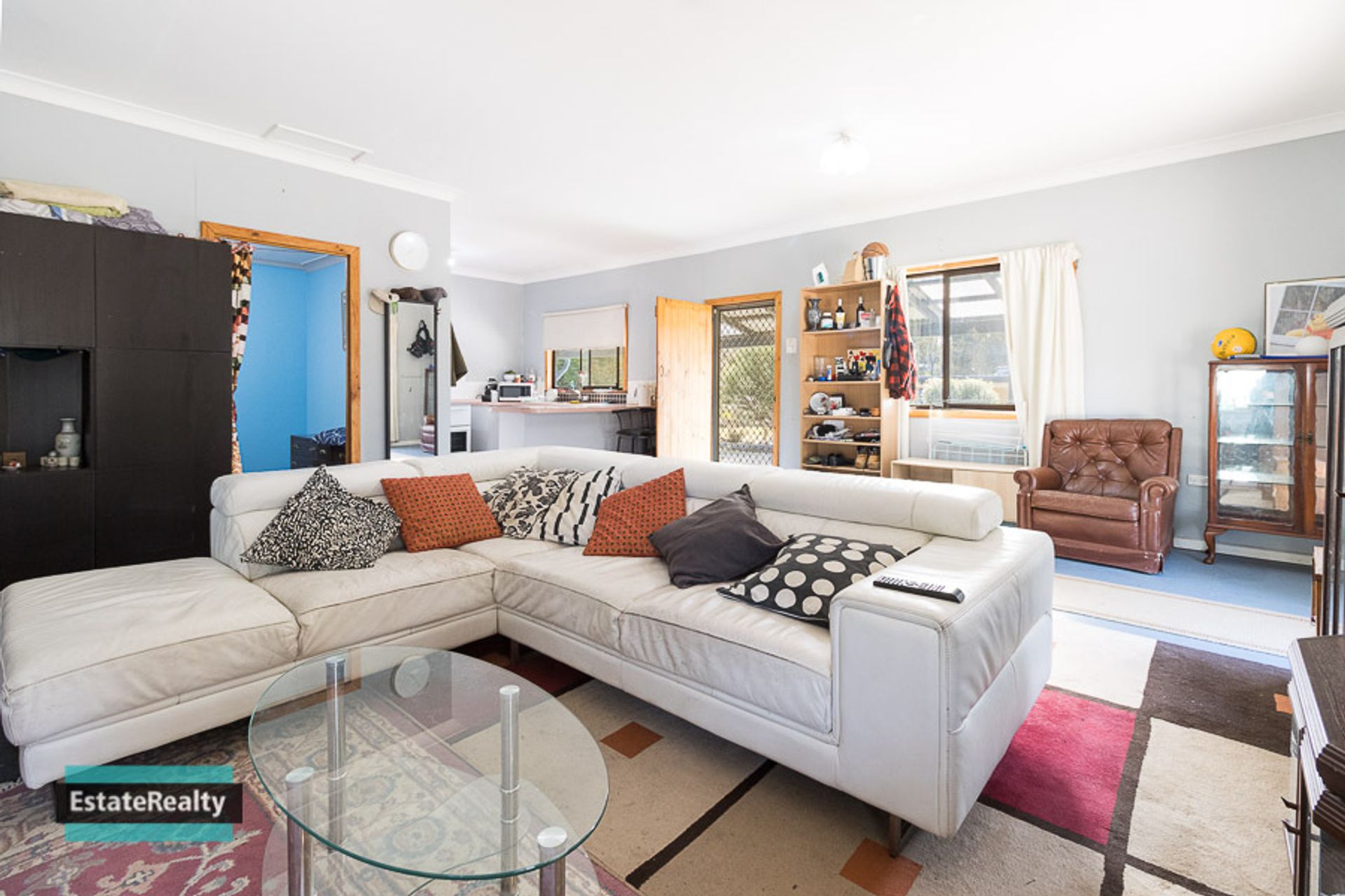 The living area looks over a level and enclosed backyard making it a safe space for kids to play and protected gardens for the pets.