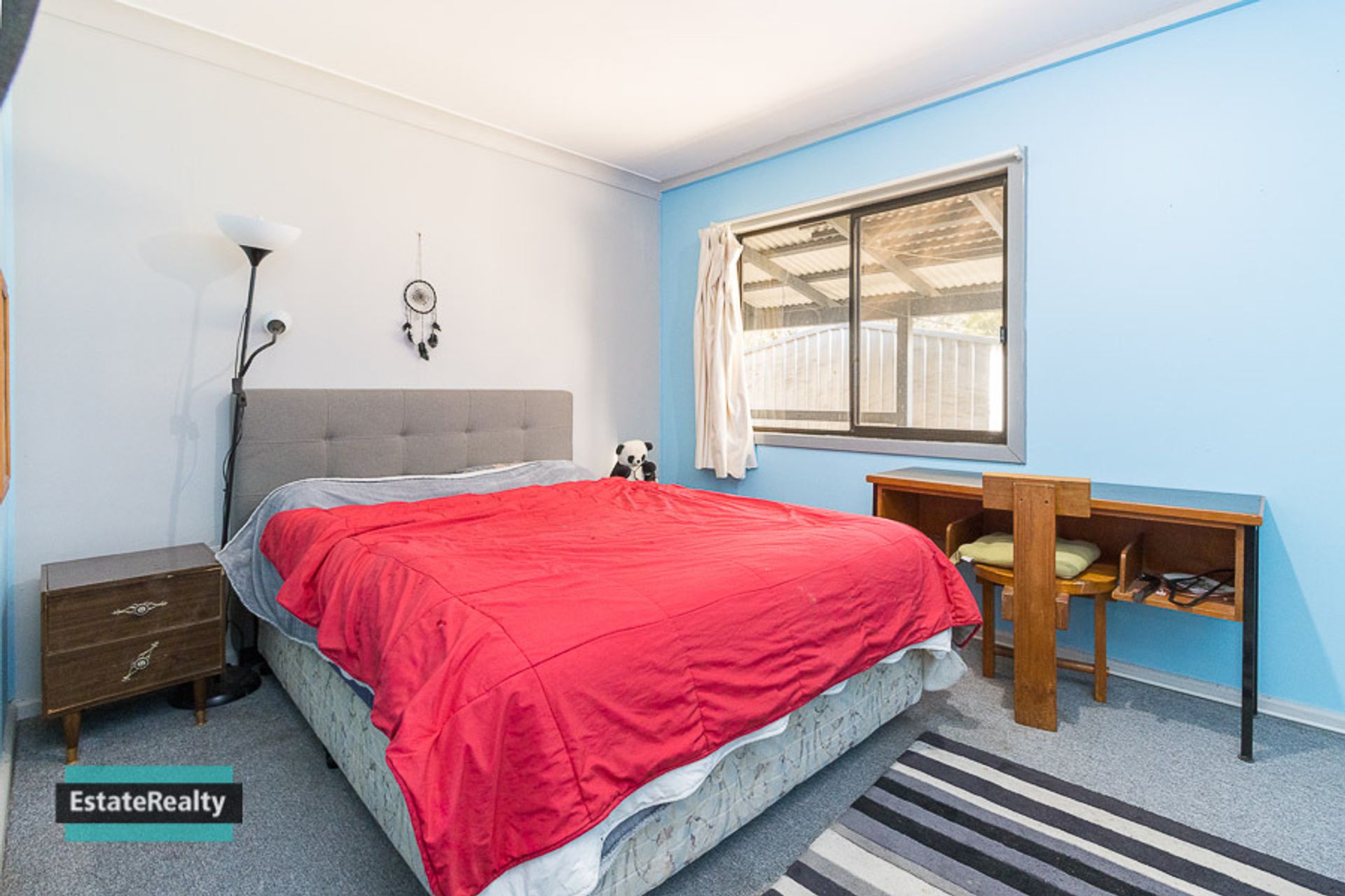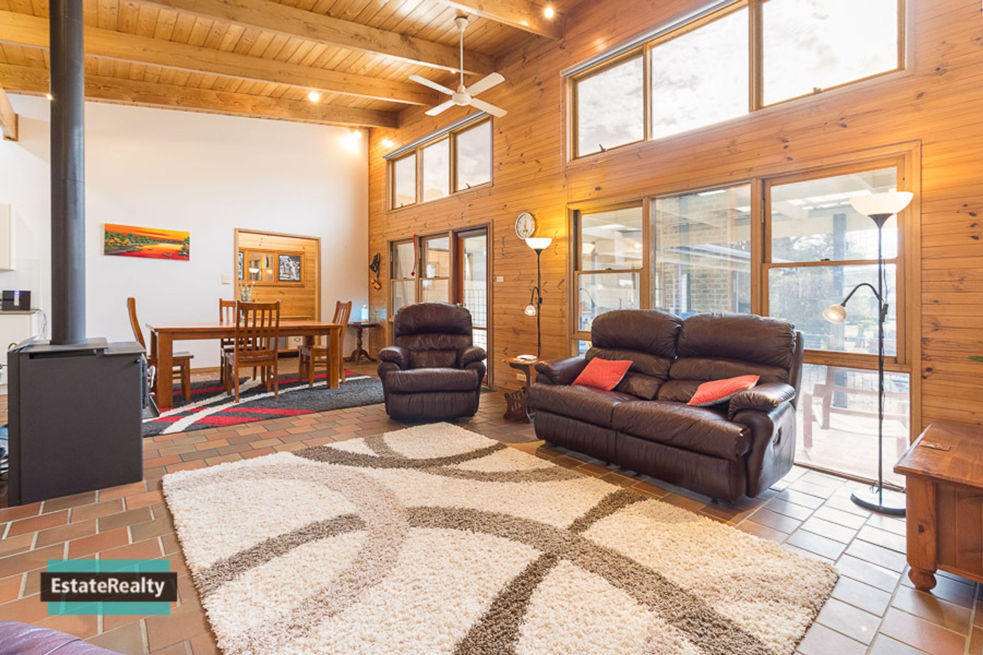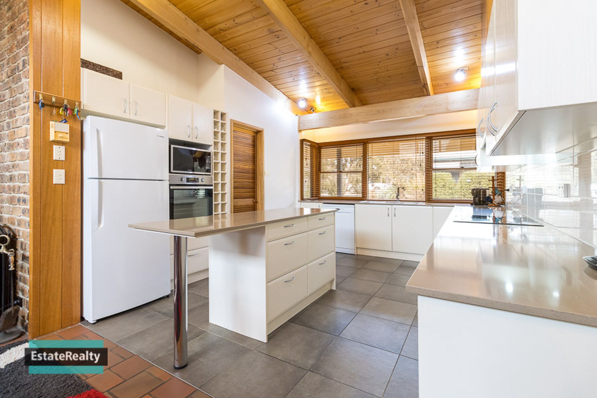 The living area looks over a level and enclosed backyard making it a safe space for kids to play and protected gardens for the pets.