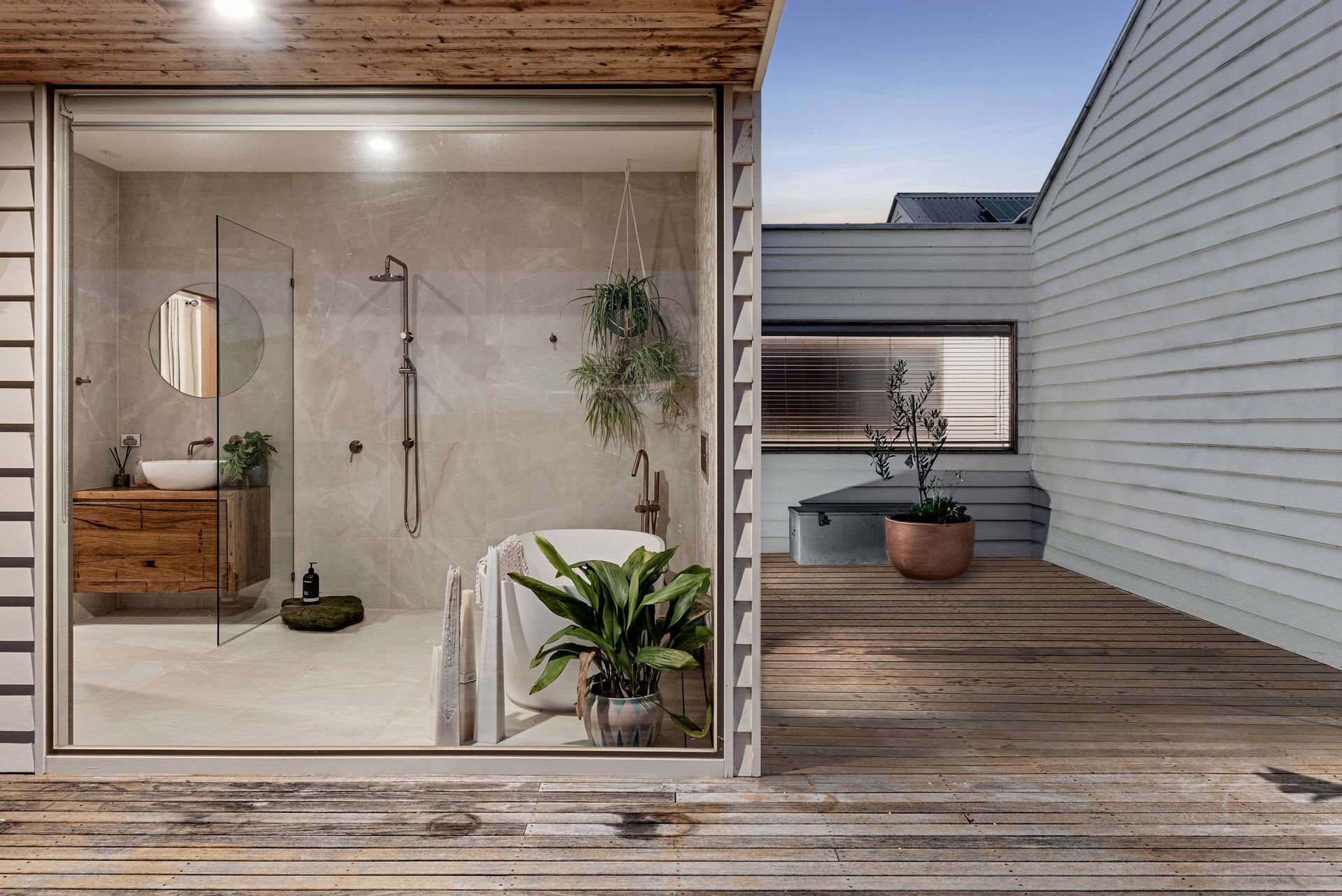 Main bathroom- large shower, oversized vanity with ample storage, wooden bench, mirror with feature lights, heat wall mounted towel rail, separate toilet, & additional room with laundry trough with sliding door
