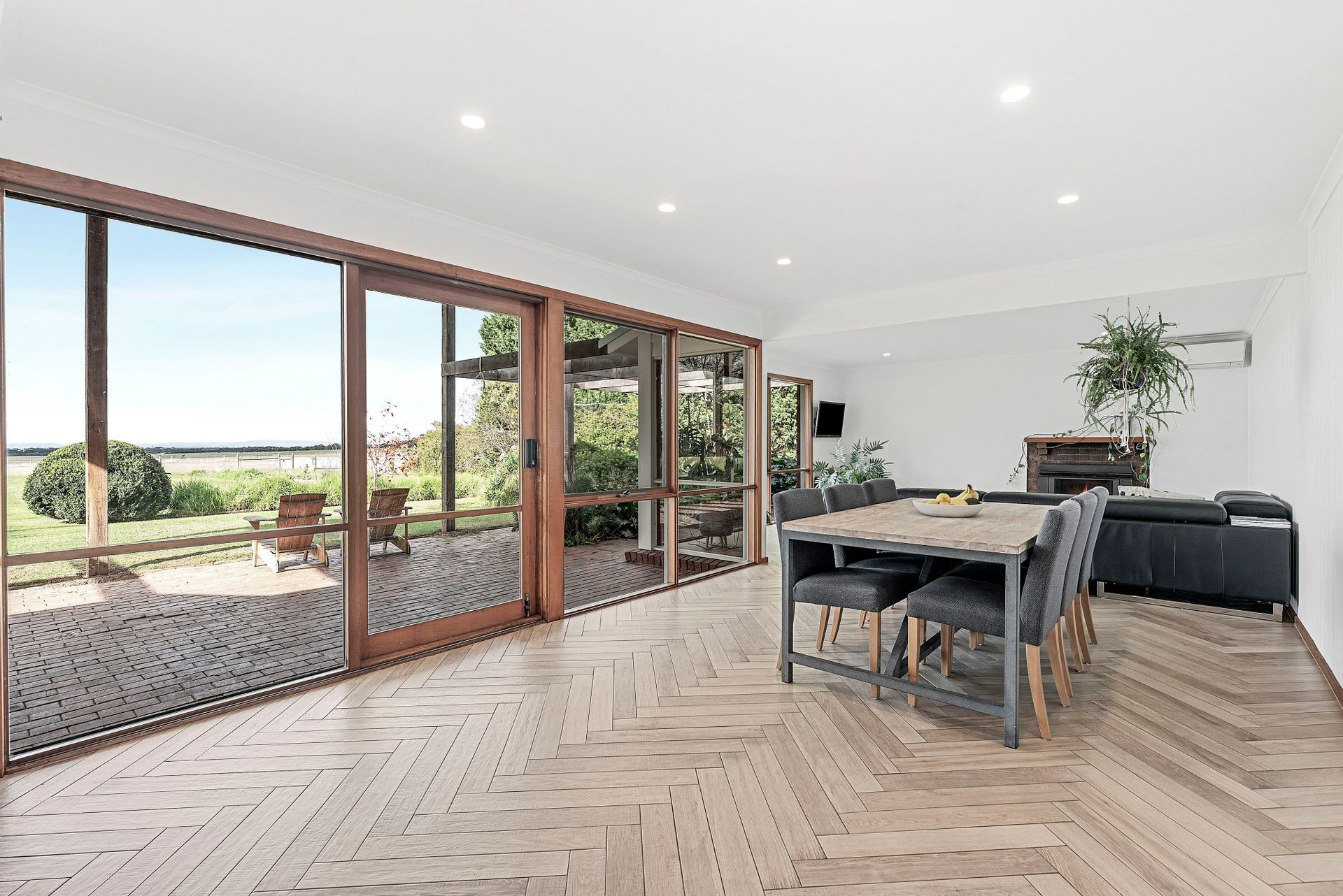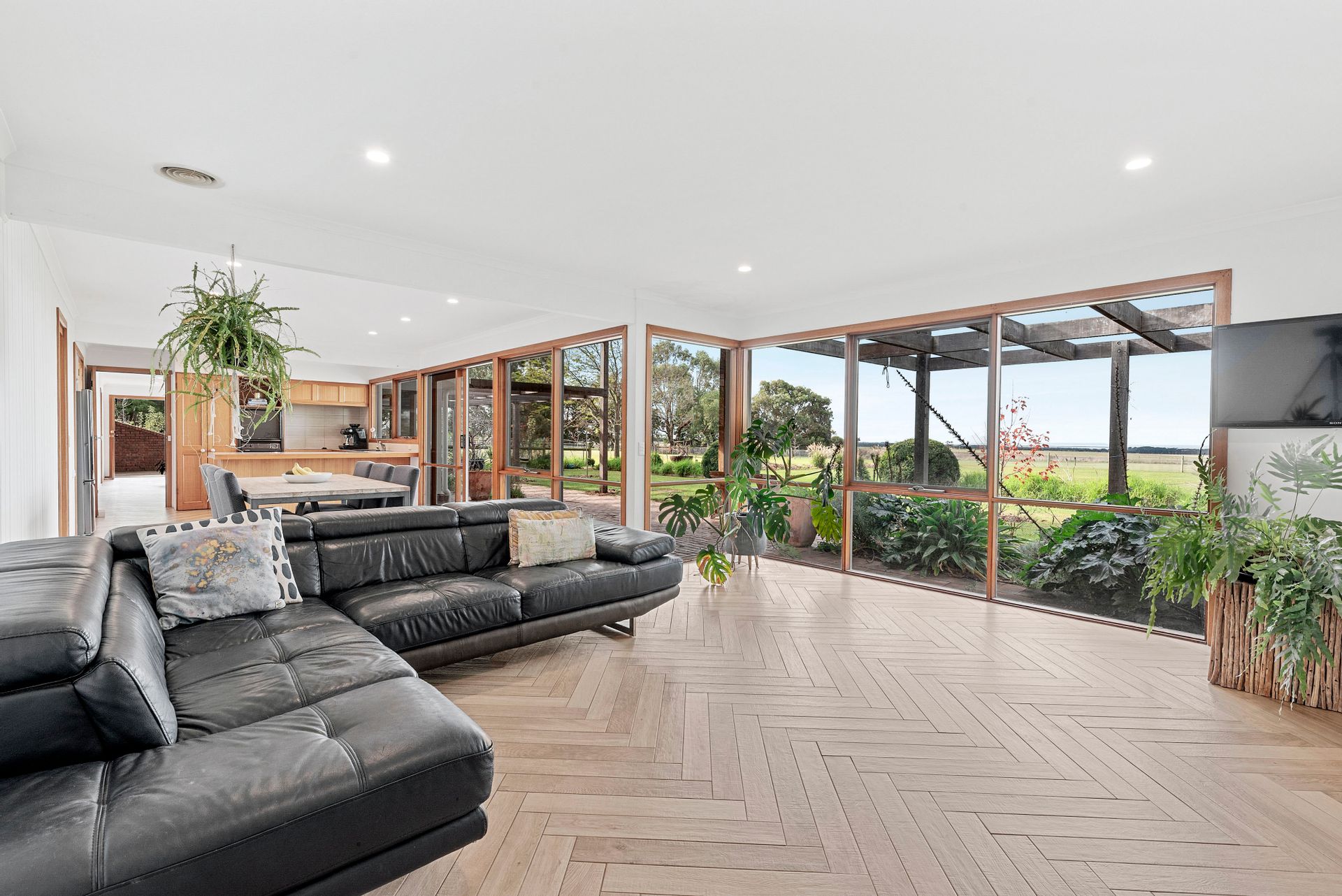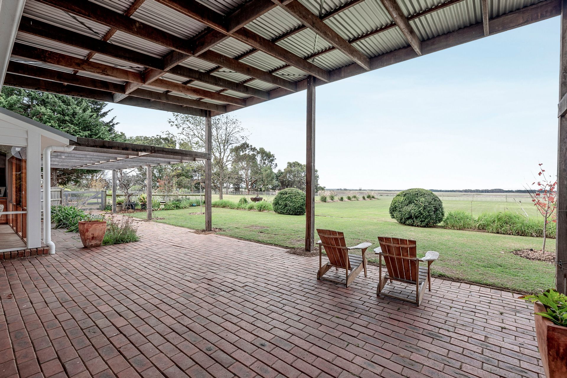 A sophisticated light interior colour pallet with Italian imported herringbone floor tiles radiate countryside chic in the lounge/living zone and provide an enviable space for those who love to entertain while looking out through opulent plantings and beyond to captivating water views. Large window doors canopied by exuberant ornamental grapes and wisteria open out onto a substantial forest redgum pergola and entertaining area.