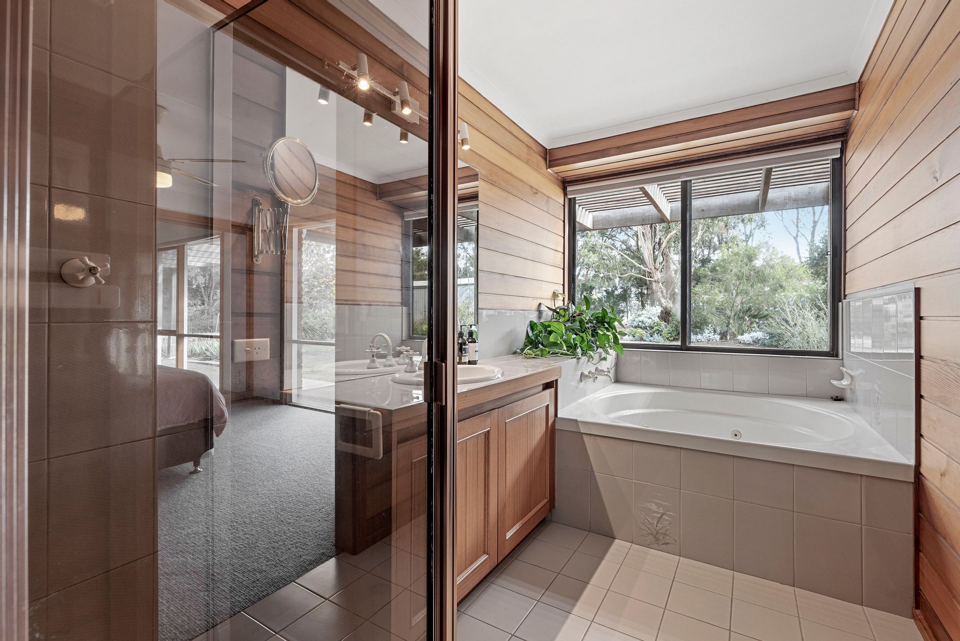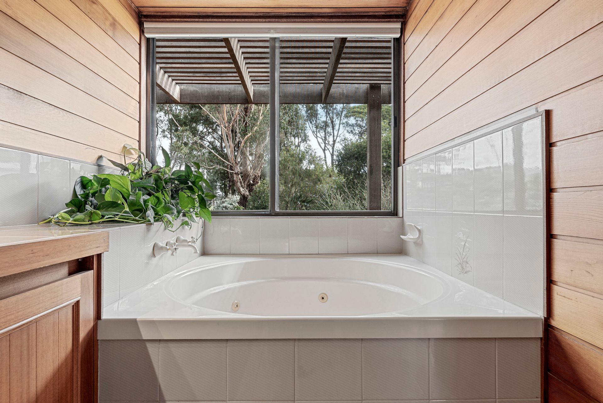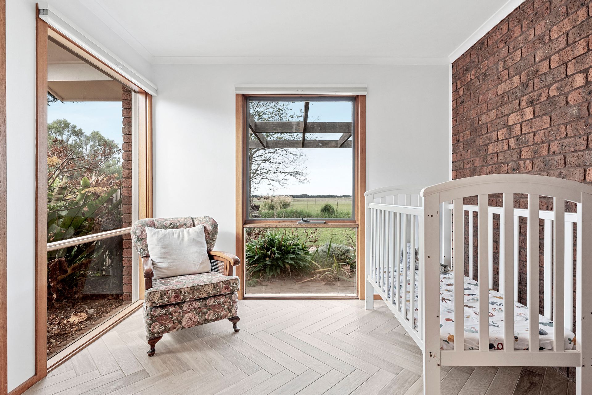 A sophisticated light interior colour pallet with Italian imported herringbone floor tiles radiate countryside chic in the lounge/living zone and provide an enviable space for those who love to entertain while looking out through opulent plantings and beyond to captivating water views. Large window doors canopied by exuberant ornamental grapes and wisteria open out onto a substantial forest redgum pergola and entertaining area.