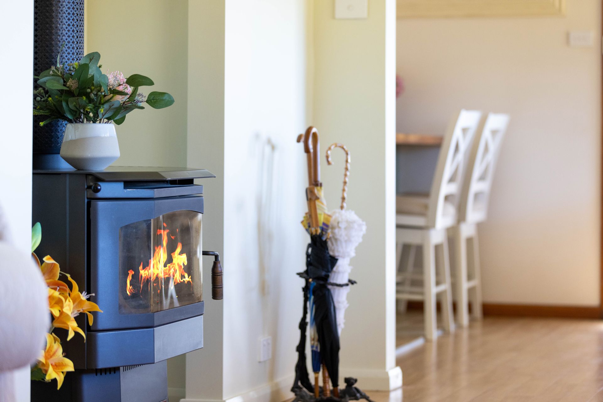 • Year-round comfort with underfloor heating in the kitchen and butler's pantry, split system A/C in the kitchen and main bedroom and slow combustion fire in the living area