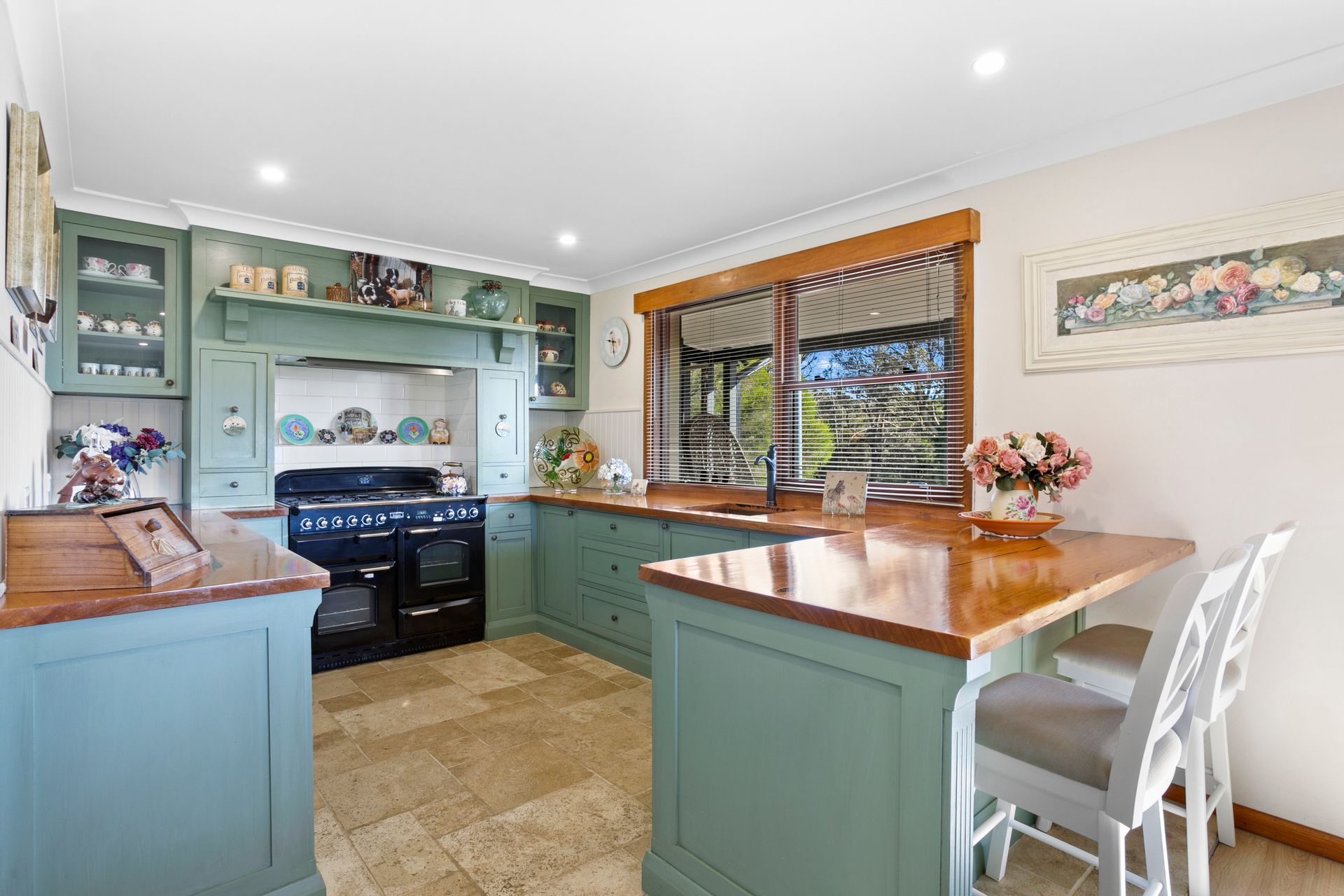 • Open country style kitchen with freestanding Falcon Classic 110 oven, gas cooktop, timber benchtops and Miele dishwasher