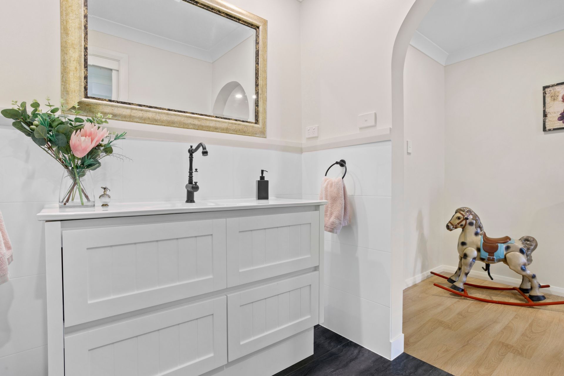 The main residence offers a sunny open plan layout with a large main bedroom complete with generous walk-in robe and second bedroom with built-in robe. The kitchen exudes true country ambience and is equipped with a freestanding Falcon Classic oven and cooktop and large butler's pantry perfect for food preparation and all your storage needs. Whilst the covered wrap around verandah is a beautiful space to sit in the sun and admire the sprawling fields and manicured gardens.