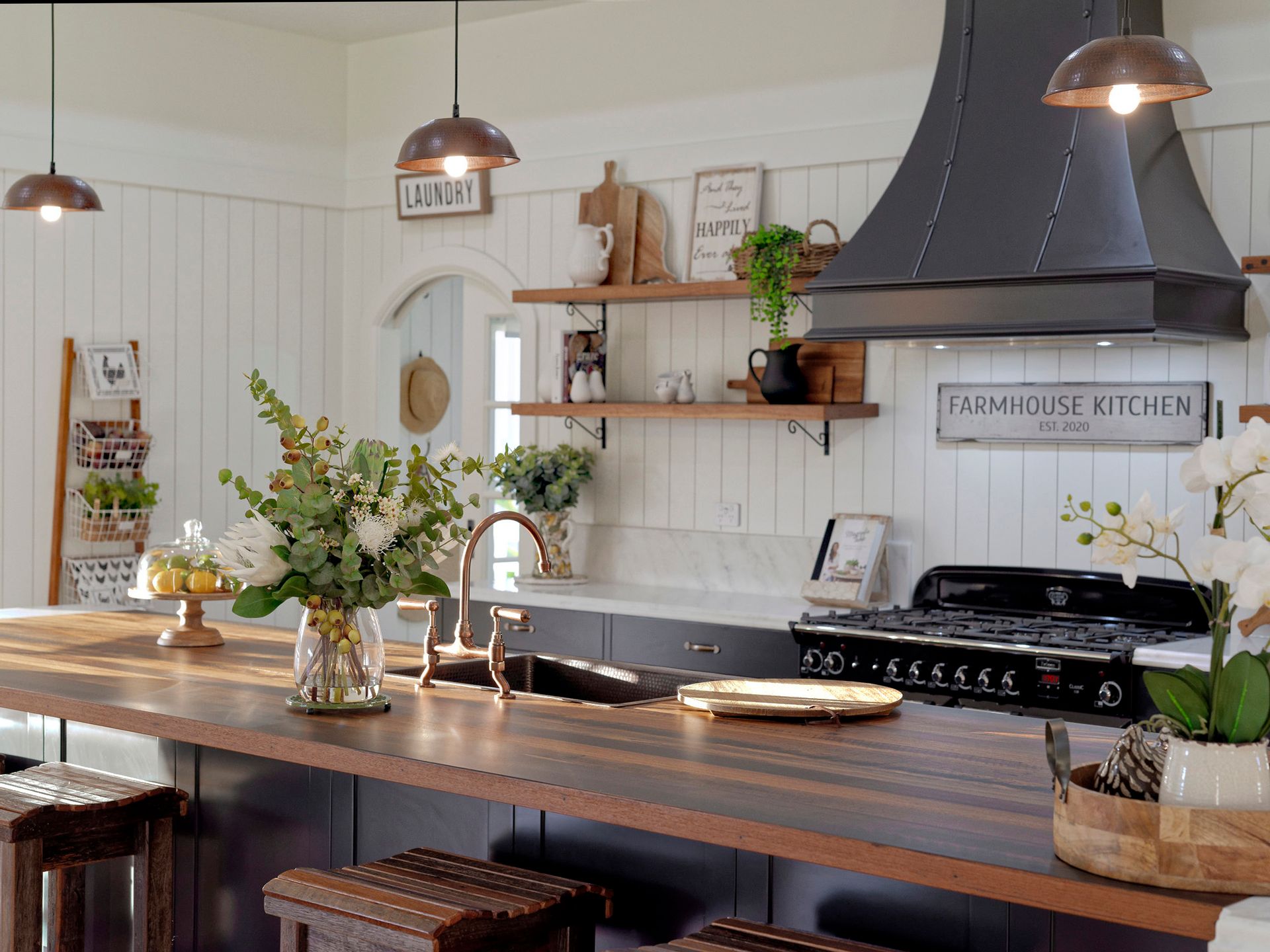 The kitchen is just incredible, winner of best kitchen in Queensland Master Builders awards of the year 2021, it features solid recycled hardwood bench top, copper sink and tapware, one off custom exhaust canopy range hood over the free-standing country style, top of the range gas cook top and electric ovens. Solid surface bench tops, 2 pack custom cabinetry with soft close draws, integrated dishwasher and microwave convection oven, the list goes on. Additional full butlers' kitchen with solid surface bench tops and more.