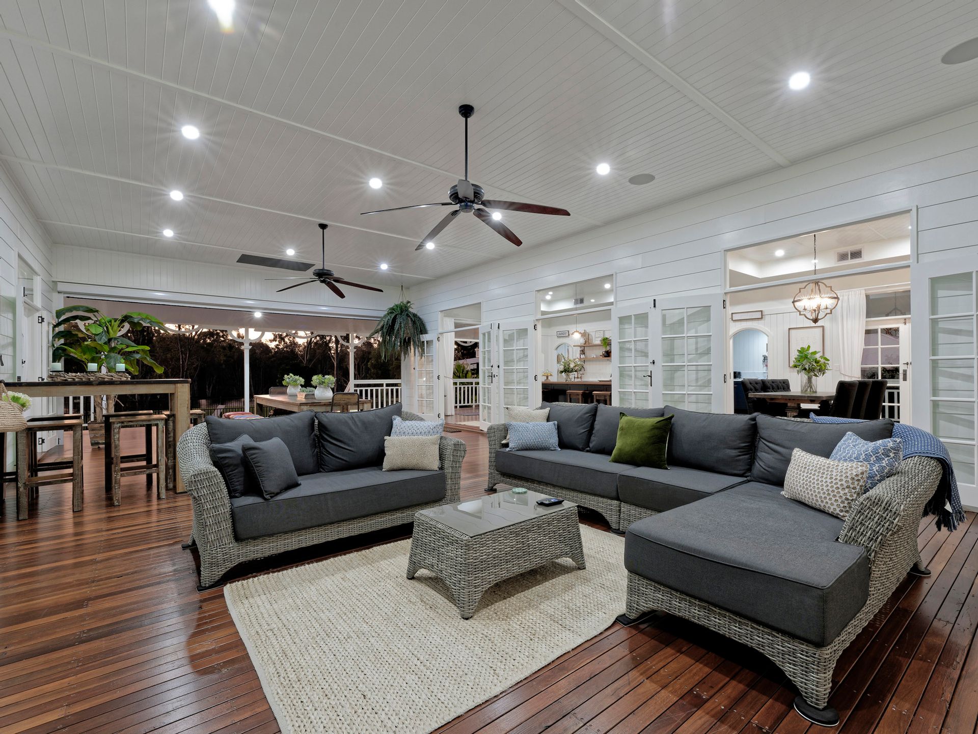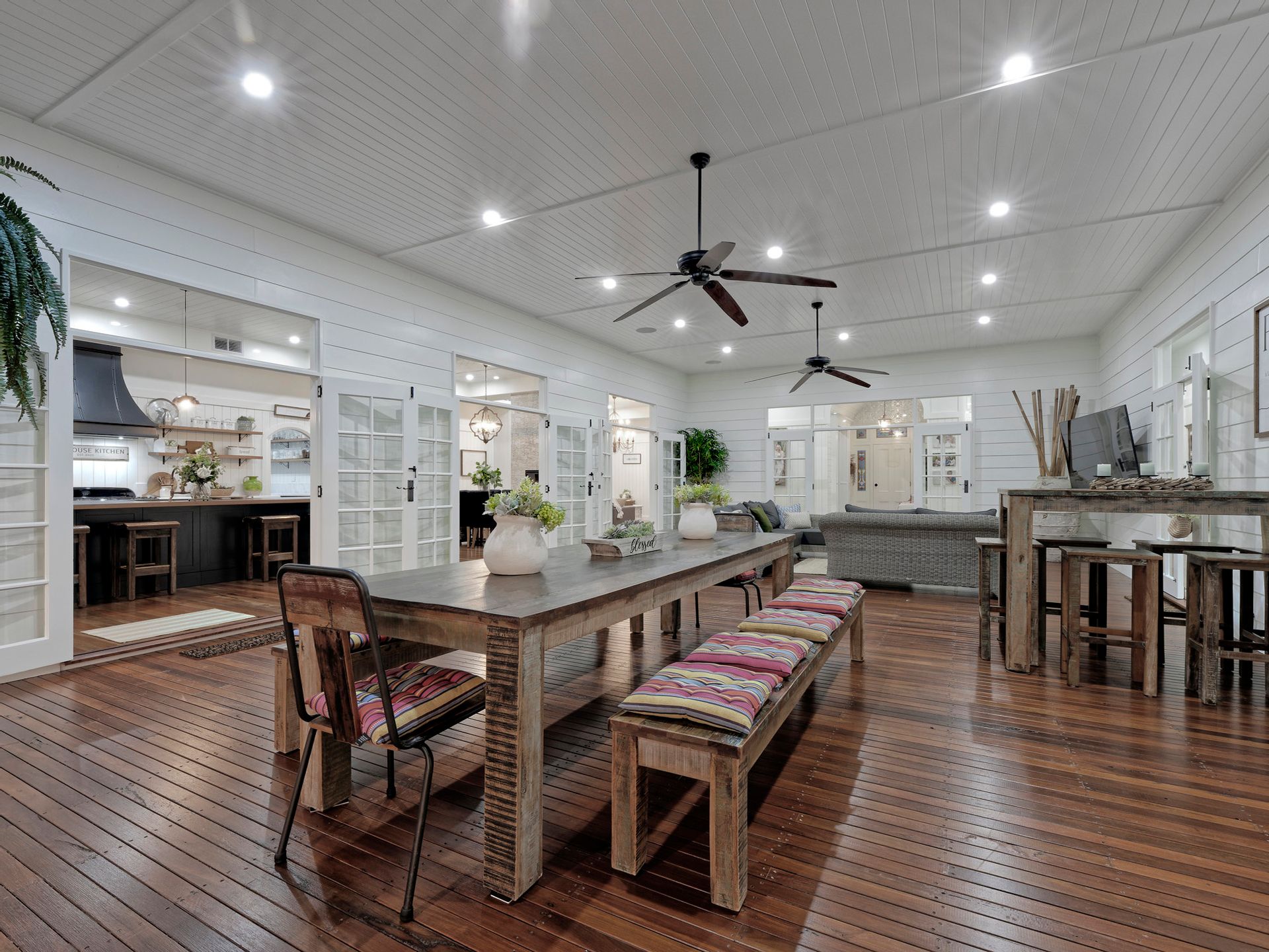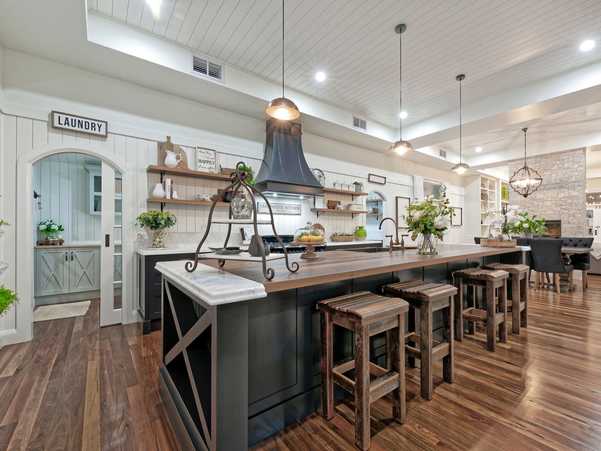 The formal lounge and dining has such a warm and homely feel with its two stone tiled fireplaces, American farmhouse custom cabinetry, the hardwood flooring, V-Jay walls, and ceilings all come together beautifully.