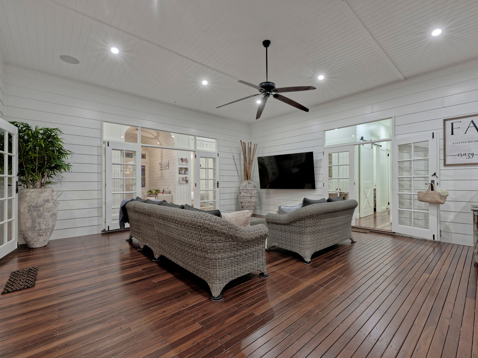 Beautiful full-length front and rear verandas that all 4 bedrooms and the office open out to via double multi light French doors. The master bedroom offers a large walk-in robe with floor to ceiling custom made joinery and enormous amount of full extension soft close drawers and pull-down hanging rods. Bedrooms 2, 3 and 4 all offer floor to ceiling wardrobes and soft close drawers. A dedicated office with floor to ceiling custom joinery and glass fronts.