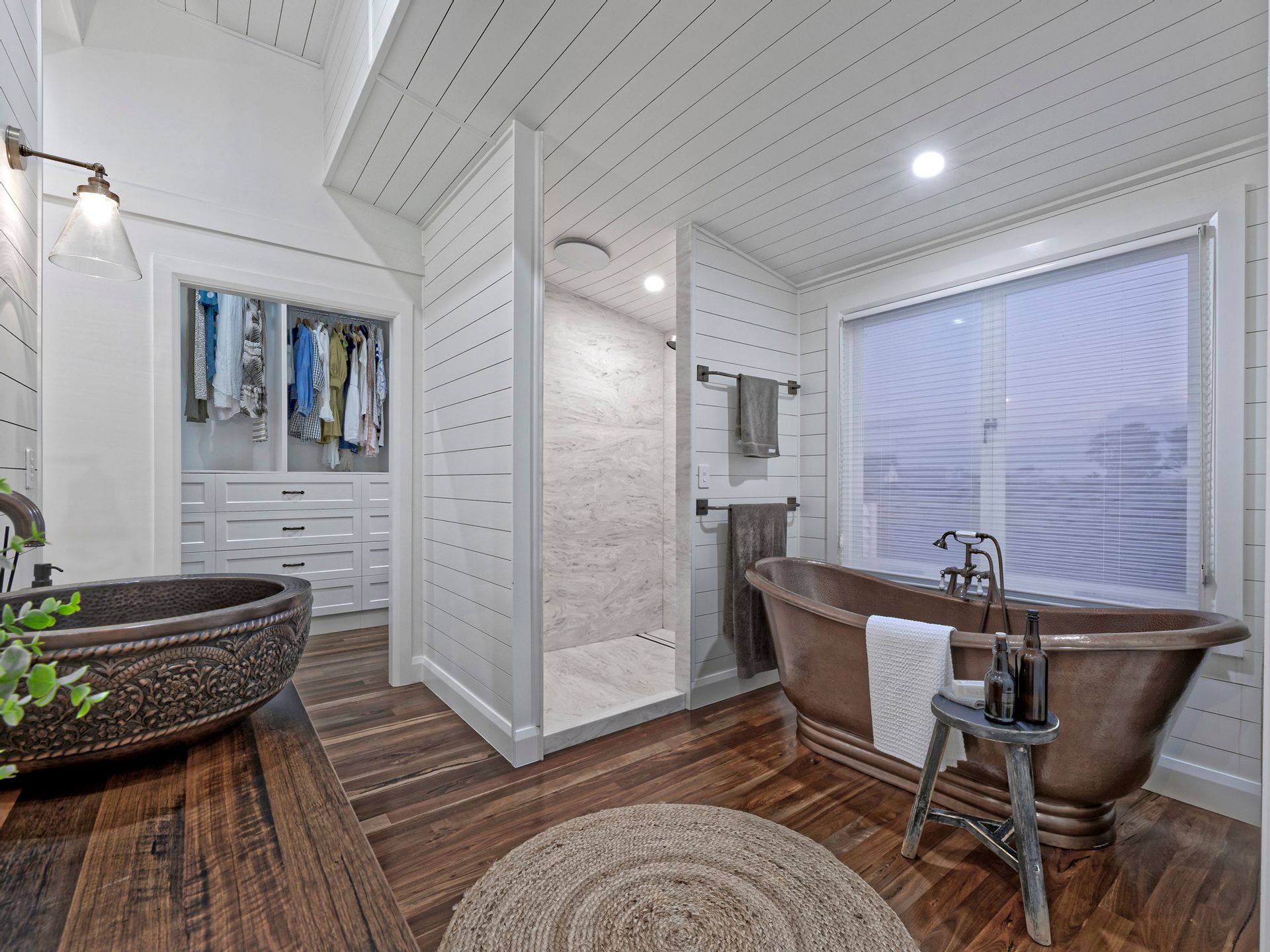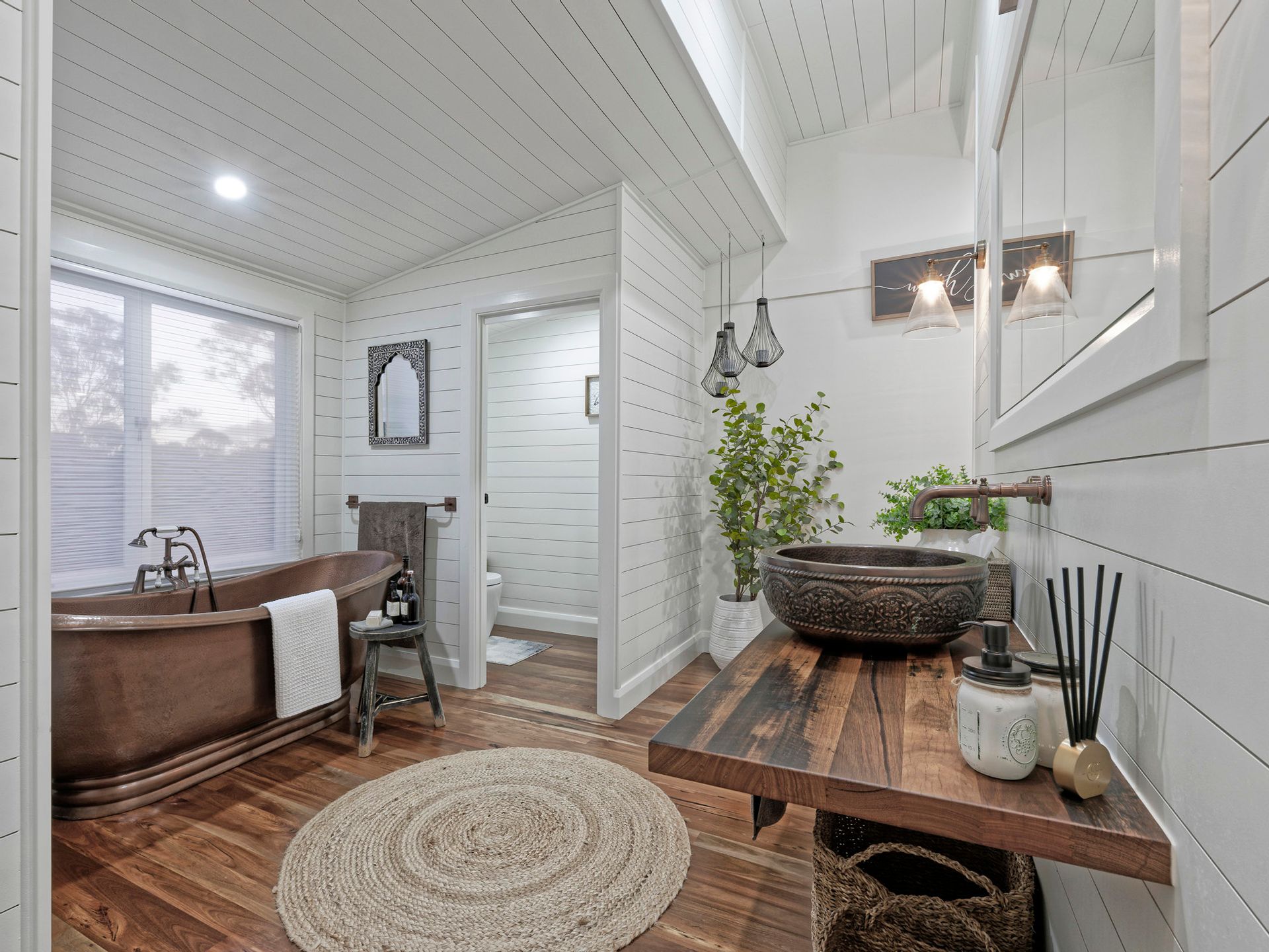 The kitchen and scullery sinks, the ensuite sink, the big deep bath in the ensuite are all antique style, handmade hammered solid copper. The tap ware through-out the home, the shower roses, the towel rails, toilet roll holders and even some of the pendant light fittings are all antique style solid copper. Both showers are all solid piece Corian with no grout to clean. The main bathroom offers a marble basin and the laundry tub is farmhouse porcelain.