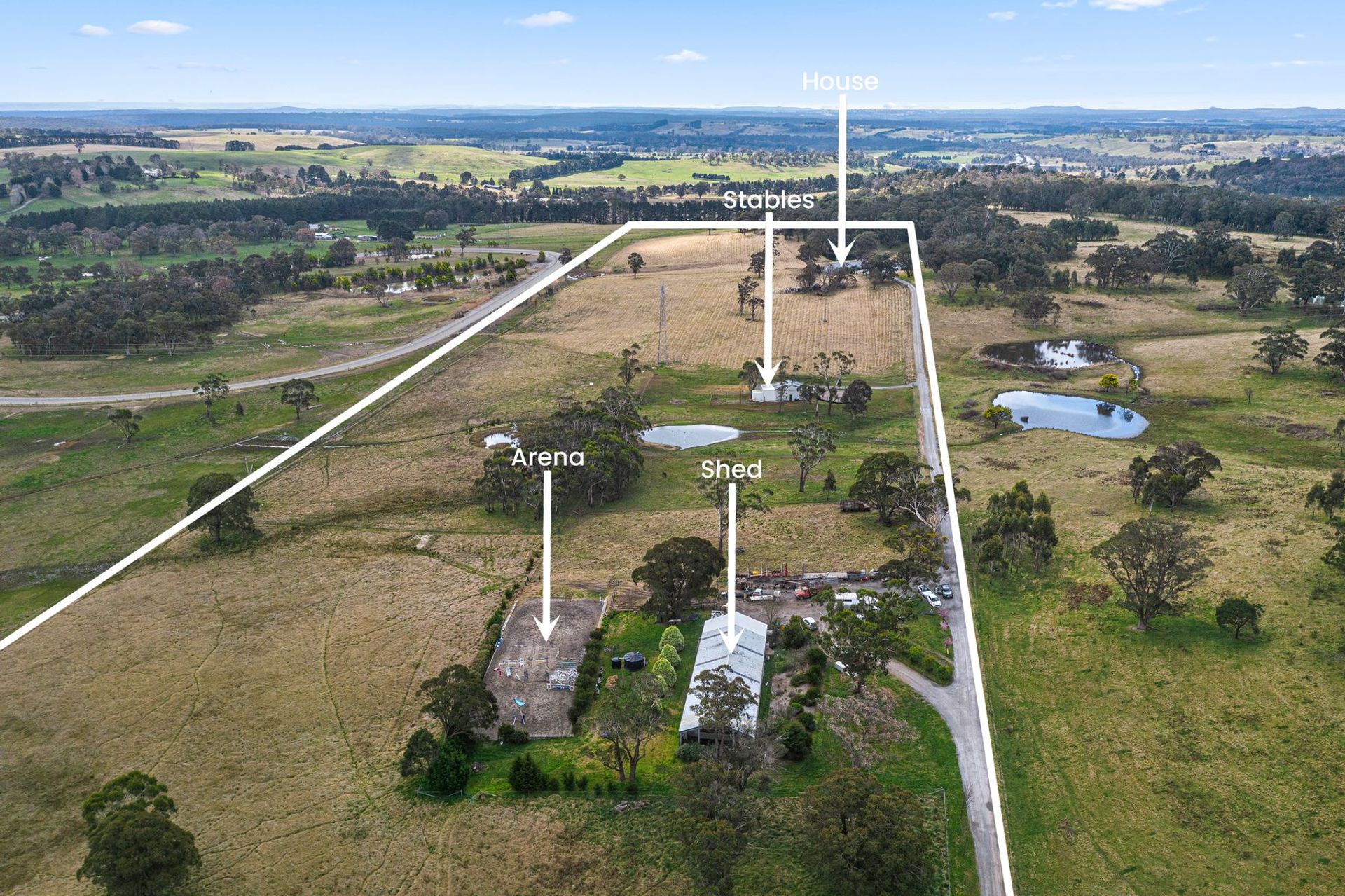 • Off-grid stables include hot/cold wash bay, 2 stable boxes, tack room, dressage arena, 16m round yard, day yard, float/truck shelter and adjoining carport (solar & battery)
