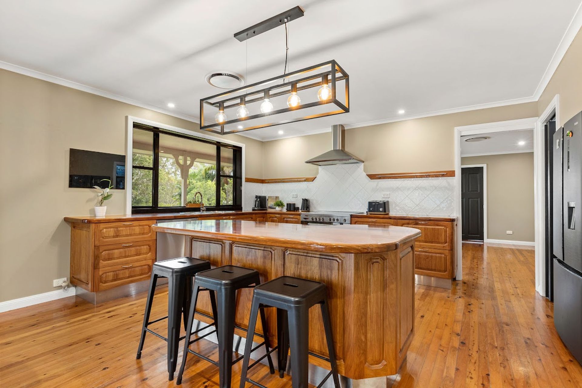 The stylish kitchen boasts New Guinea Rosewood benchtops incorporating a 5-gas burner cooktop with