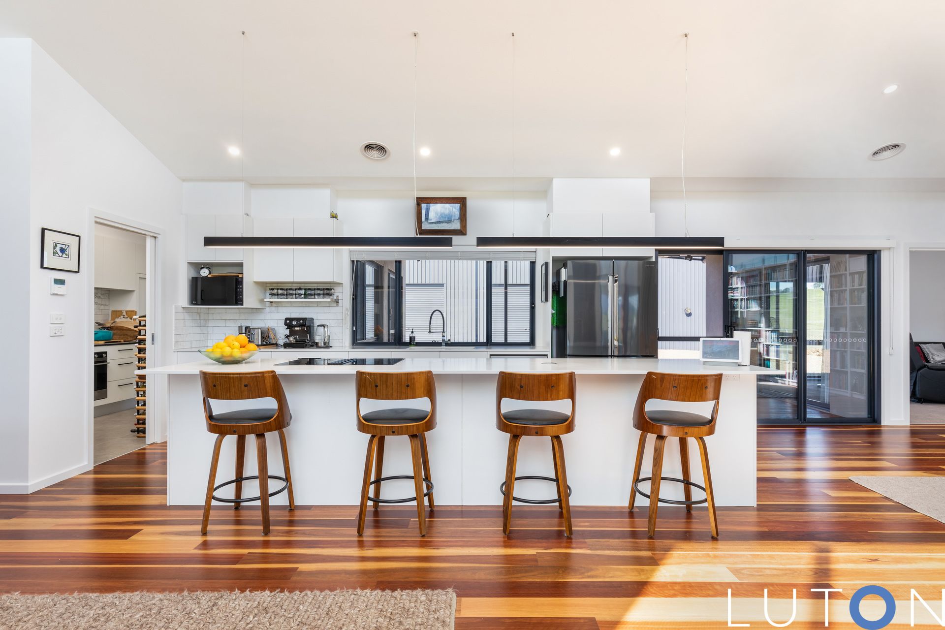 Open plan kitchen, dining and meals area with laminated spotted gum timber underfoot