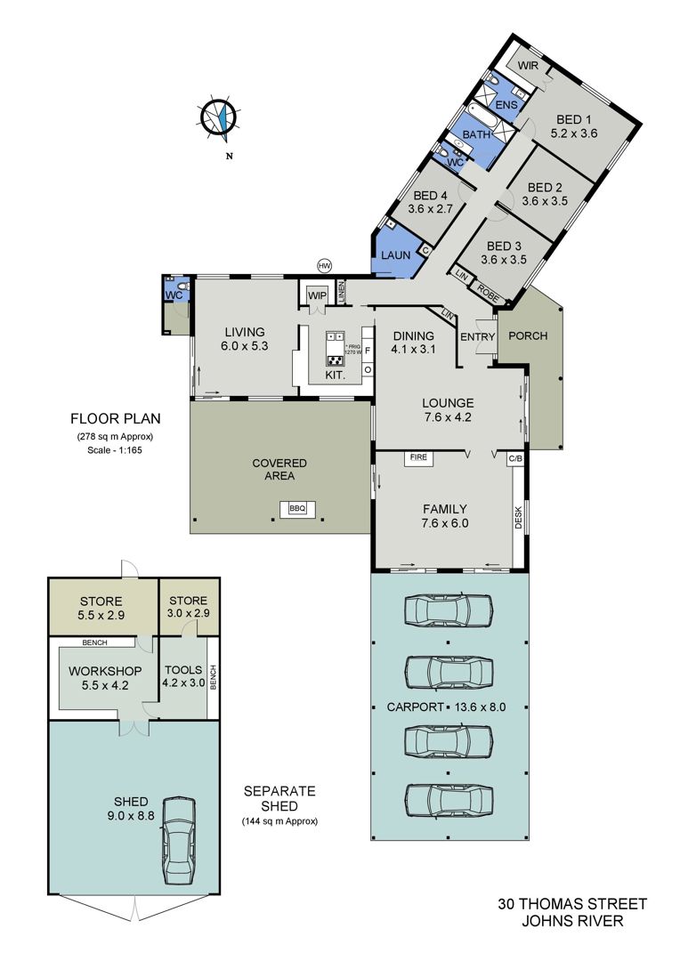 Garaging includes a four-vehicle carport adjoined to the home, plus a detached machinery shed and workshop that would accommodate another two vehicles.