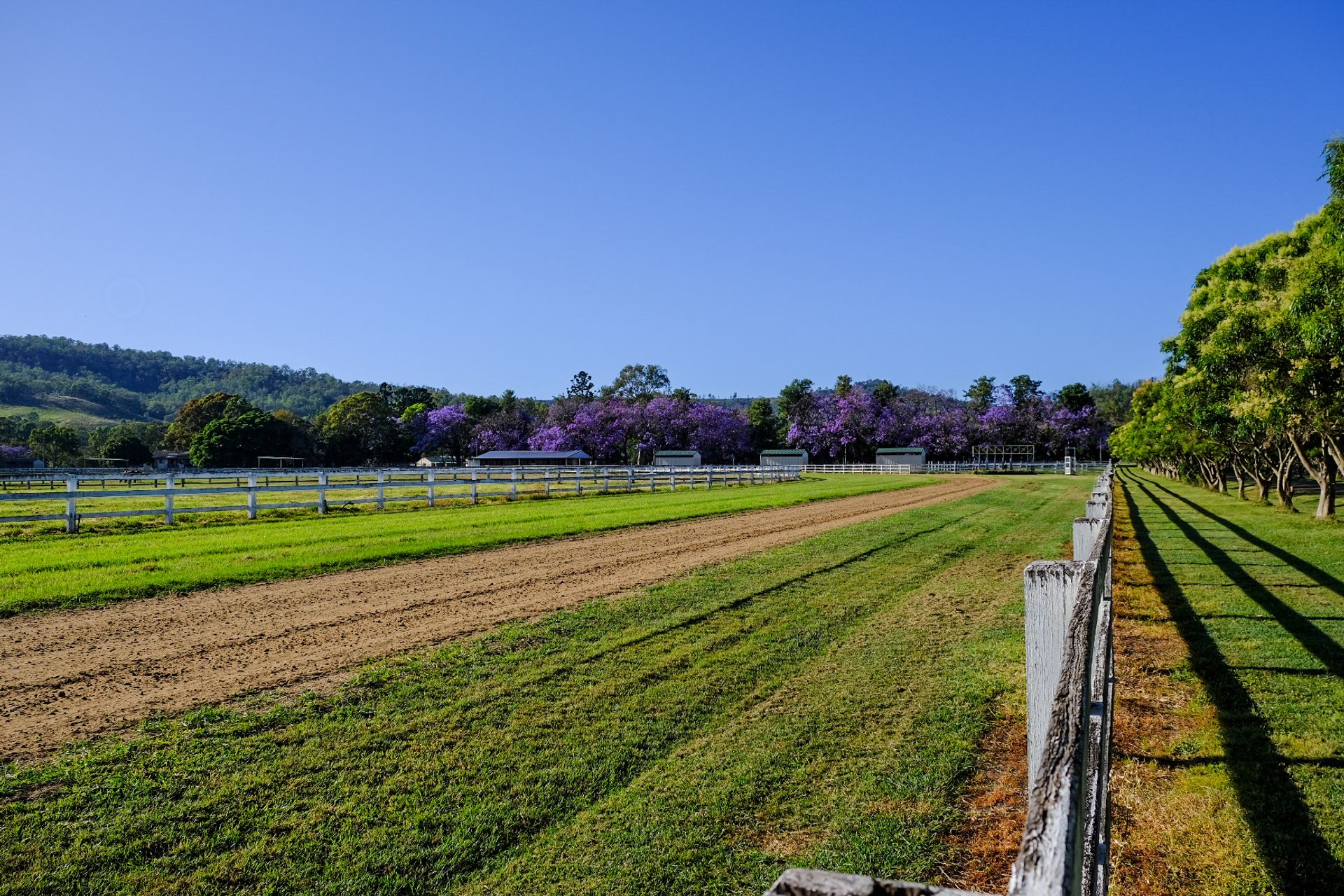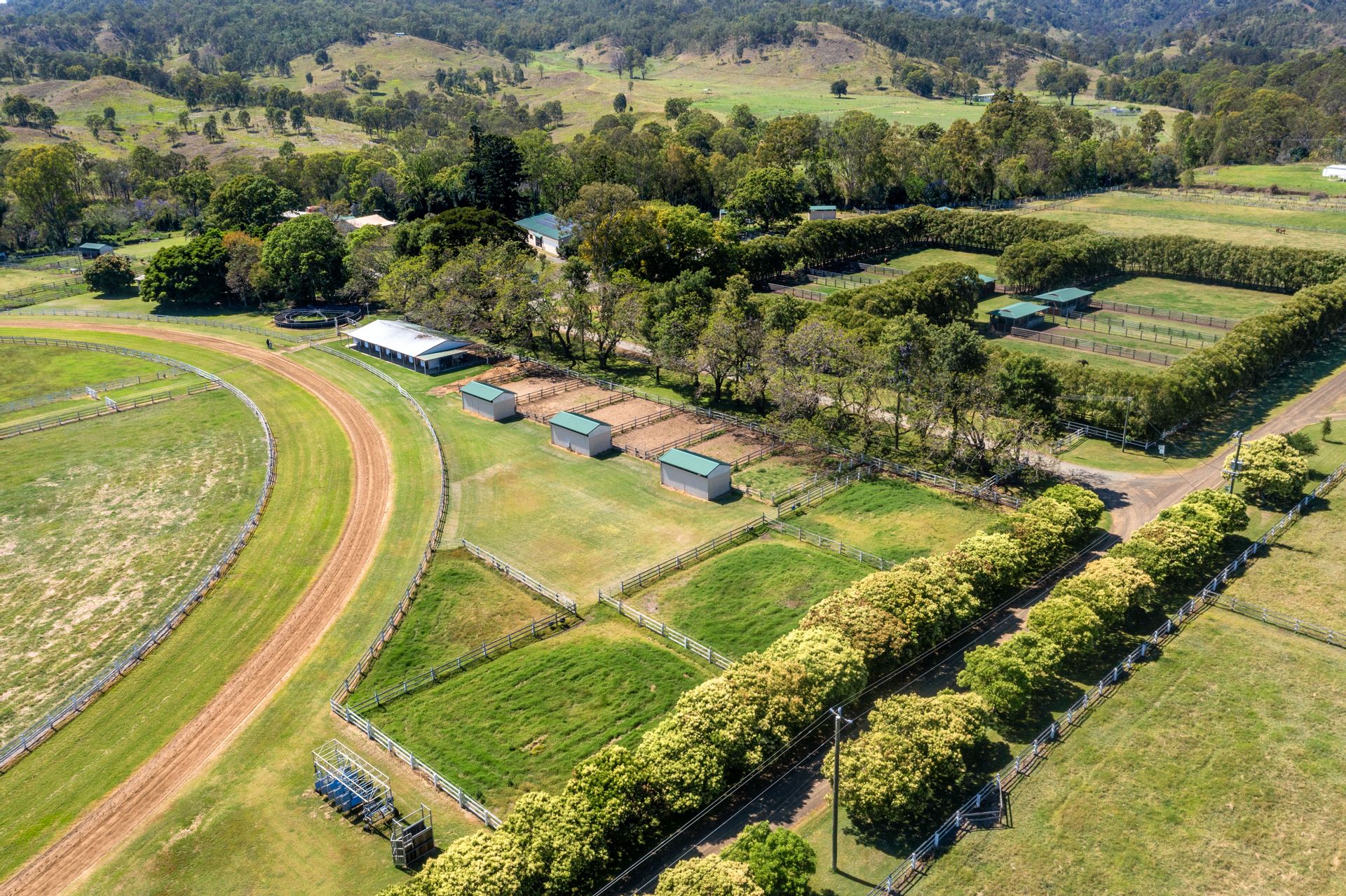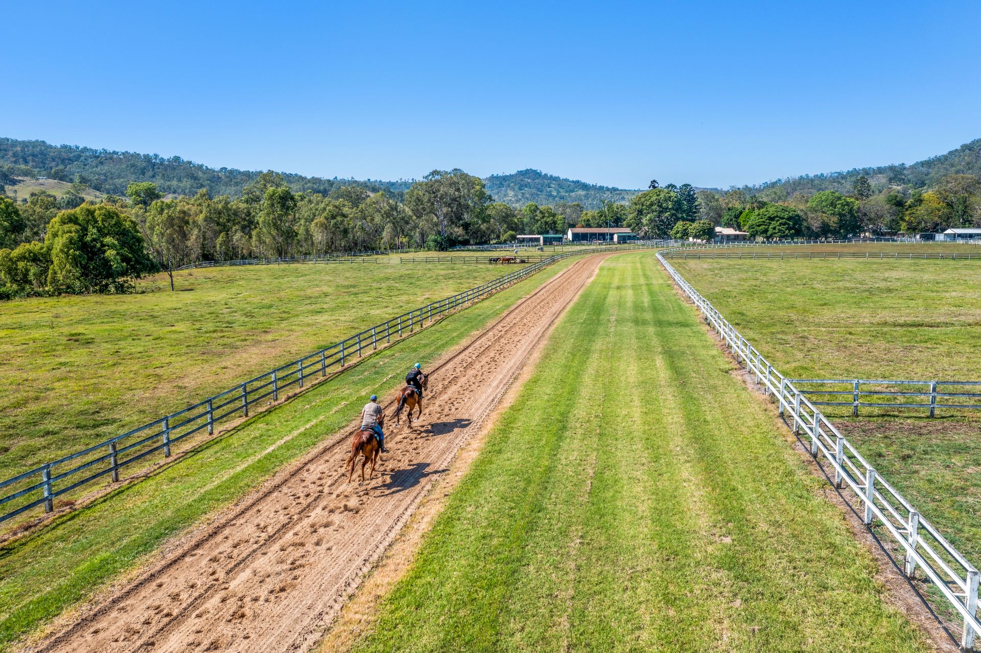 Purpose-built training track (1300m sand track, 1200m grass track) + cambered turns + fully fenced internal running rail + 6 internal spelling paddocks