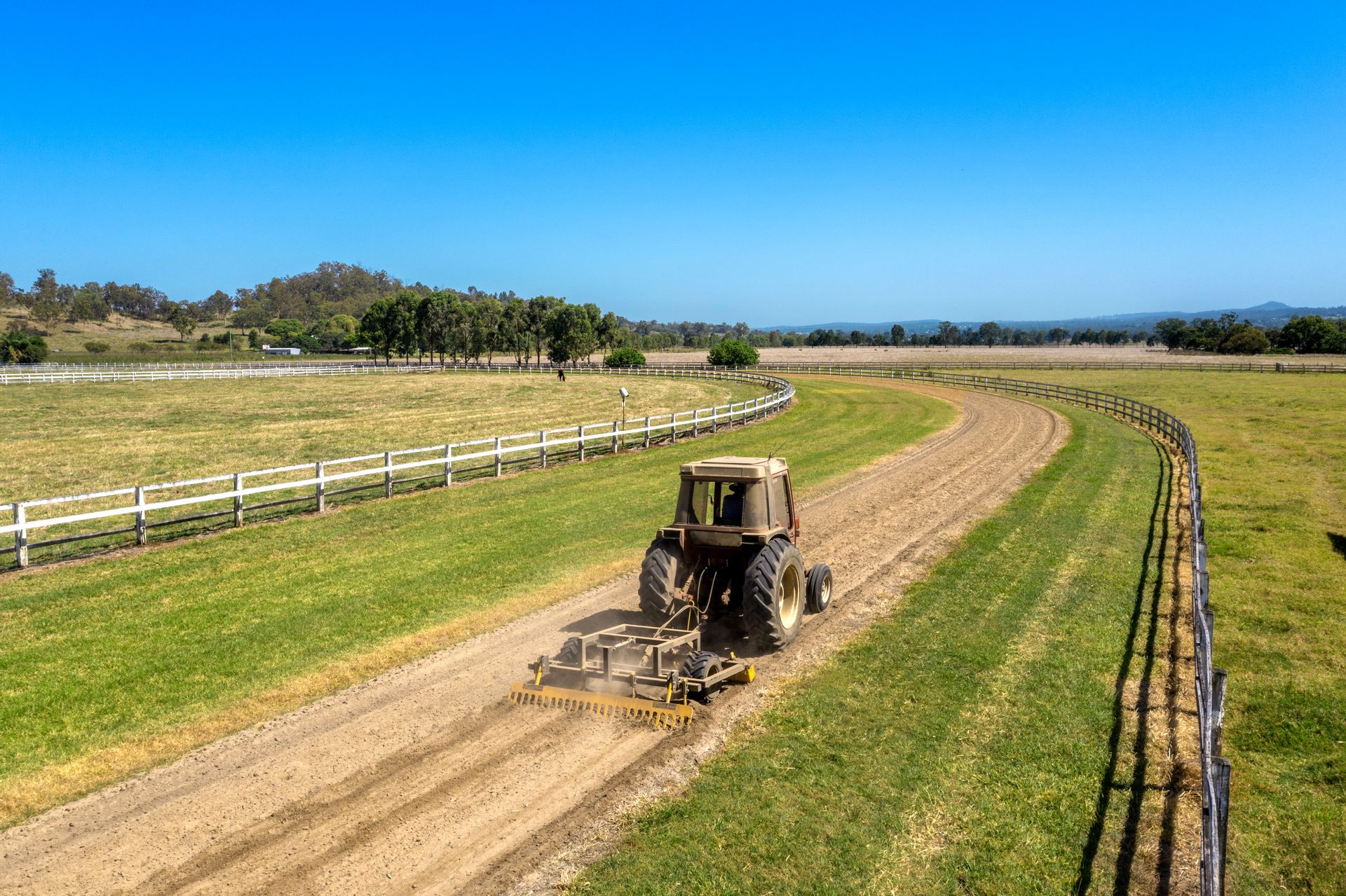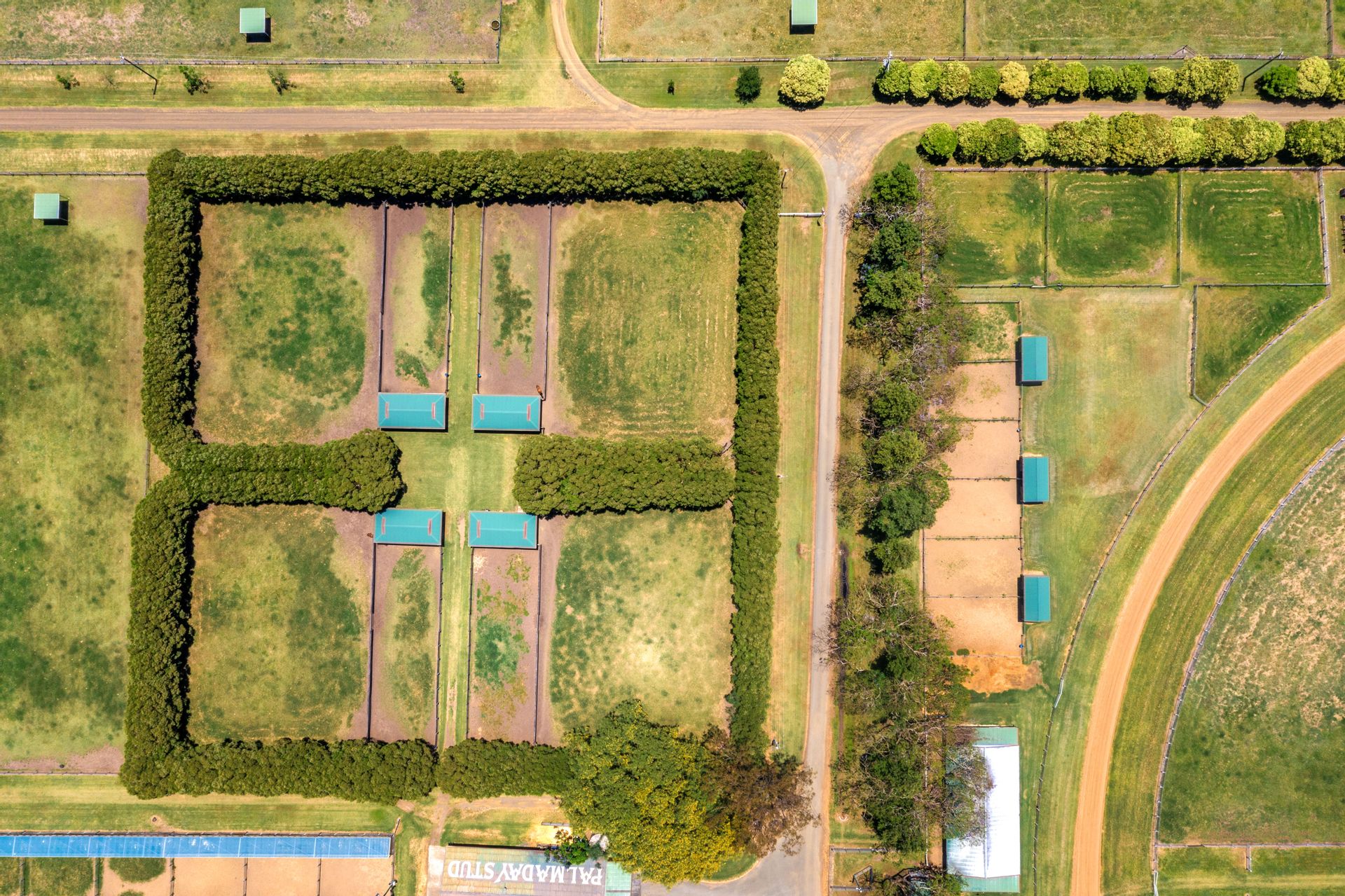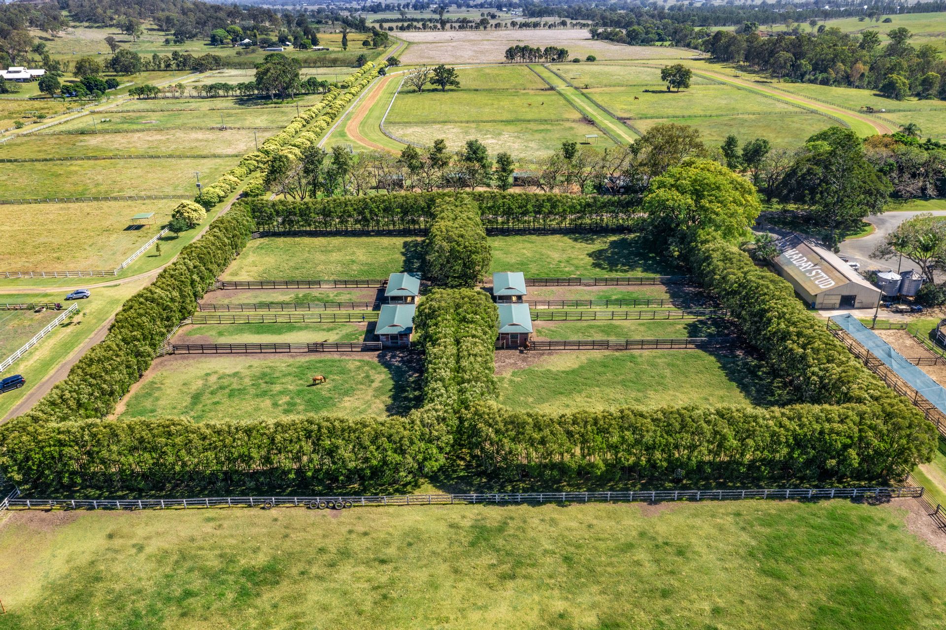 Purpose-built training track (1300m sand track, 1200m grass track) + cambered turns + fully fenced internal running rail + 6 internal spelling paddocks