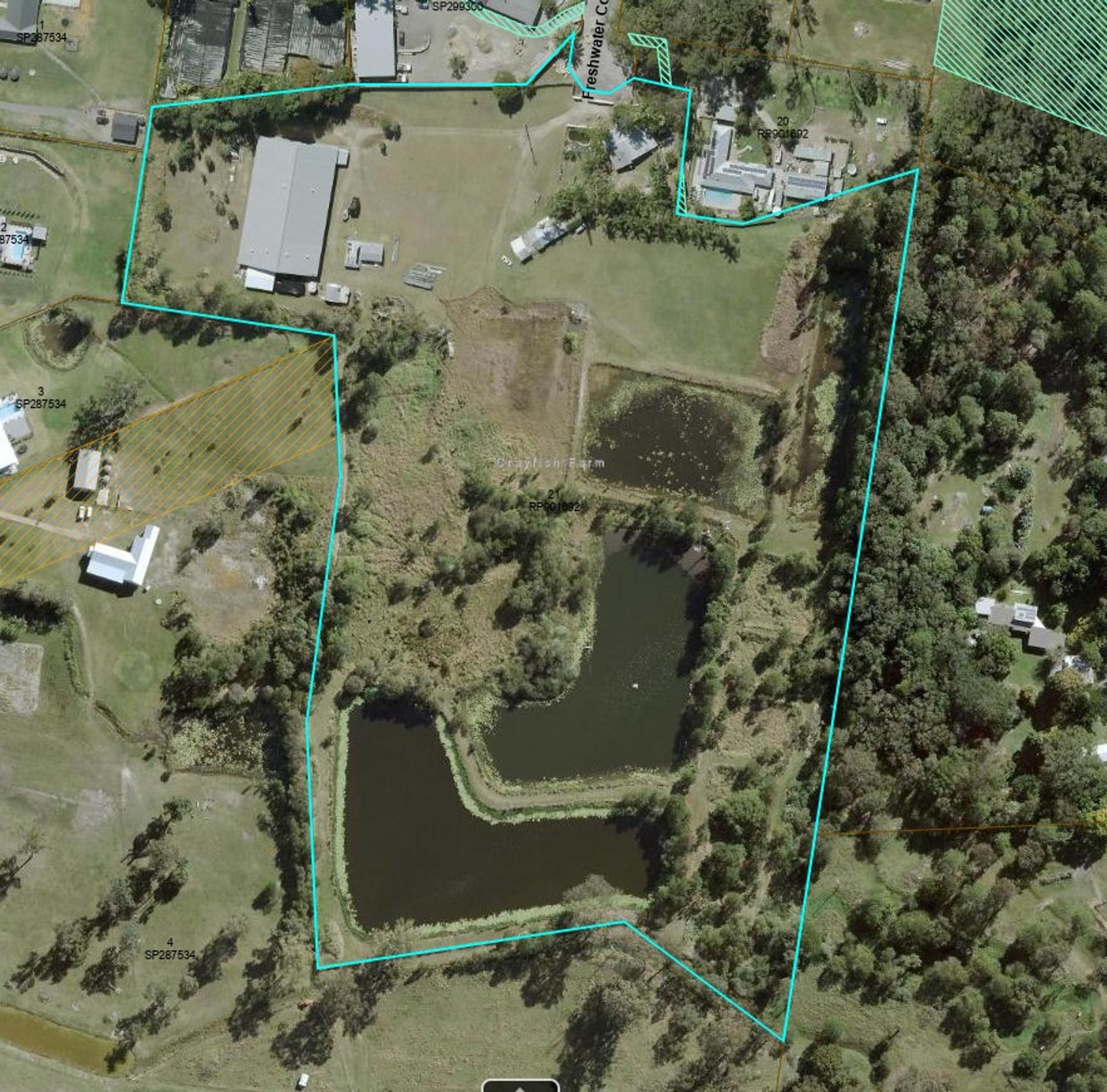 Along the eastern boundary there were originally 10 crayfish ponds however, today some have been joined up as one. Currently there are 8 ponds of which a number are dry. Vehicle access is available around the dams and ponds.