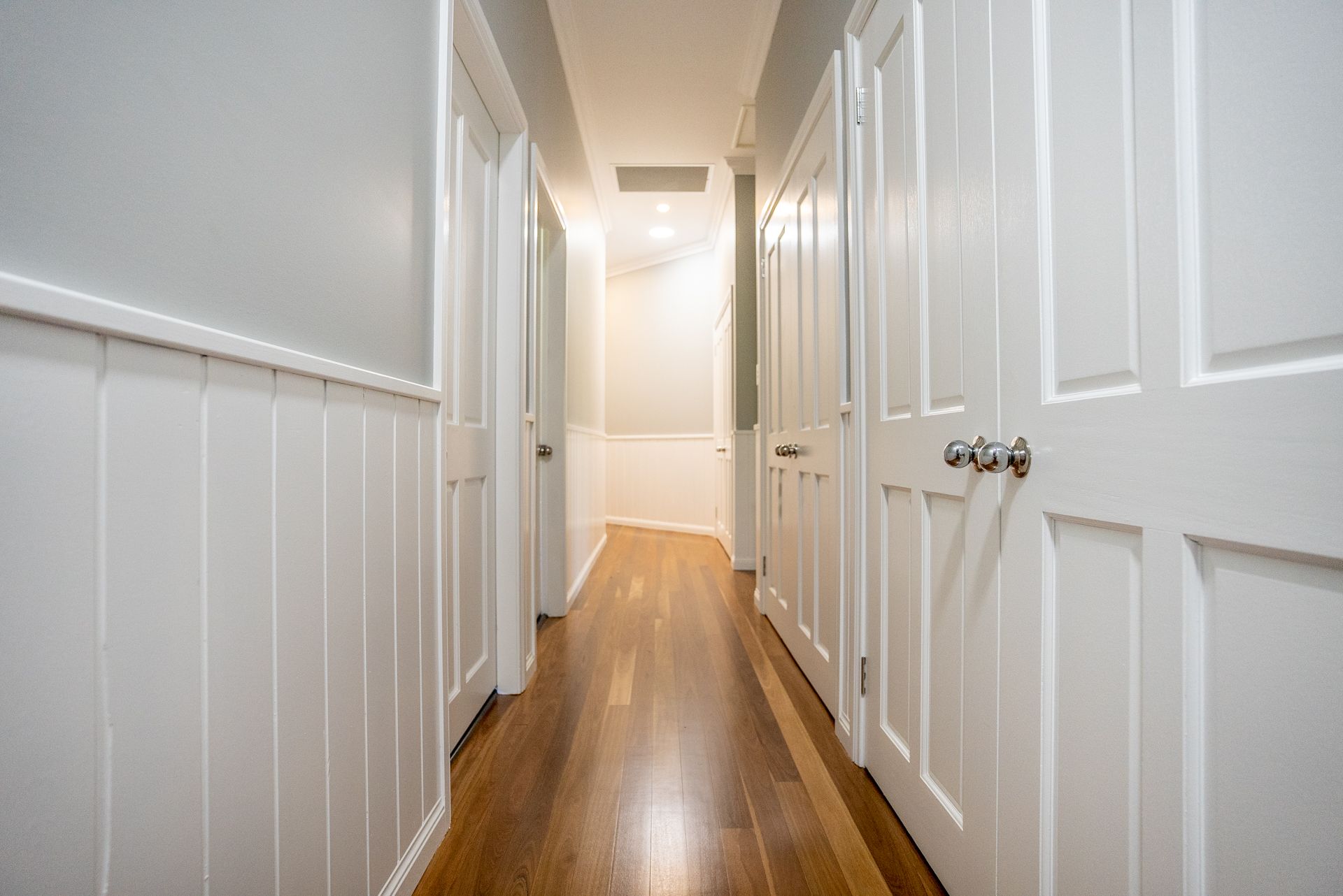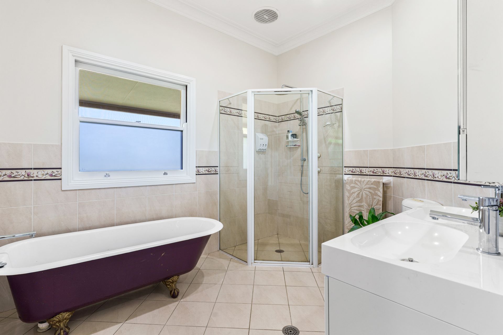 + There are four good size bedrooms, all with new carpet, built-ins, and individual split system air-conditioning units. The master includes a walk-in robe, a ceiling fan, doors to the verandah, and an ensuite with a deep clawfoot tub, twin sink vanity, and a separate shower. There is also a home office at the other end of the hallway, which could be utilised as a fifth bedroom or nursery