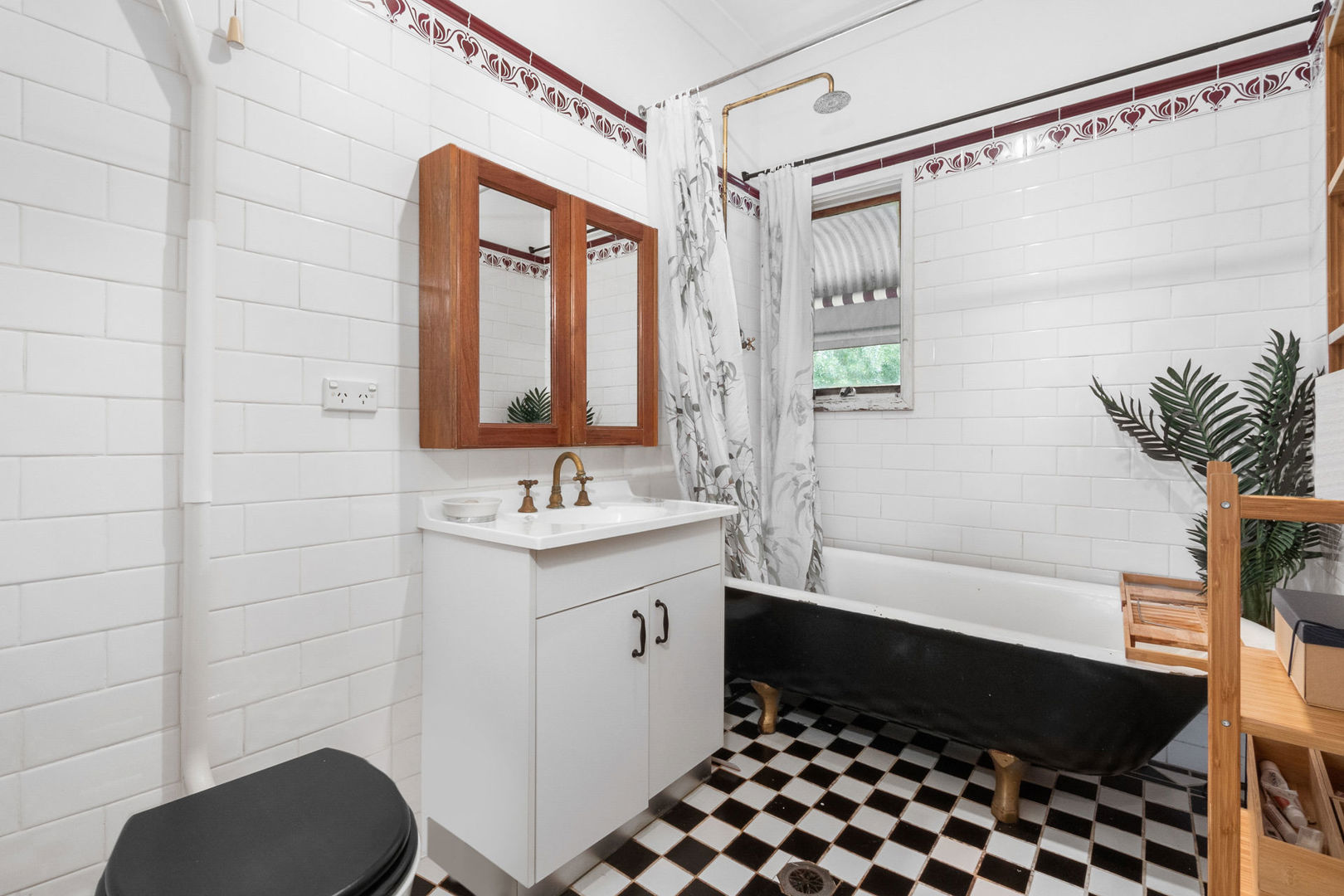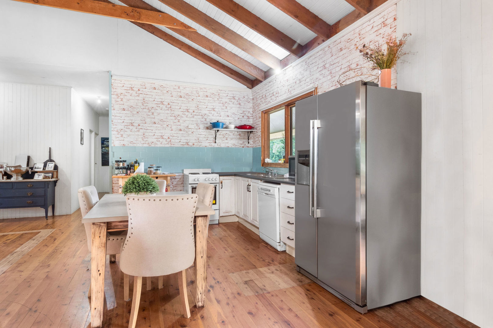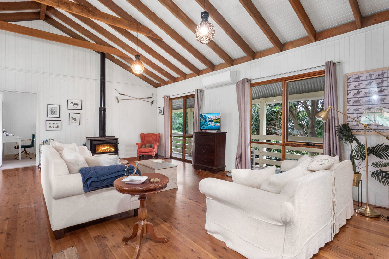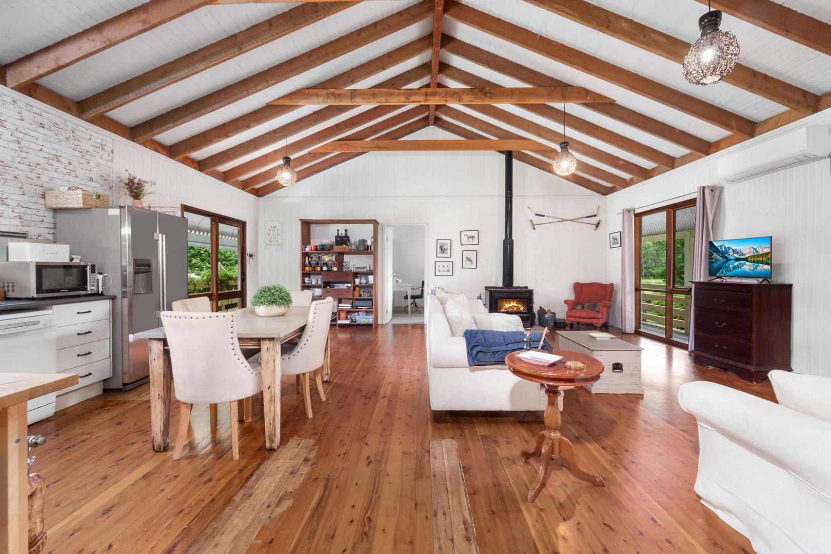 A haven of peace and privacy, the property features a charming four bedroom Queenslander-style home with wrap-around bullnose verandah, high-raked ceilings, polished timber floors and a cosy wood fireplace. The character-rich interiors with timber-panelled walls reveal a heritage style bathroom with claw foot tub.