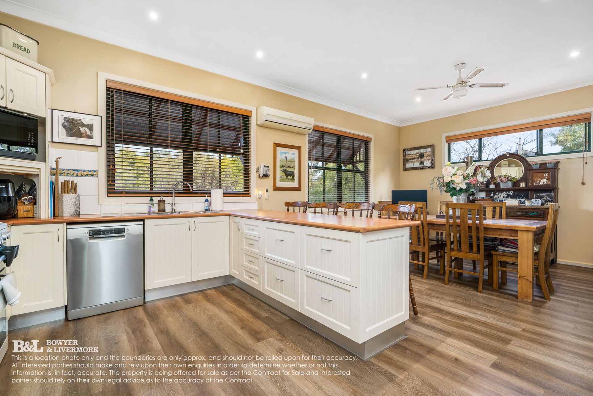 - Elegant country kitchen, complete with dishwasher, gas cooking, space for the double fridge, ample cupboard space and adjoining dining