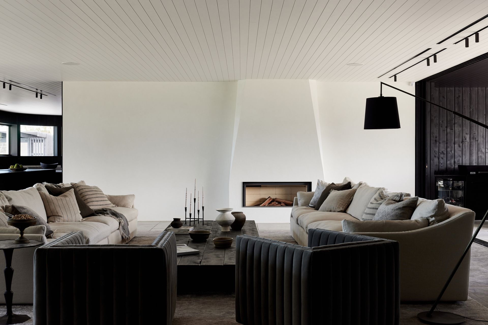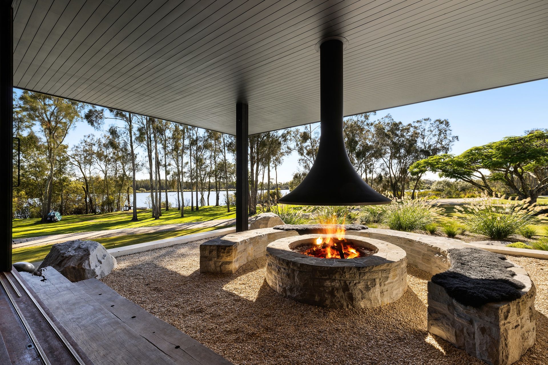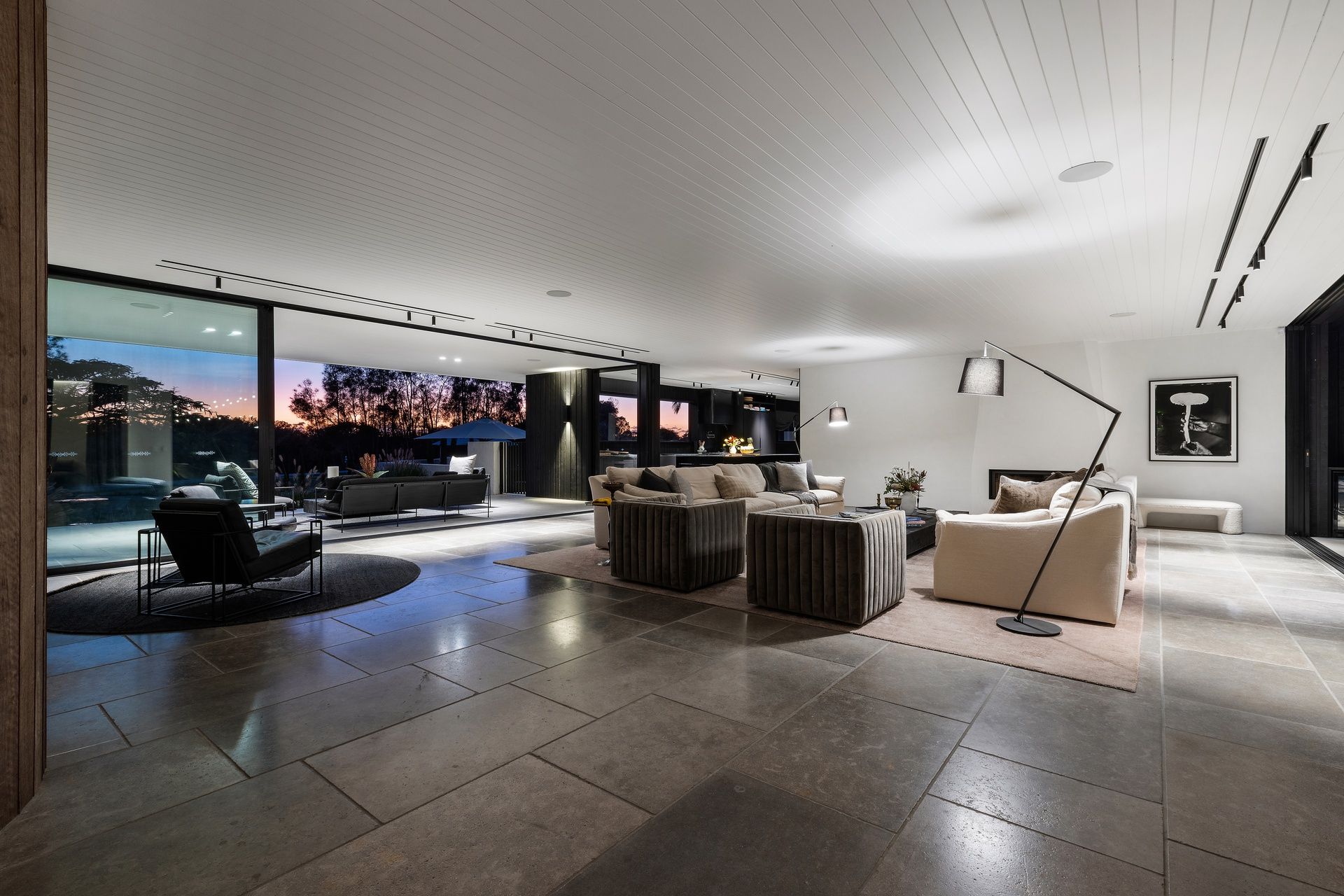 Lounge with fireplace flows seamlessly from indoor to out