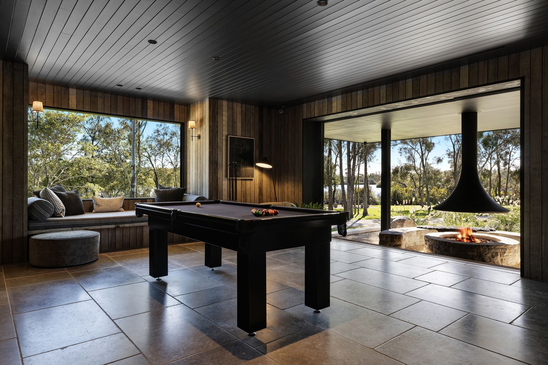 Games room opens to covered statement fire pit