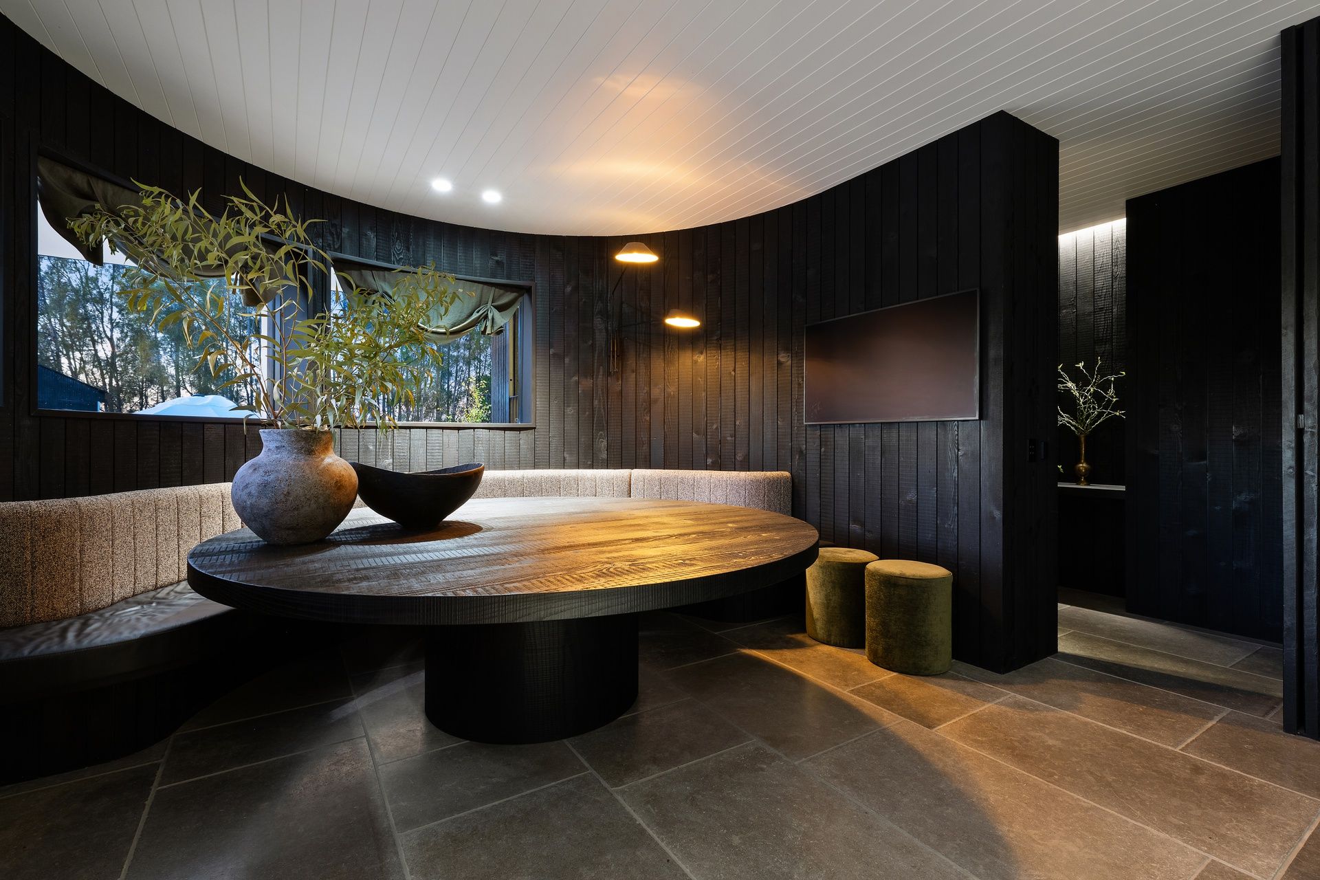 Dine in style at the custom built round dining table and bench seating at the far end of the kitchen, situated under a wide curved window for a truly special dining experience