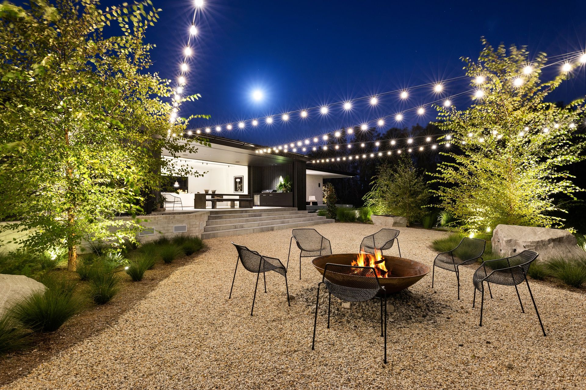 Courtyard with fire pit and festoon lighting