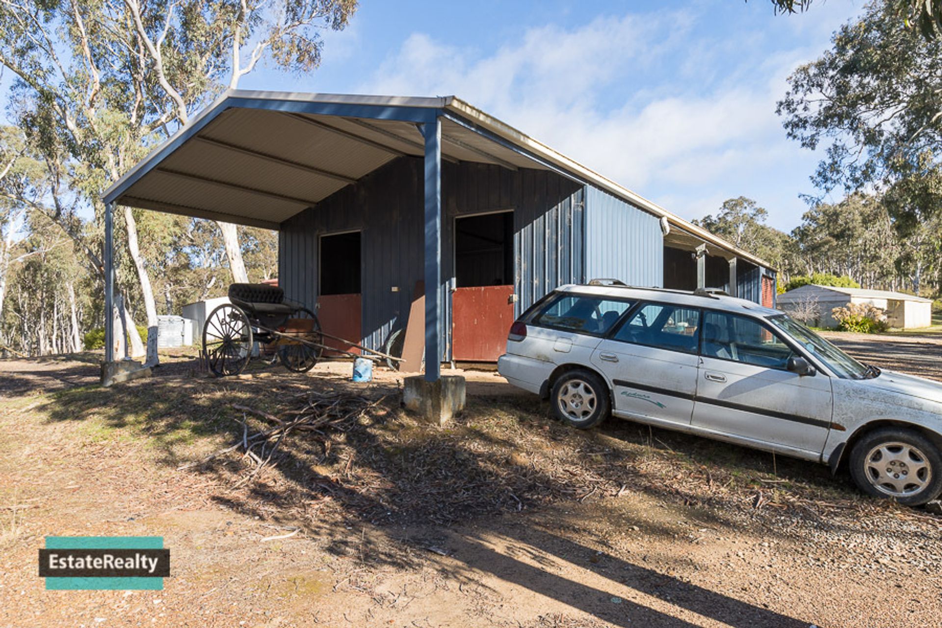 Double stable on end of shedding with 4 meter carport bay off stable doors.
