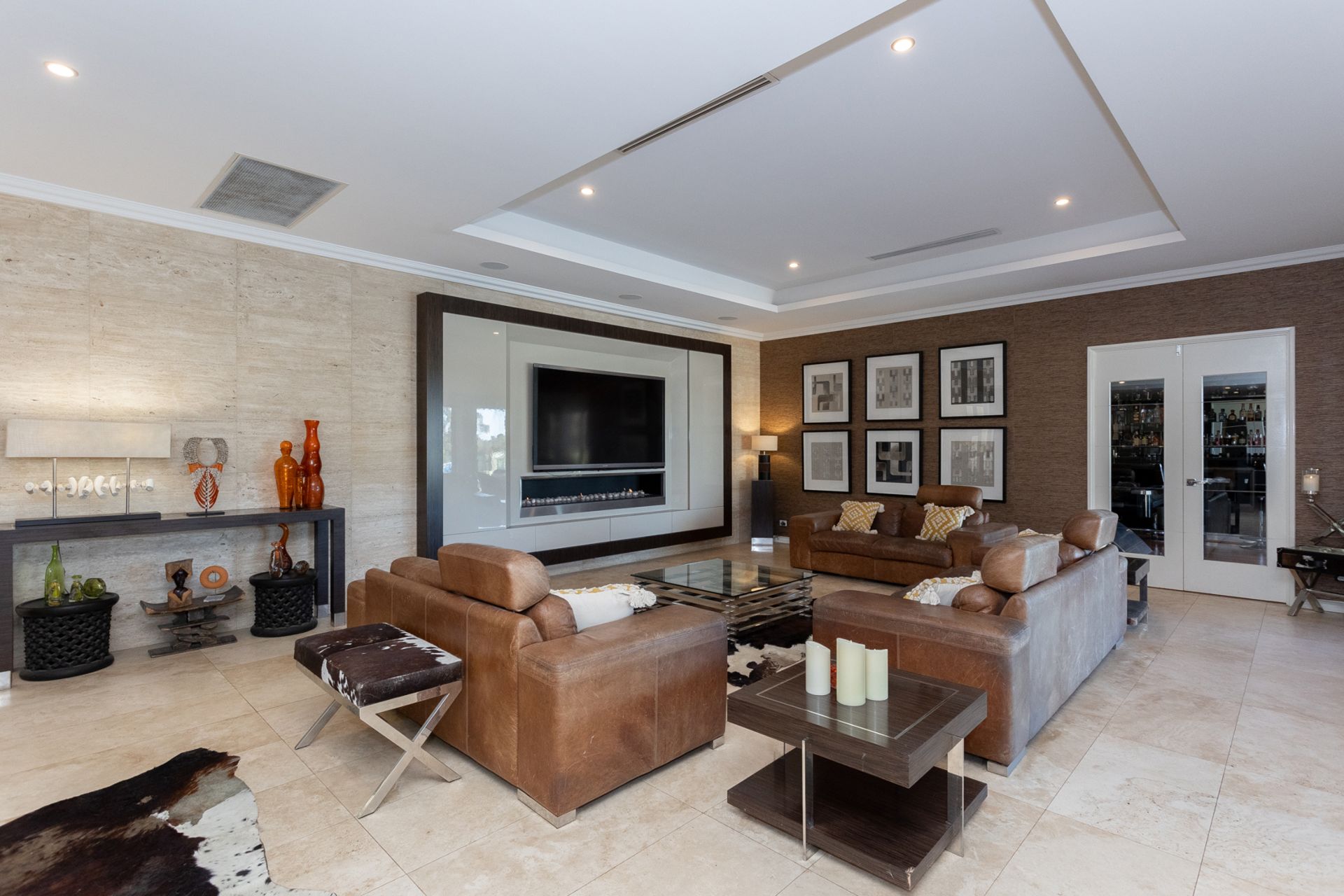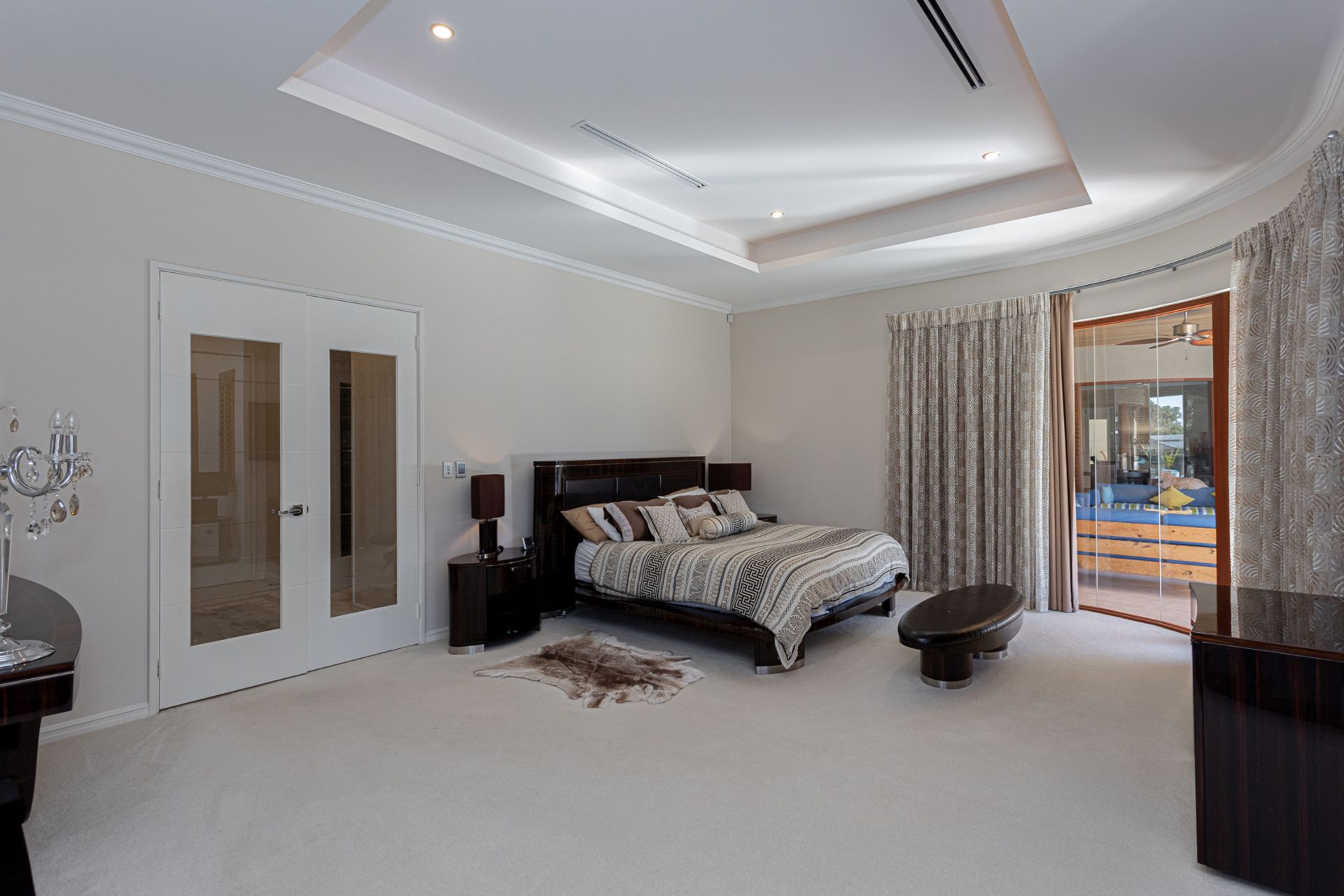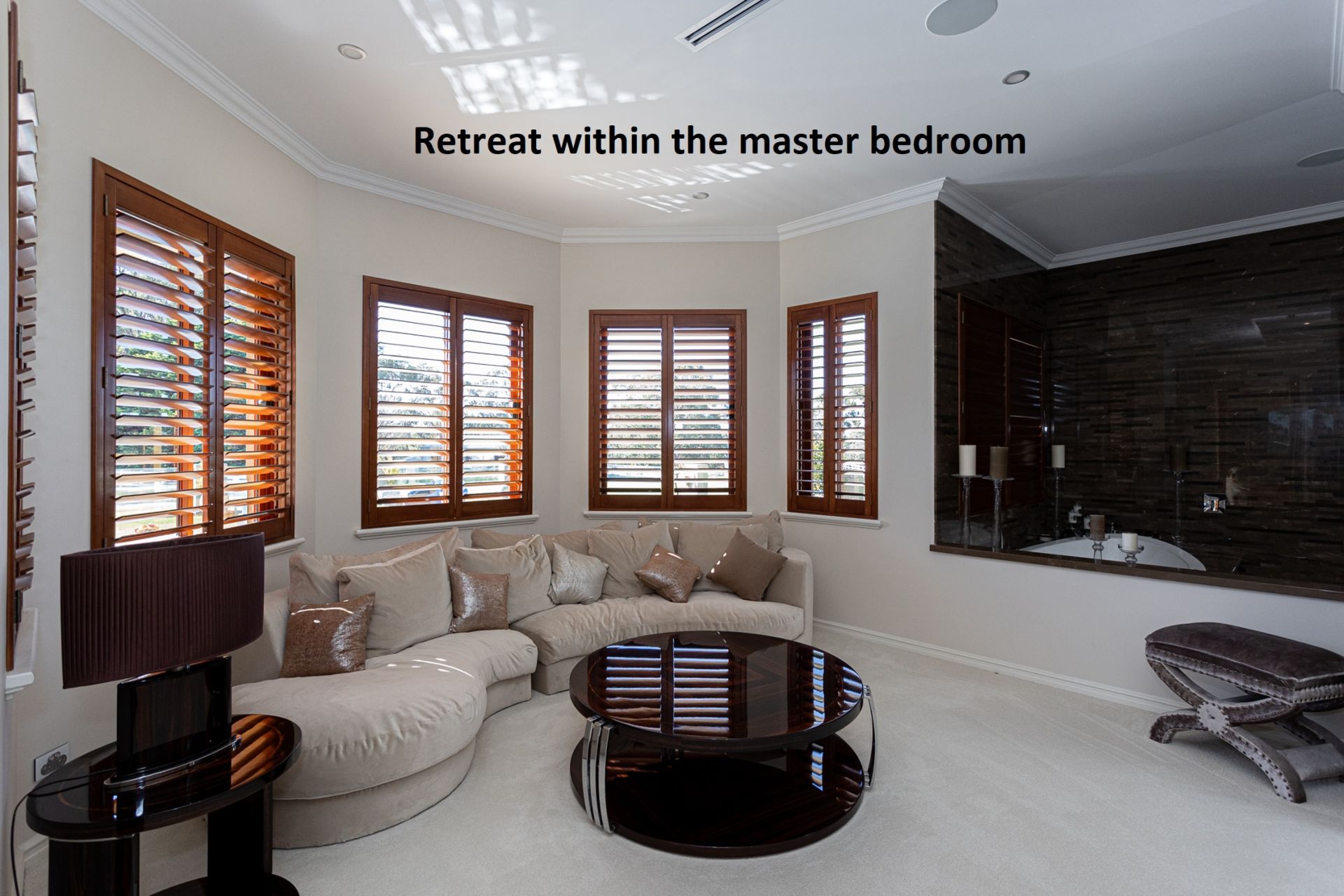 A magnificent master suite features a full-size lounging area, beautifully fitted his and hers dressing rooms with display cabinetry, and a bespoke ensuite with stunning floor to ceiling tiling, spa bath, enormous shower, twin vanities with 40mm stone bench tops and an enclosed WC. The guest wing offers a separate lounging retreat, gorgeous ensuite & a spacious walk-in robe. Three of the five minor bedrooms have beautifully appointed ensuites, with the primary bathroom offering a free-standing bath, shower, and floor to ceiling travertine – there is a separate powder room for visitors.