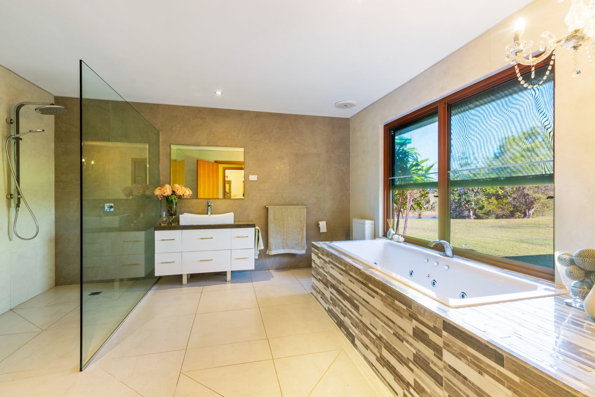 • Luxurious bathroom with a rainfall shower and a relaxing spa bath