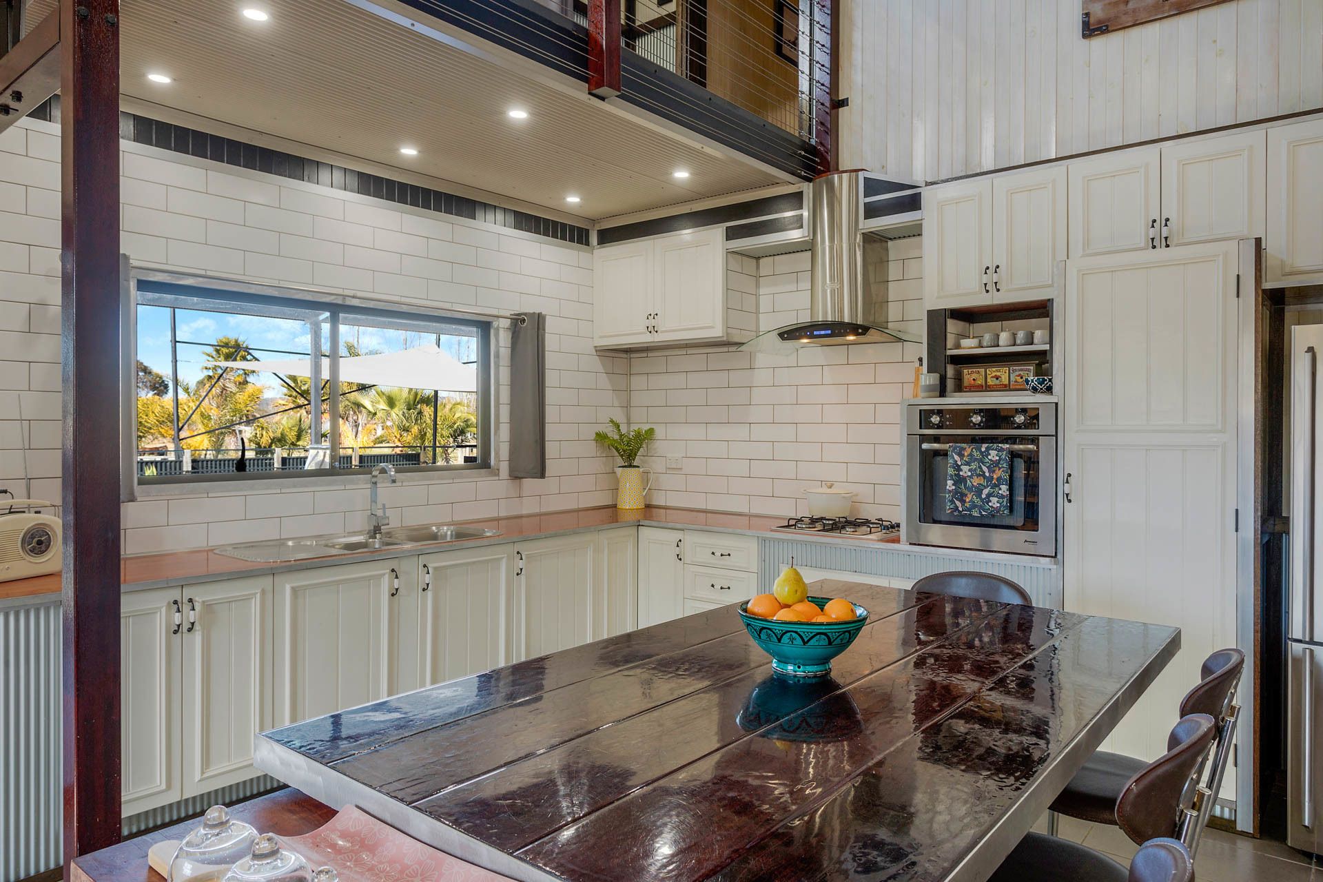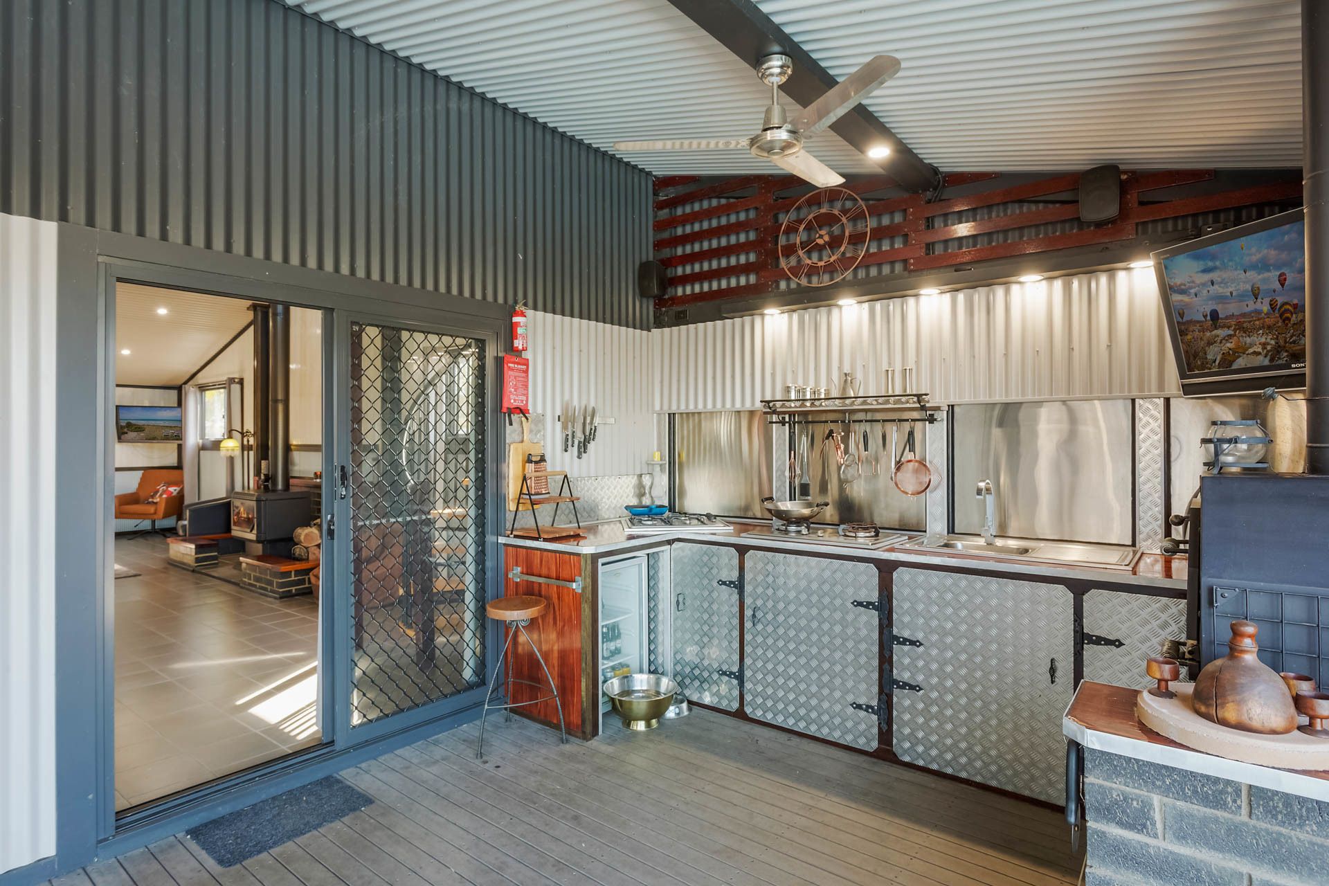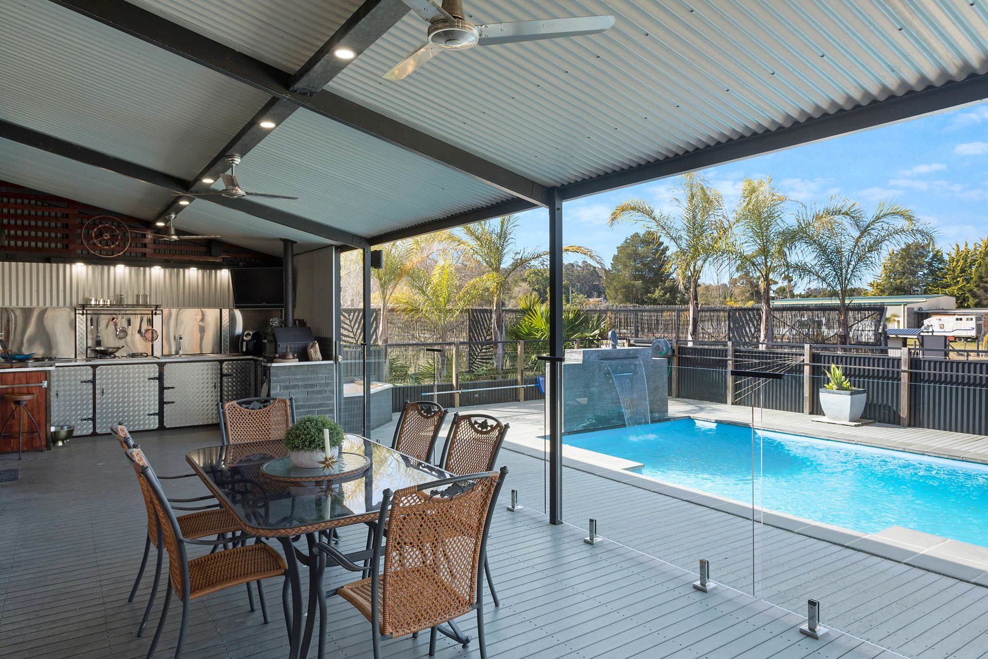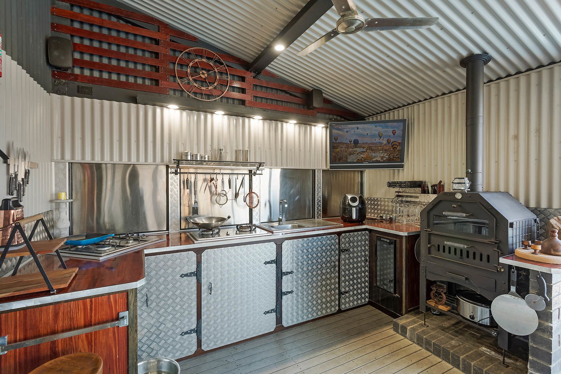 From the kitchen, you can walk straight outside to a huge undercover outdoor entertaining area or pass food out through the servery, the outside kitchen includes full cooking facilities, a dishwasher, and a wood-fire pizza oven.