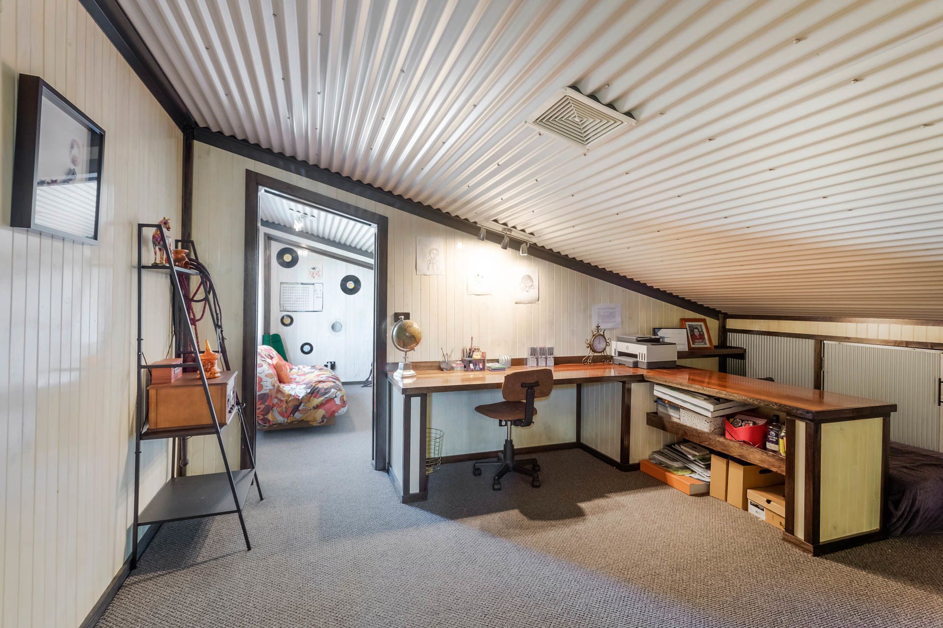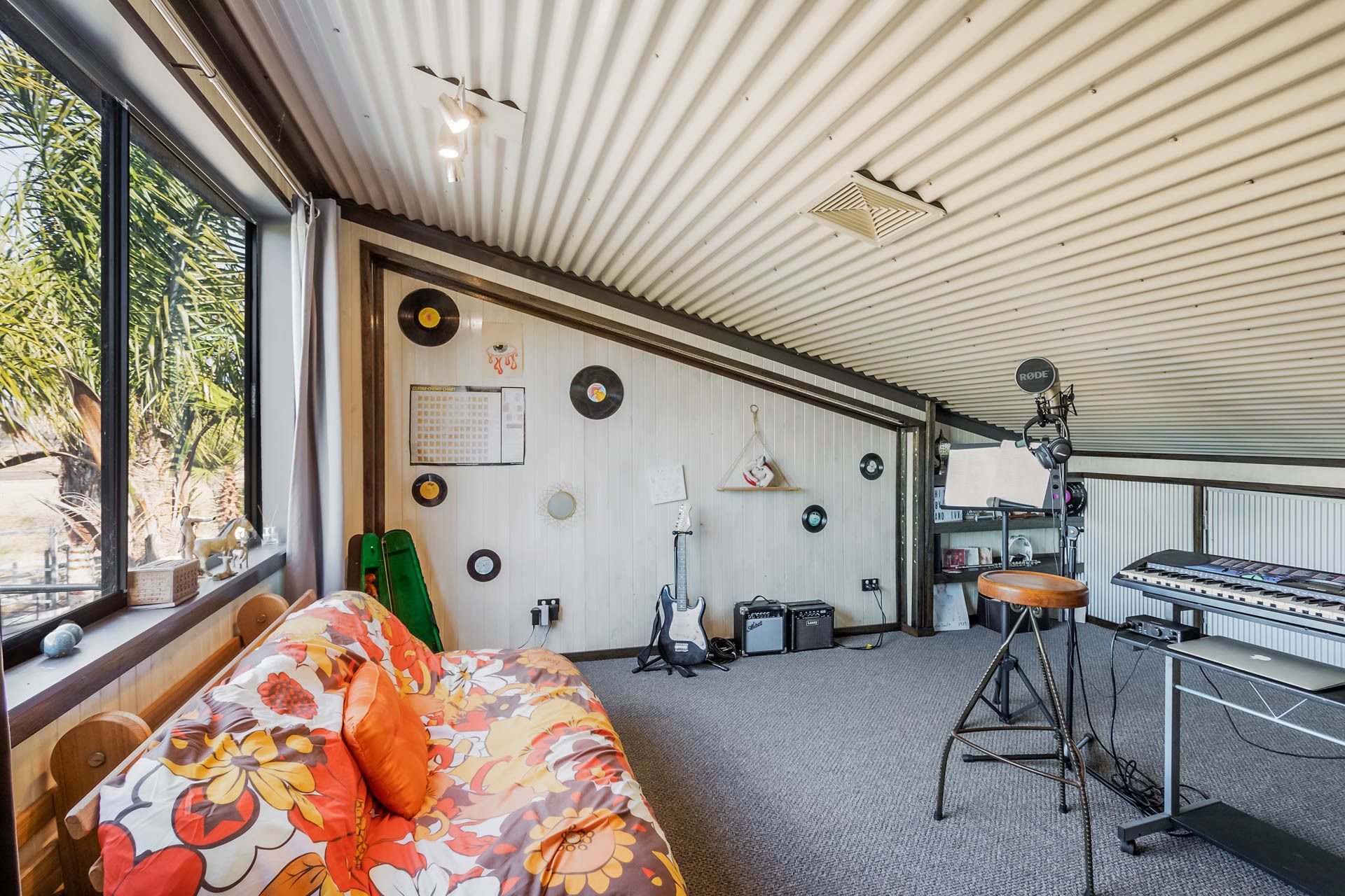 The upper level of the home contains a fully soundproofed music studio and a home office/study with ample storage.