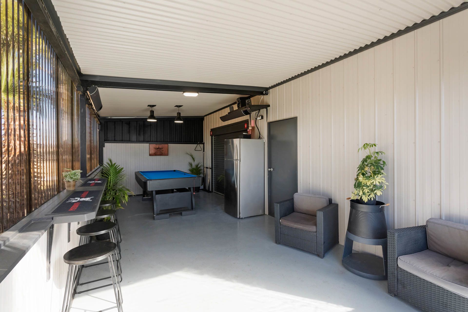 There is a large three-car garage, which is currently set up as a man cave.
