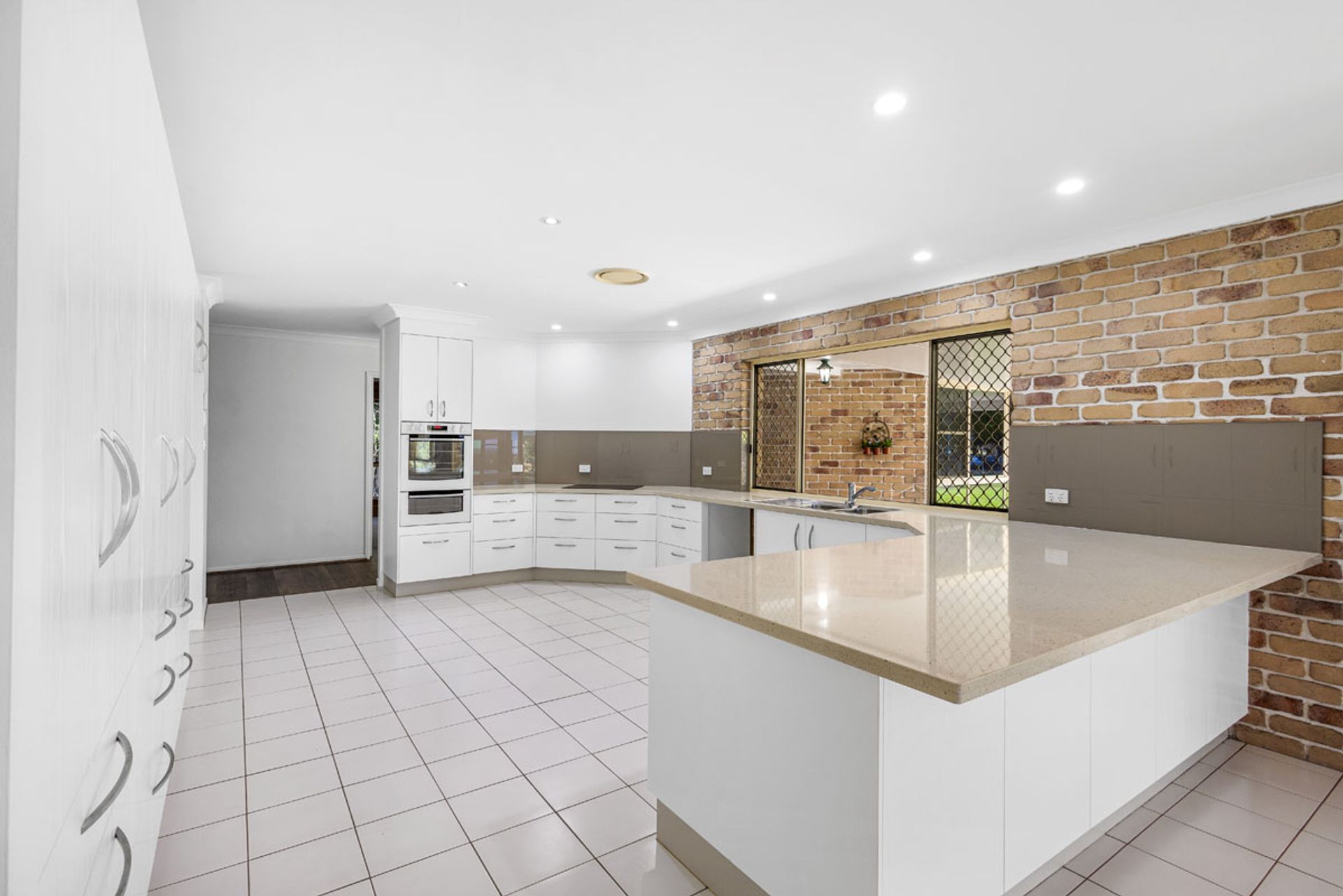 Five bedrooms, each adorned with BIR's, and two well-appointed bathrooms provide ample accommodation. The modern kitchen stands as the heart of the residence, characterized by extensive stone countertops, abundant storage options, modern appliances including a double oven, and ample space for refrigeration. Dual living areas, comprising a family room adjoining the kitchen and a generous separate living room with bar and wood fire heater, offer distinct spaces for relaxation and entertainment. The family room and kitchen seamlessly transition to a spacious patio measuring 13mx6m, boasting insulated panels for comfortable year-round use. Overlooking the in-ground pool, this space is perfect for casual outdoor gatherings, and the pool itself is nestled on the northern side of the house, fully fenced, and partially shaded for sun protection.
