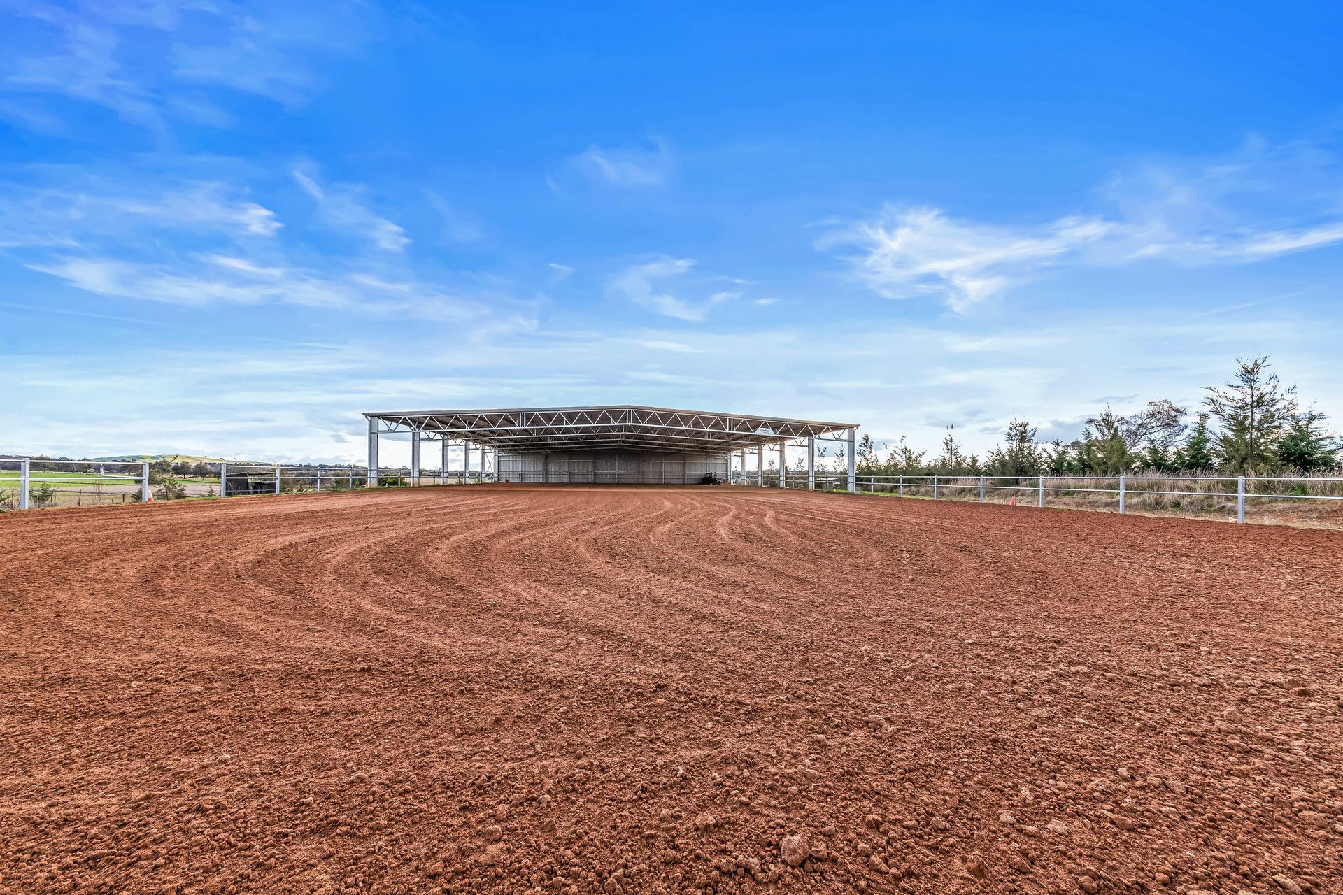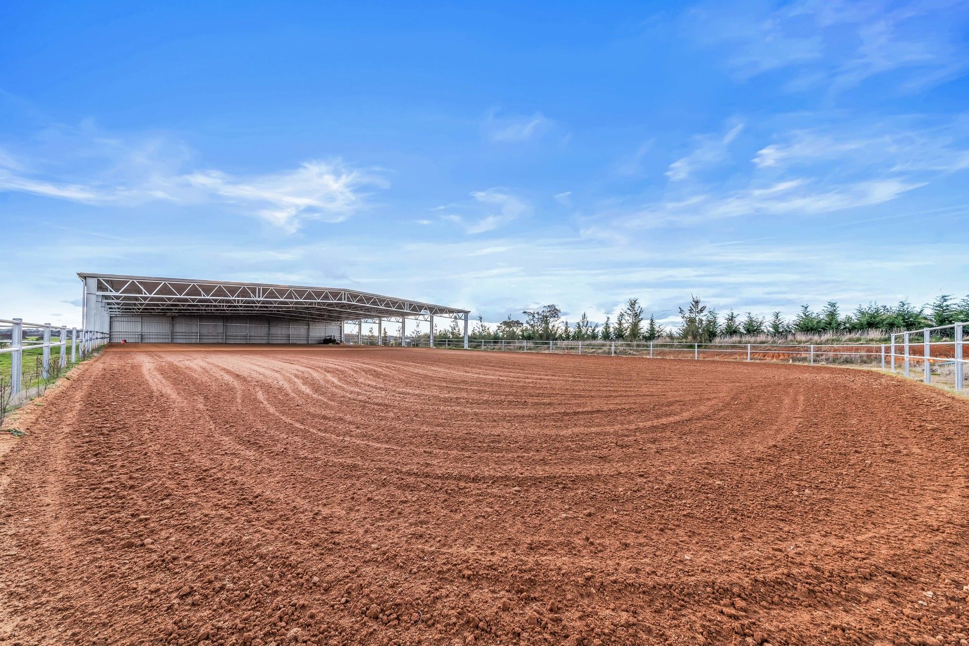 •Reining Arena: total size 40x75m with 40x36m (40%) covered, surfaced with river sand over clay base, fully steel post/rail fenced with night lighting, east/west orientation