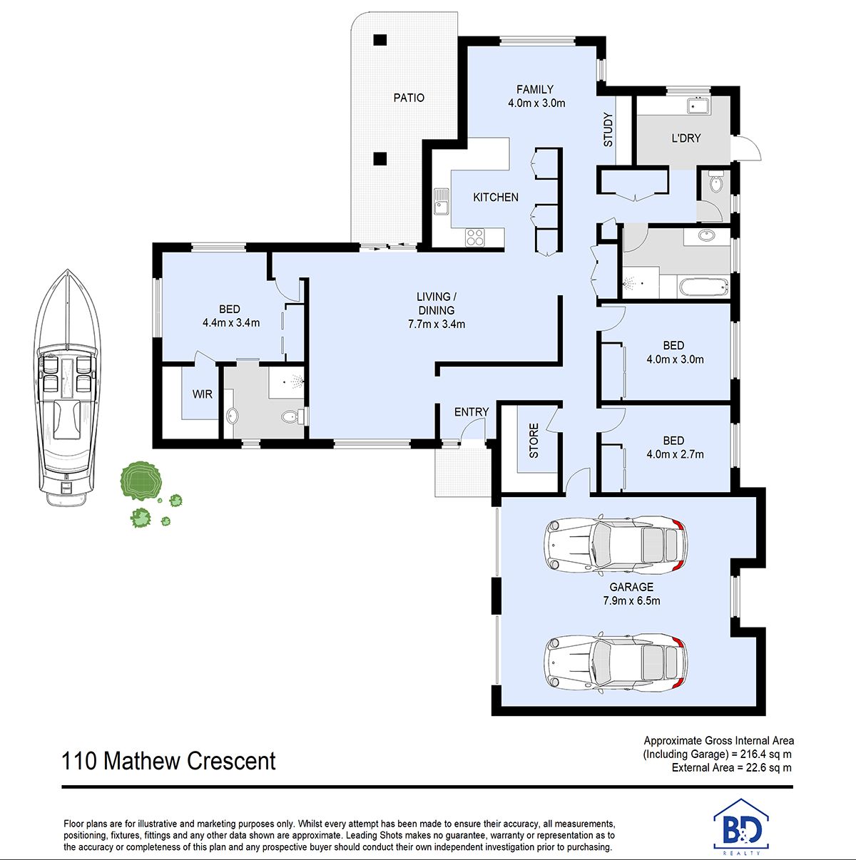 • Double bay garage with storage cavities.