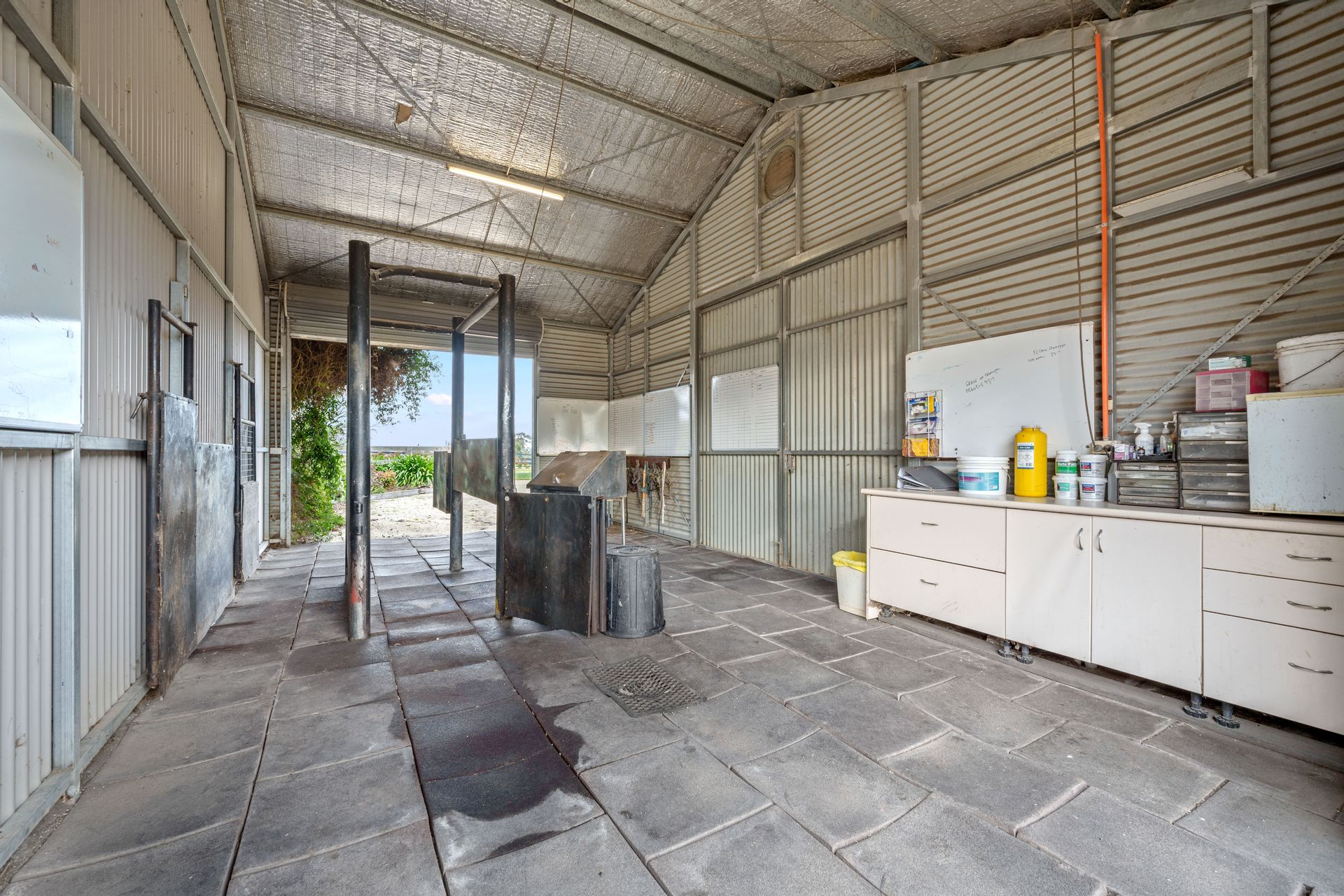 Machinery shed & workshop concrete floor 42m x 15m + shower + toilet + kitchen, Hay shed 18m x 10m, staff accommodation demountable, 3 x silos, cattle yards.