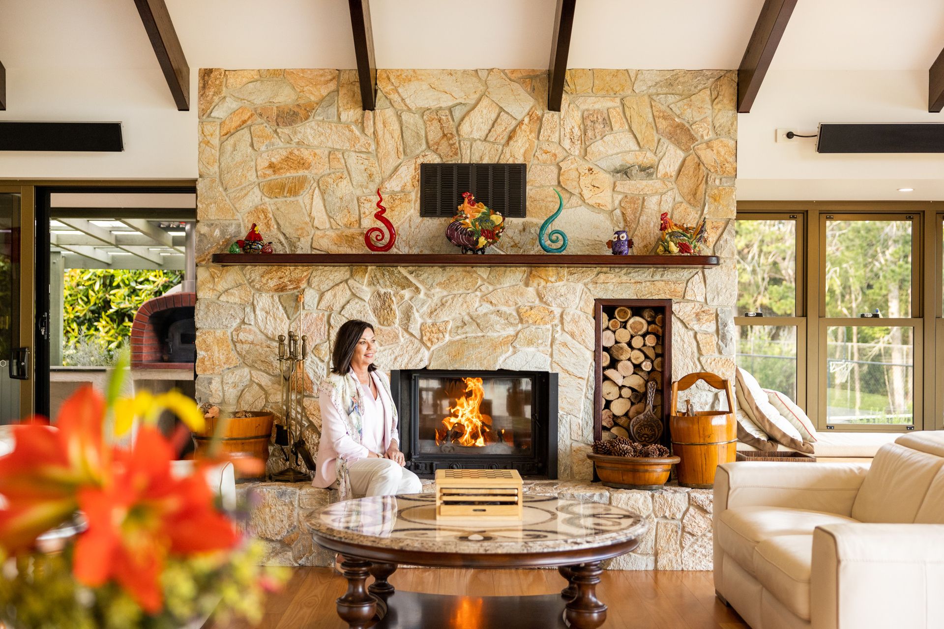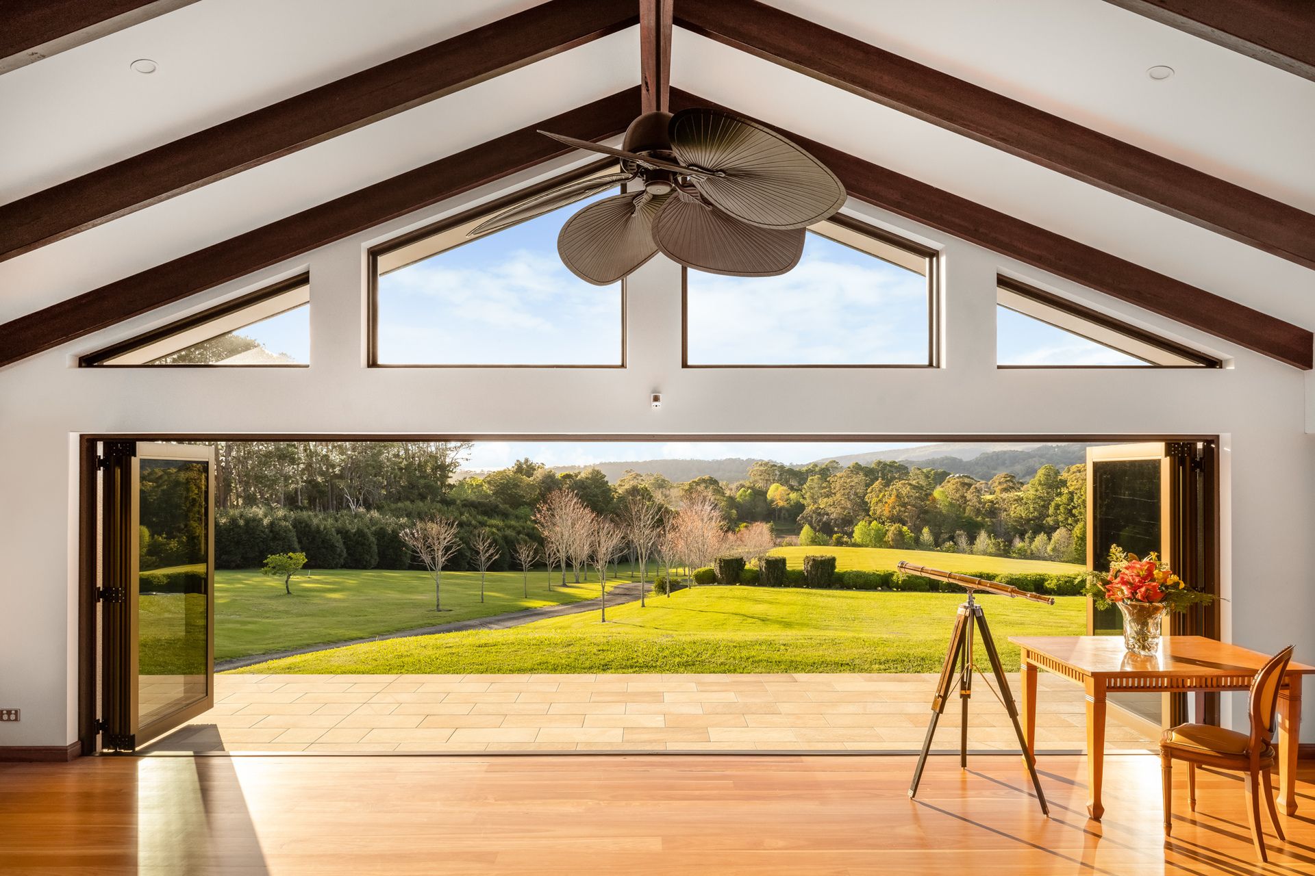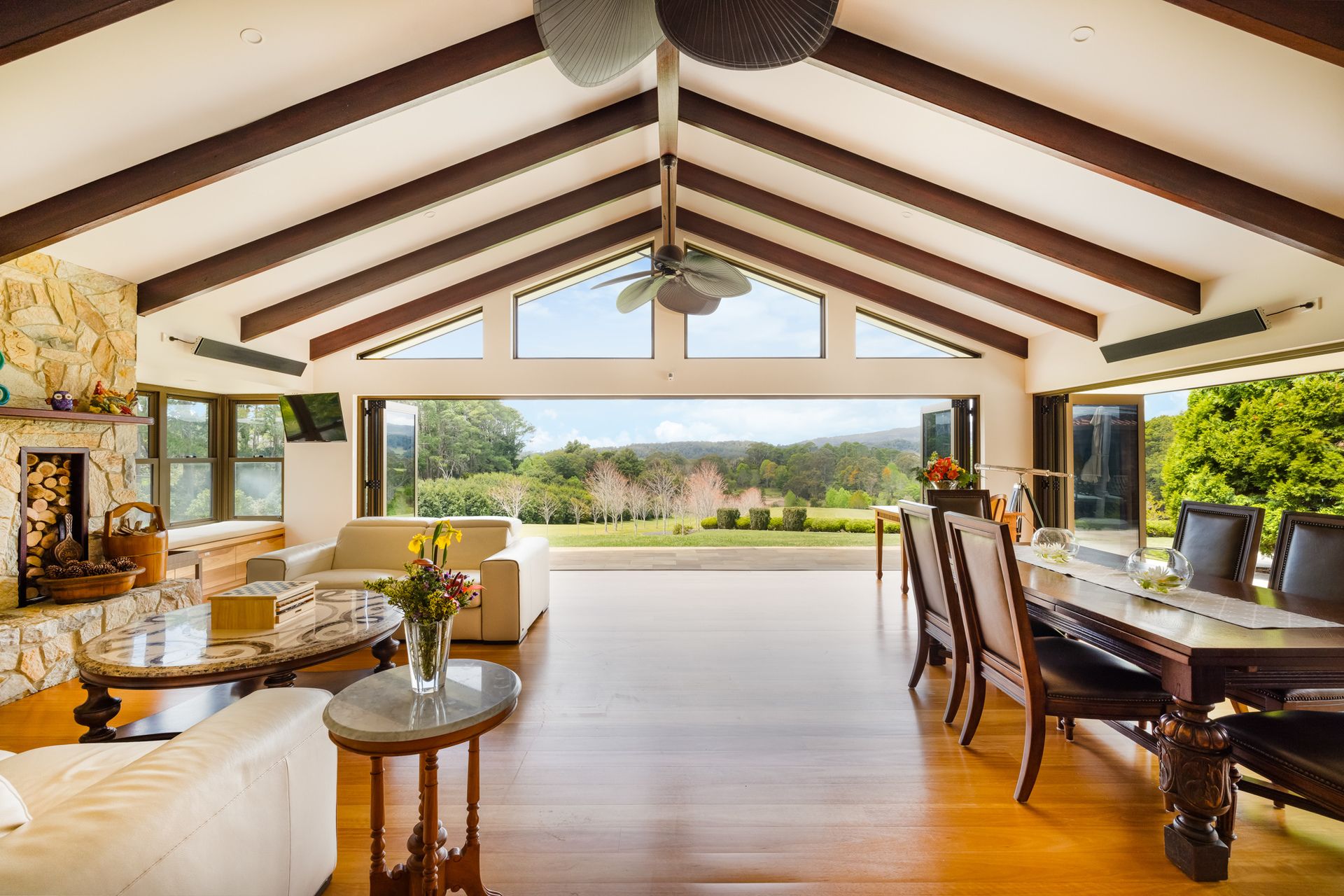 - Soaring ceilings with exposed timber beams