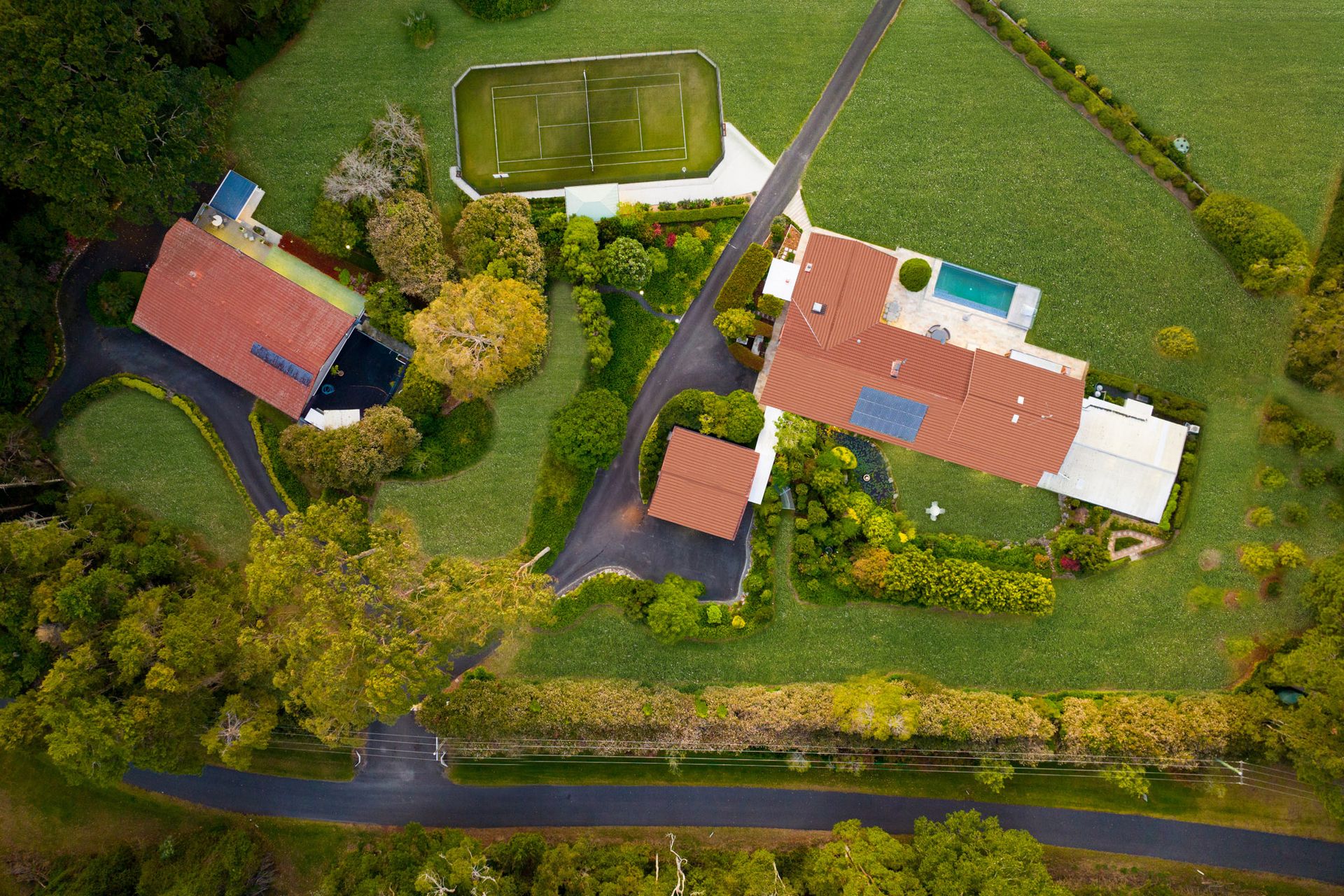 The primary residence stands as an architecturally designed and majestic masterpiece. This 4-bedroom residence has been meticulously fashioned with an unwavering dedication to precision and opulence. It boasts cathedral ceilings, underfloor heating, expansive living areas, Venetian chandeliers, and offers awe- inspiring panoramic views. Every corner of this homestead speaks of timeless sophistication, with a formal sunken lounge graced by a charming fireplace, an exquisitely detailed timber library, and a welcoming open formal dining area, all exuding an air of classic elegance.