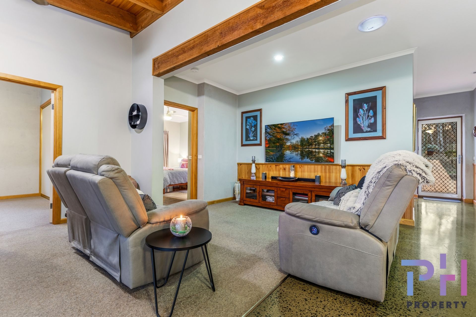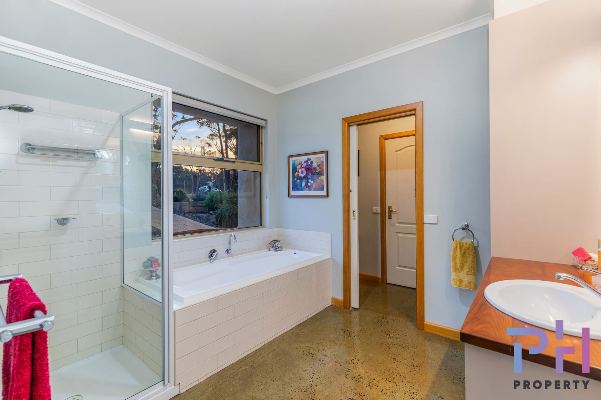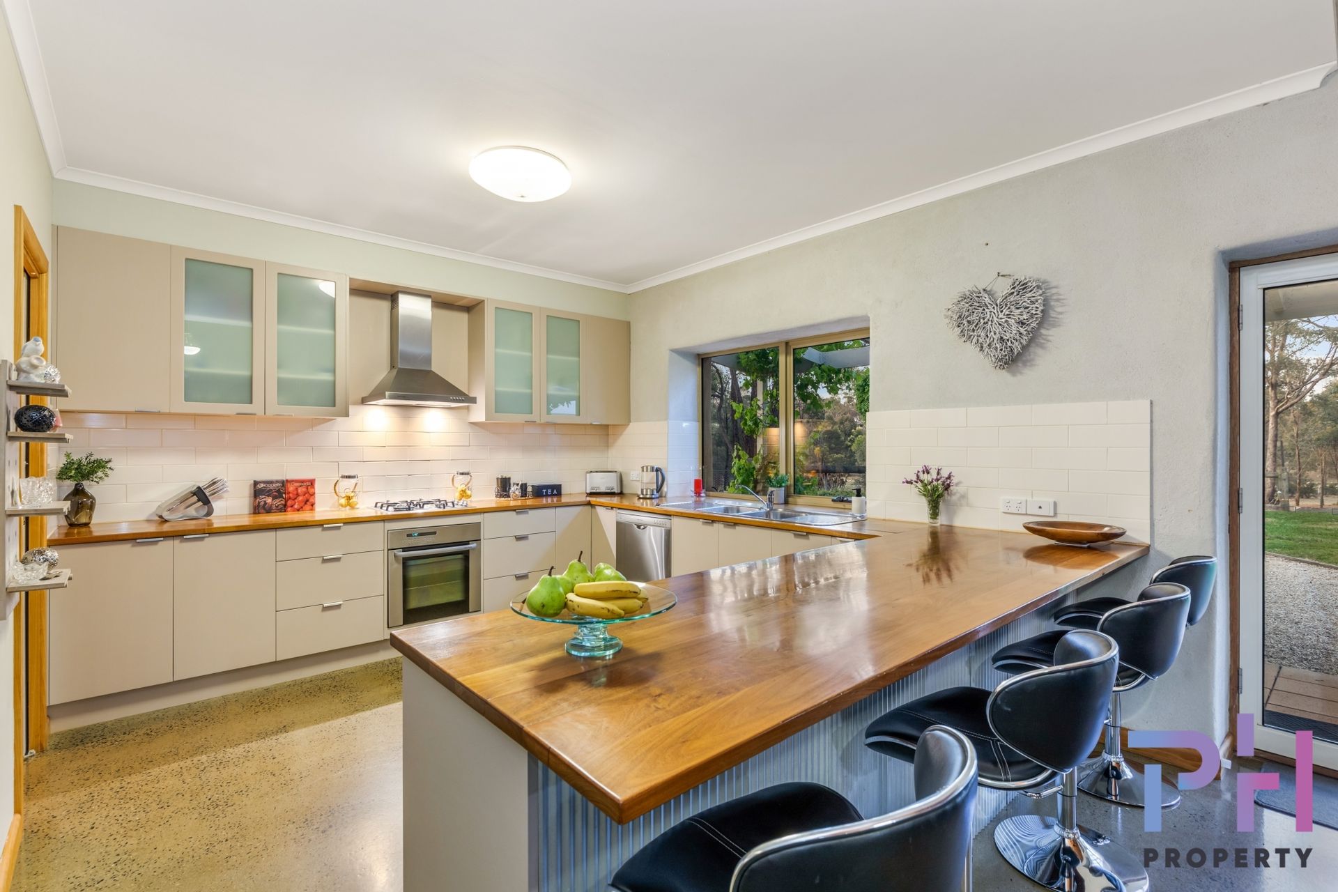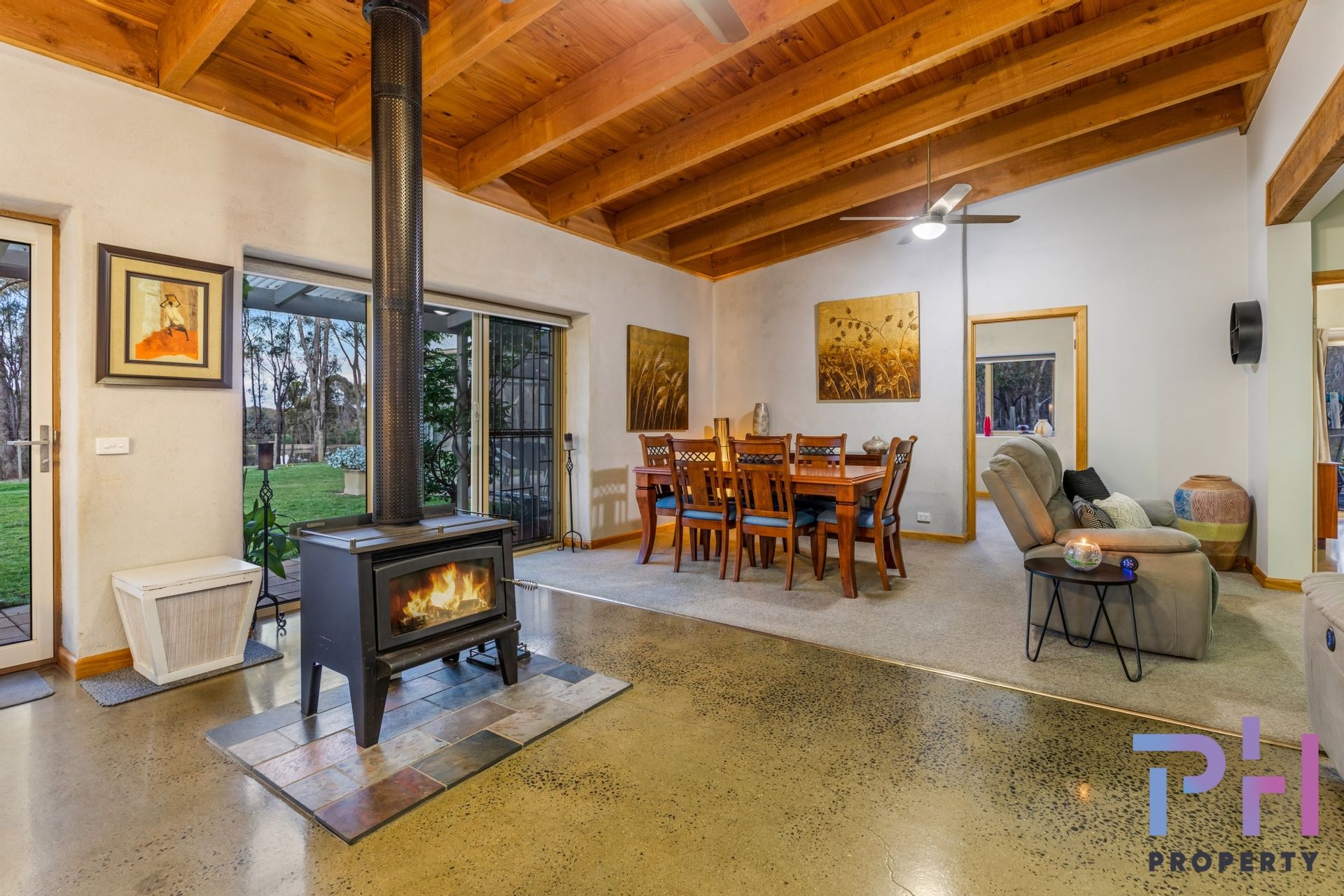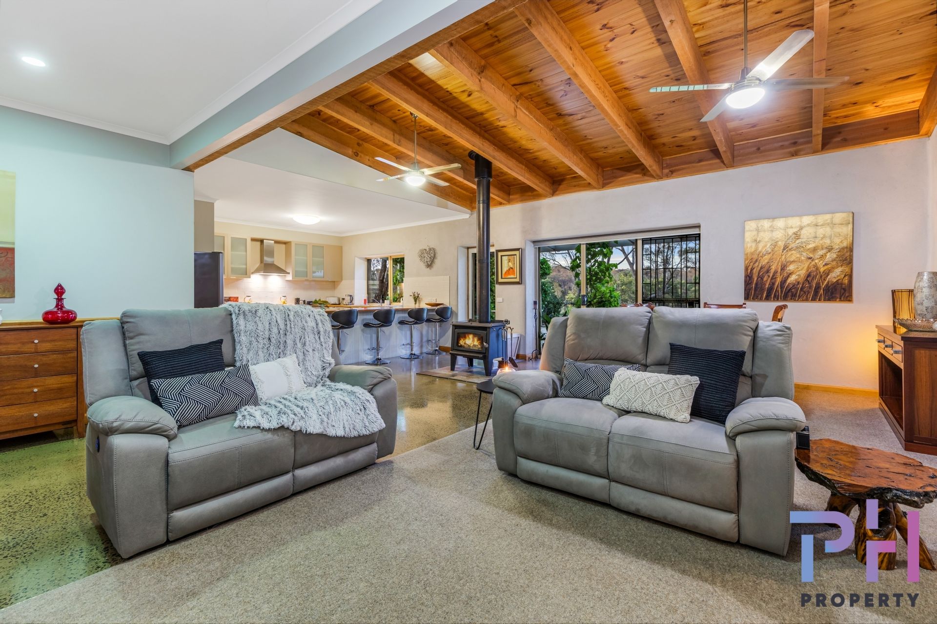 The airy open plan living area features a mix of polished concrete floors and carpet, there are raked ceilings, two ceiling fans, a lovely wood heater and a large reverse-cycle Daikin split-system. The kitchen is very spacious and features extra-wide Blackwood timber bench tops, a dishwasher, double sink, electric oven, gas hot plates and pantry.