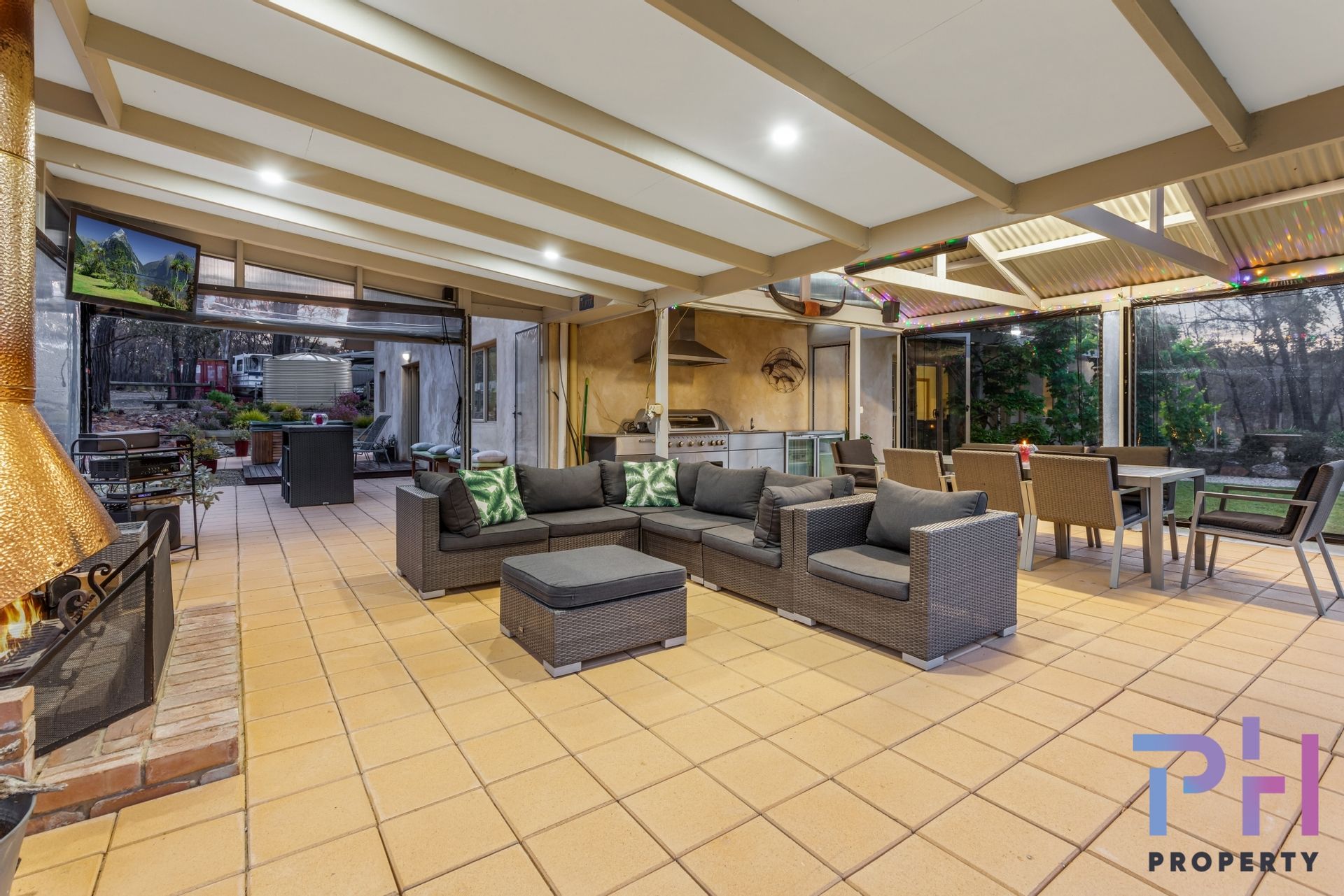 Outside you're spoilt with an exceptionally large entertainment outdoor living area, featuring a large brick fireplace with copper flue, radiant heater, quality cafe blinds and can be used all year-round. There's more than enough space to house a large table, lounge suite and room for the largest of barbecues and fridge. The view of the dam is sensational from here. A waterfall and meandering rock creek has been built beside the outdoor living area showcasing nature in the winter months.