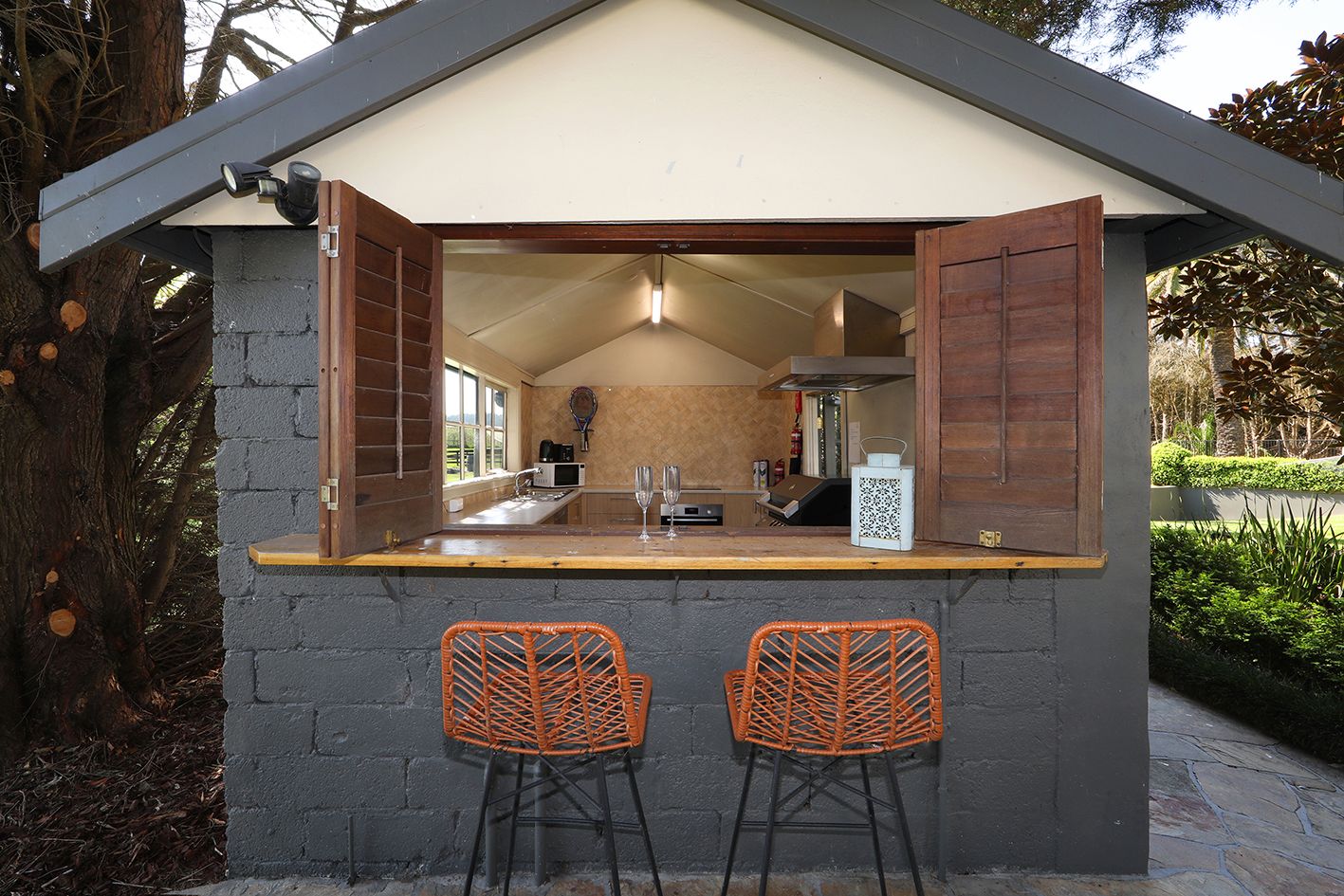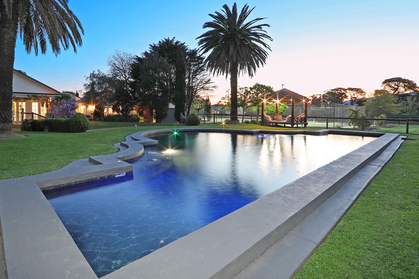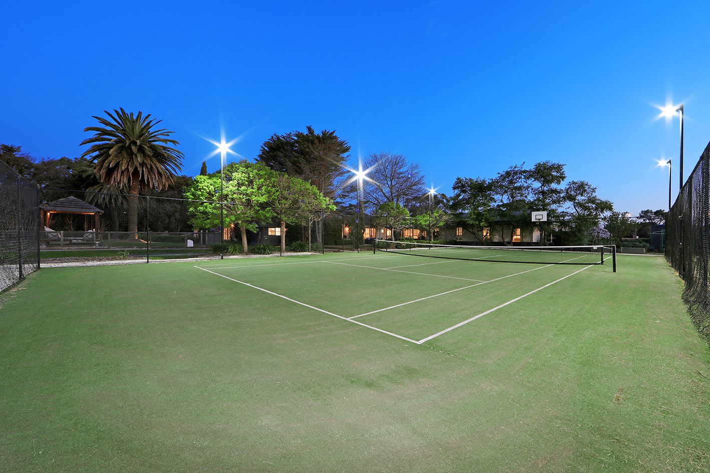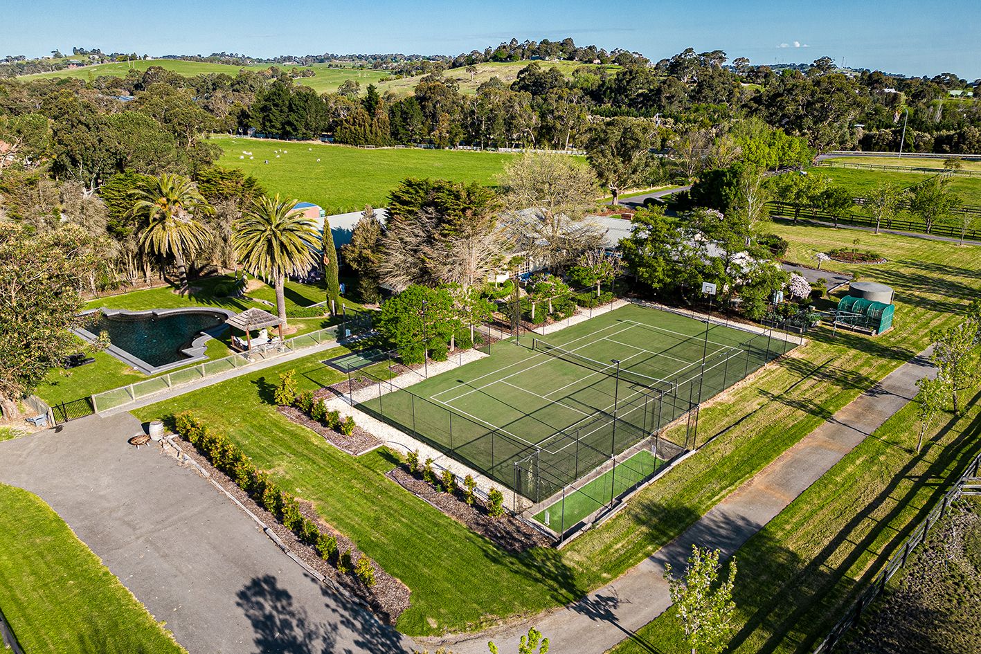 A resort-sized pool beckons for fun in the sun or invigorating laps, a fully enclosed BBQ Cabana invites easy outdoor dining and a floodlit tennis court, in-ground trampoline, and cricket nets cater to the sporting enthusiast.