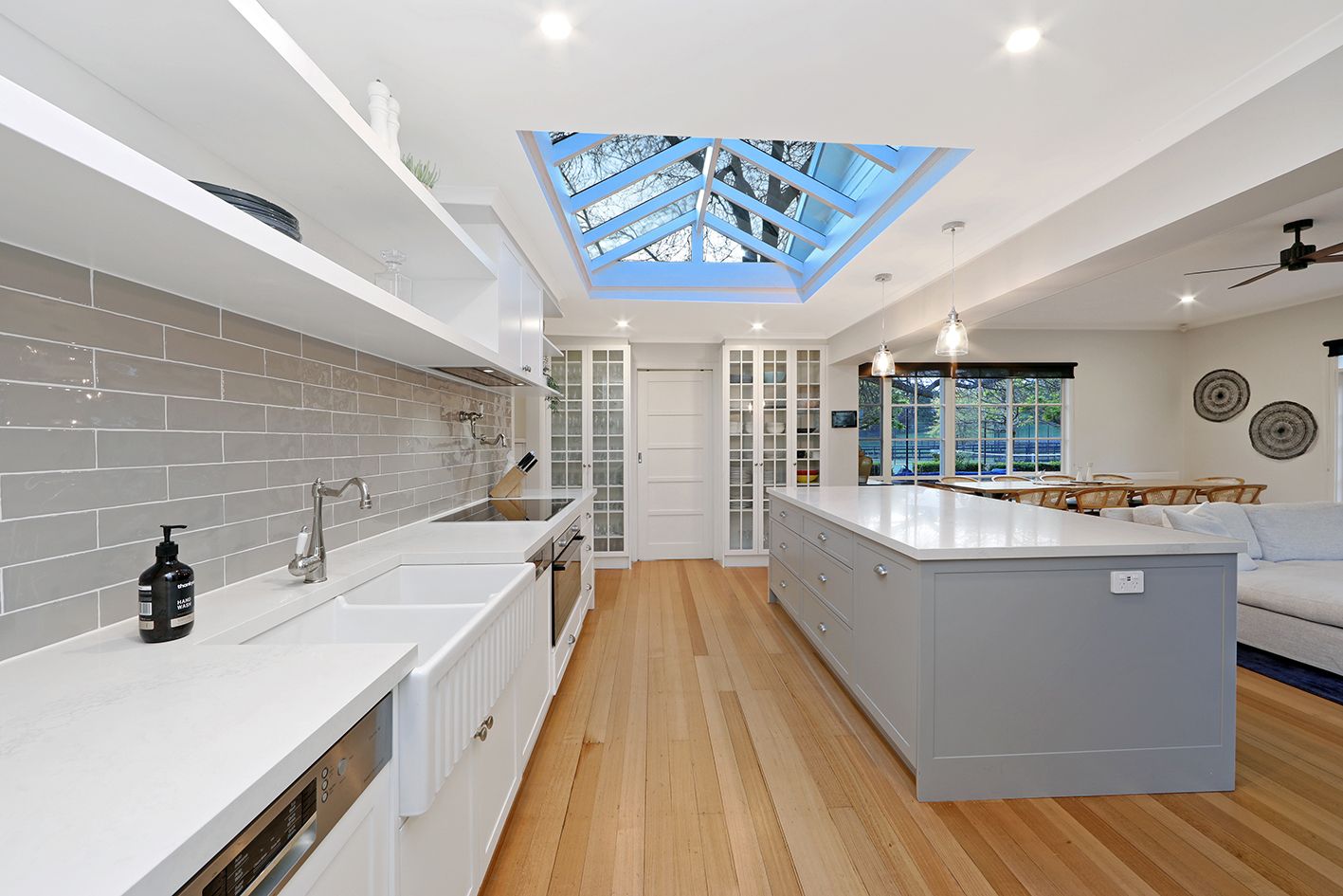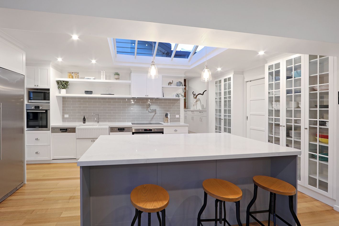 The heart of the home embraces a stunning central kitchen under a dazzling skylight feature ceiling, a chef's dream, equipped with a full suite of quality appliances, stone countertops and spacious butler's pantry.