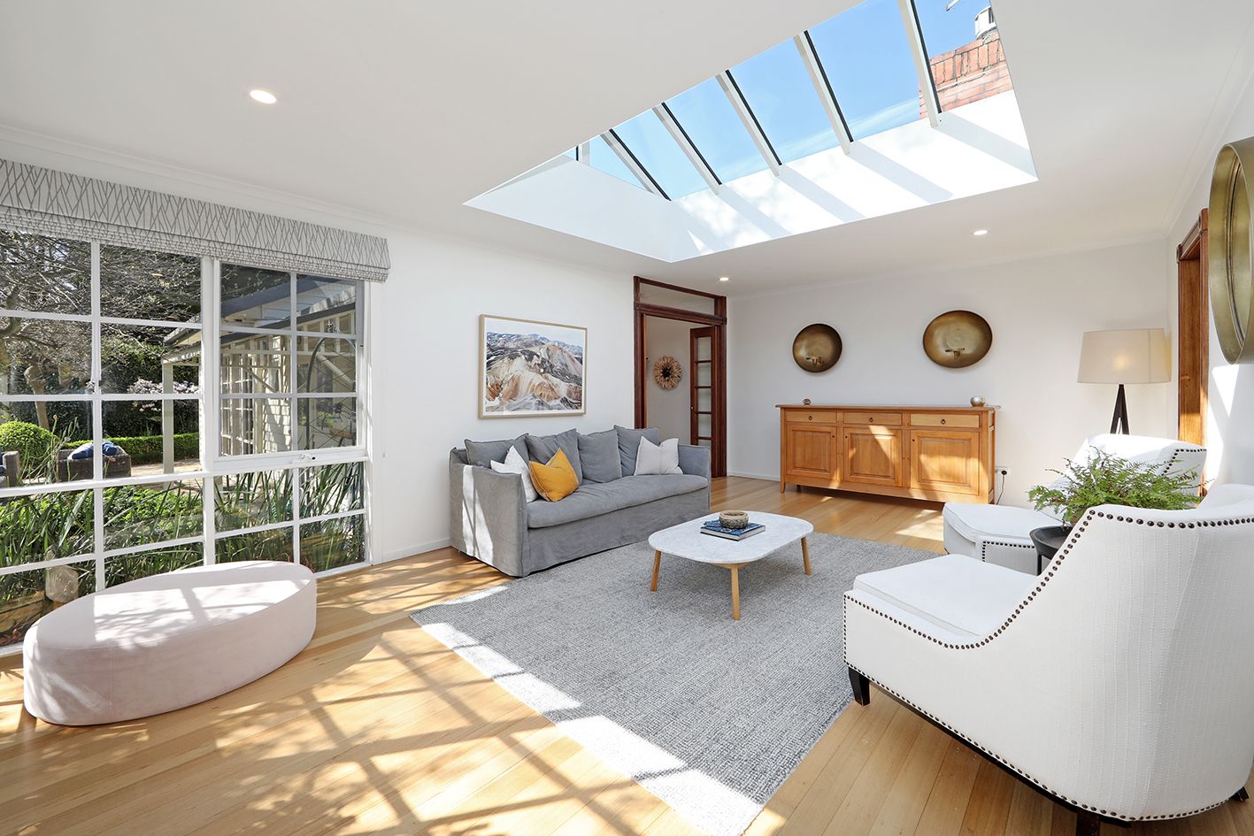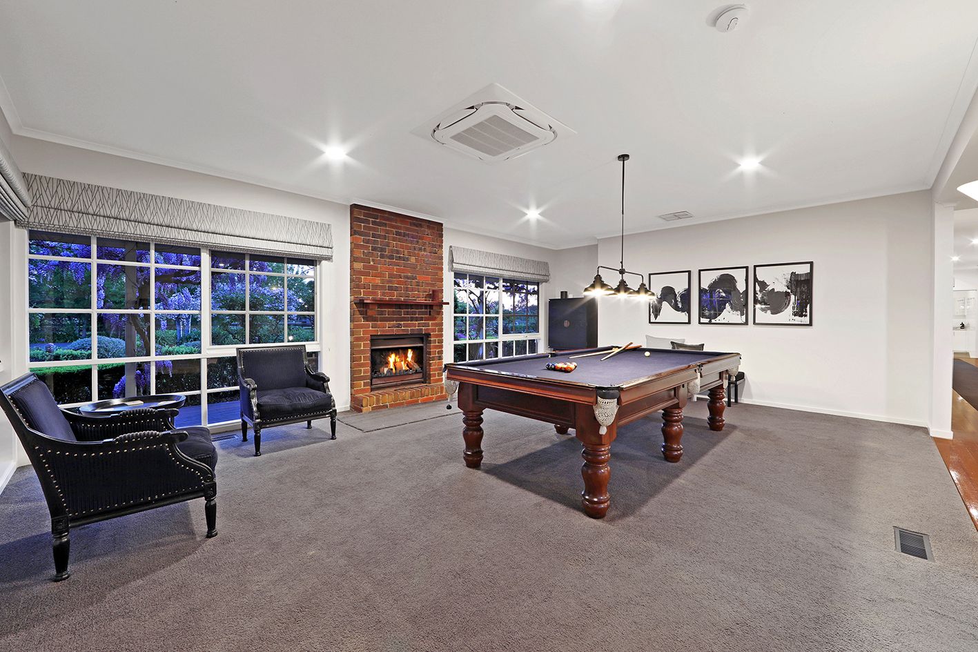 Entertain in style across four distinct living zones: a sunlit lounge area beneath a spectacular skylight ceiling, a cozy billiard room, a casual family living zone drenched in sunlight and an expansive rumpus/function room with a wall of French doors opening out to a picturesque poolside garden terrace.