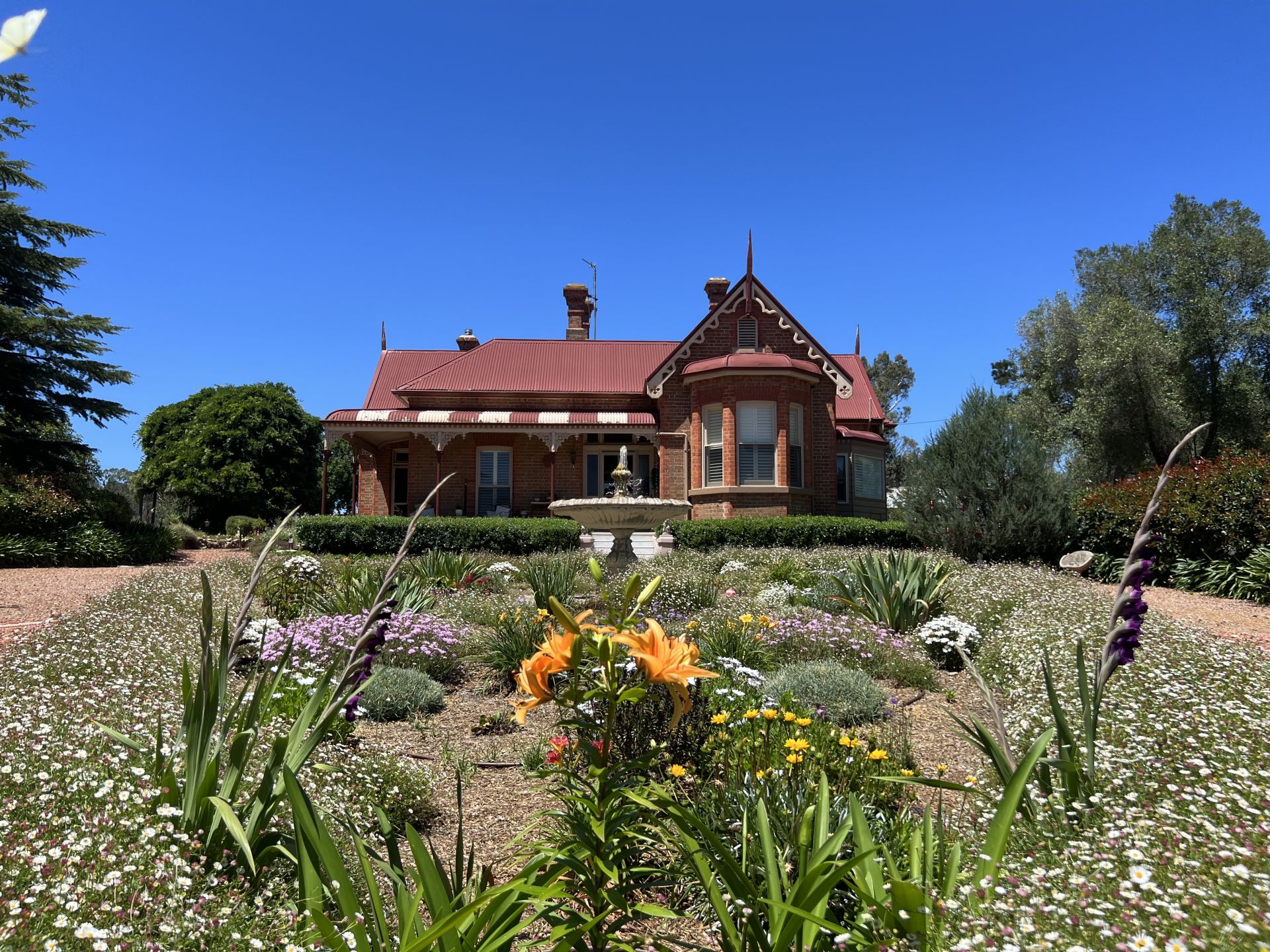 Enter the property via a classic stone entry wall, drive along the elm-tree lined driveway, and approach the stunning water fountain set within a circular garden in front of the historic homestead.