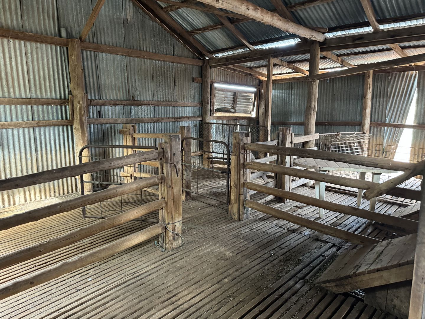 Attached to Woolshed. Good Sheep Yards constructed of steel pipe, w-strap comprising a drenching race, loading ramp through the shed, a bugle three 3 way drafting race and dust suppression sprinklers. Approximate capacity of 3,000 head.