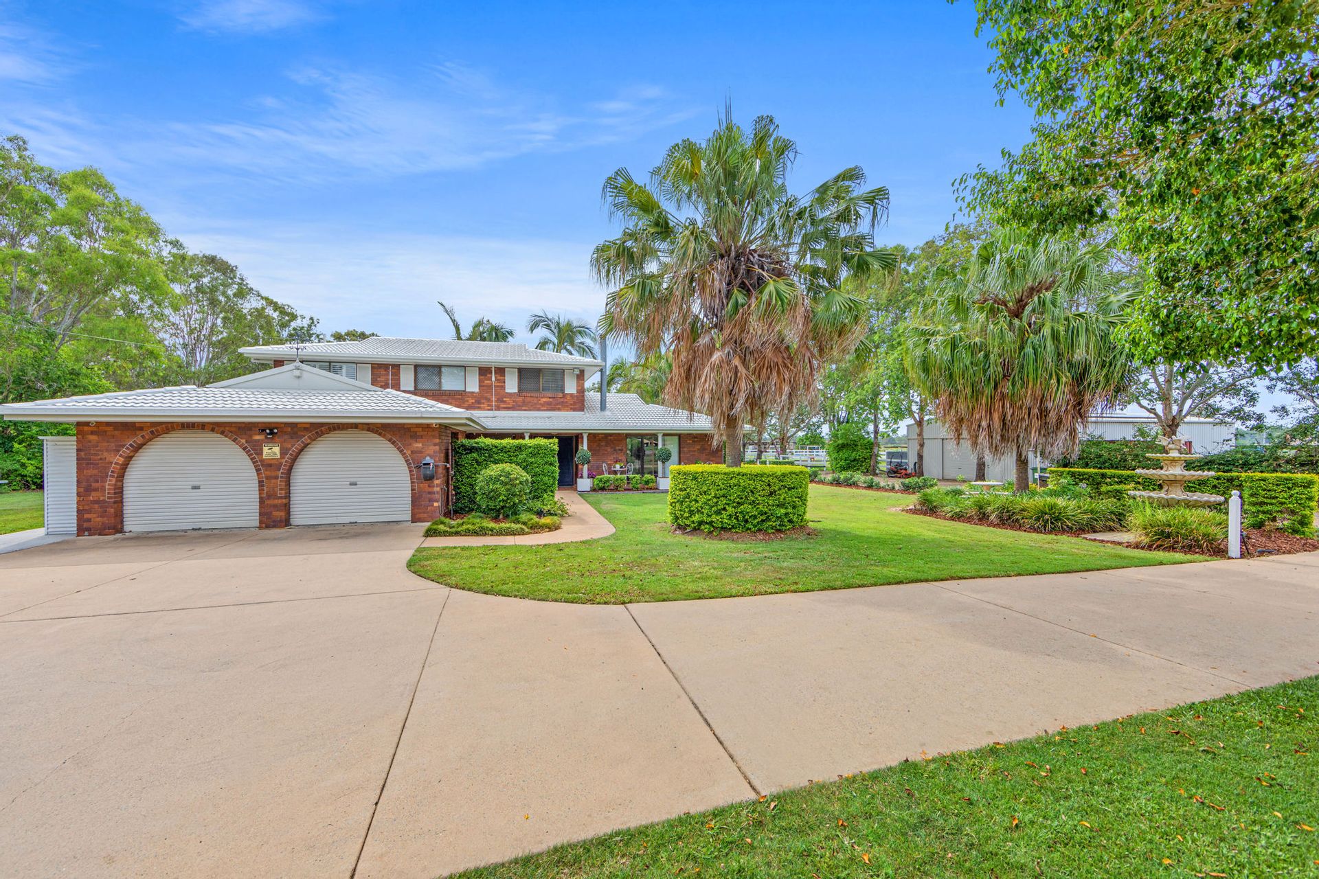 •Dual driveway access leads to well-maintained gardens and water features.