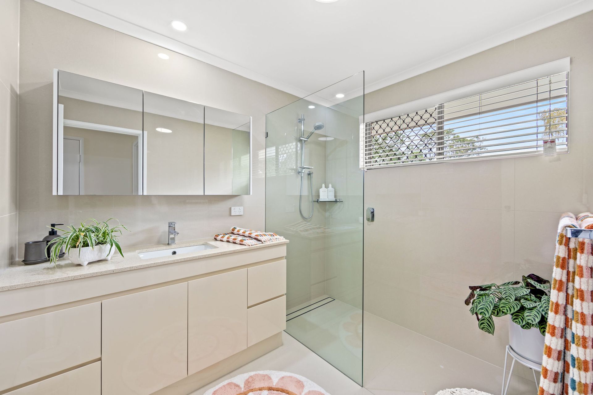 •The downstairs/guest bathroom features luxury touches like a Caesar stone bench top and above-counter basin.