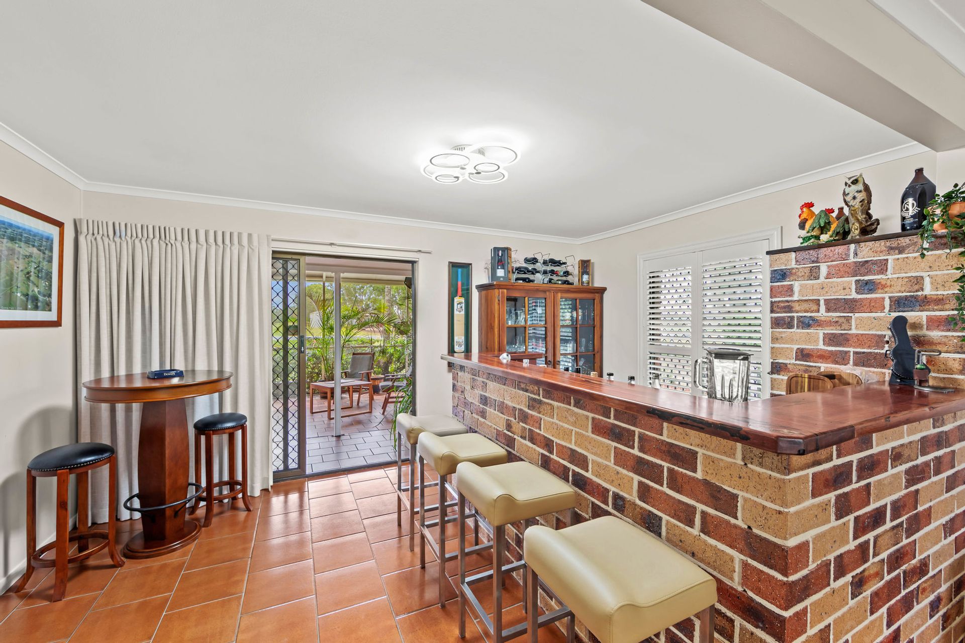•Relax at the built-in brick bar with hardwood benchtops.